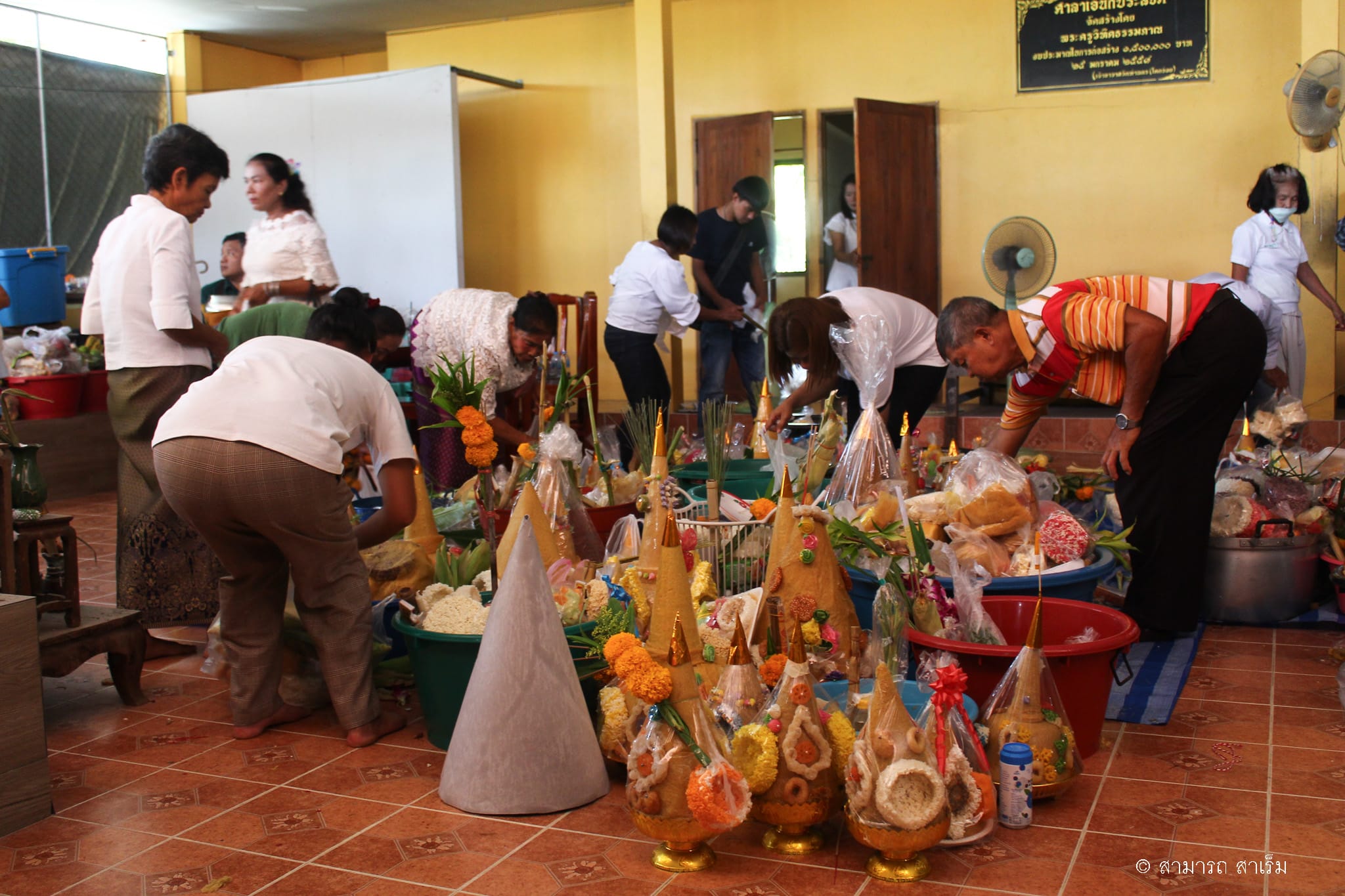 ๔. “ห่อขนม” นำขนมสี่อย่างข้างต้นห่อด้วยขนมลา แต่ละคนที่ไปร่วมทำบุญจะทำมาคนละหนึ่งห่อ ครอบครัวคุณยายบุญเทิ่ม จุลมาศ มากันสี่คน แต่เนื่องจากคุณตาสามีคุณยายเดินไม่สะดวก จึงทำมาแค่สามห่อ ขนมที่ห่อมานี้จะนำไปตั้งนอกวัดเพื่ออุทิศผลบุญให้กับบรรพบุรุษที่ไม่สามารถเข้ามาบริเวณวัดได้ บางครอบครัวจะตั้งอาหาร ผลไม้ น้ำ ด้วยก็ได้