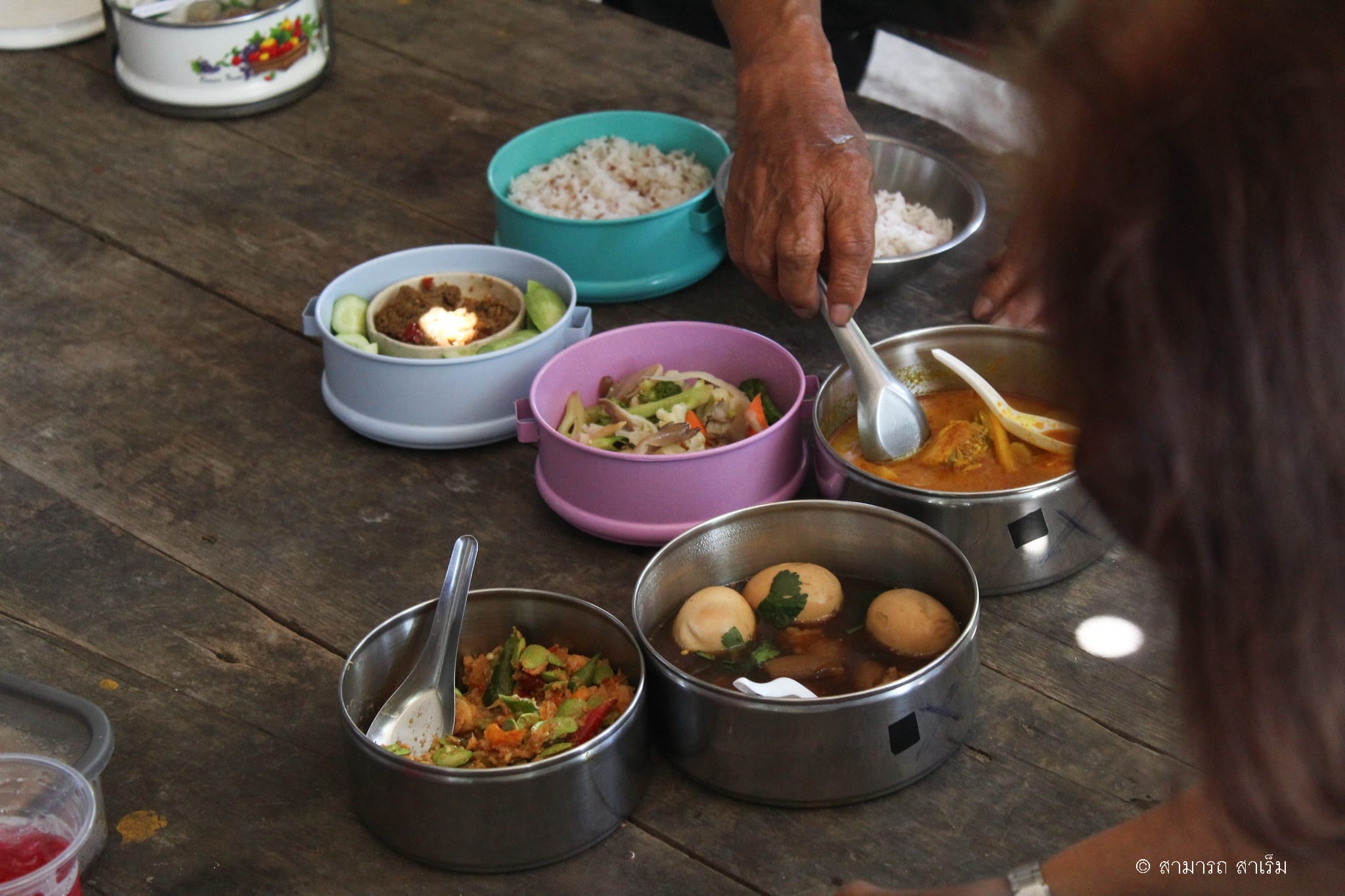 ๑. “ยกชั้น” คือ การหุงข้าว ทำอาหารแล้วจัดใส่ปิ่นโตไปทำบุญที่วัด โดยไม่ได้มีคติว่าต้องทำเมนูไหนเป็นพิเศษ ขึ้นอยู่กับความพร้อมของแต่ละครอบครัว วันนี้บ้านคุณยายทำ กุ้งผัดสะตอ หมูทอด ขนมหวานที่ซื้อมาจากตลาด เมื่อมาถึงวัดชาวบ้านจะนำมาตั้งไว้บริเวณด้านหน้า ที่พระสงฆ์นั่งทำพิธีสวดมนต์
