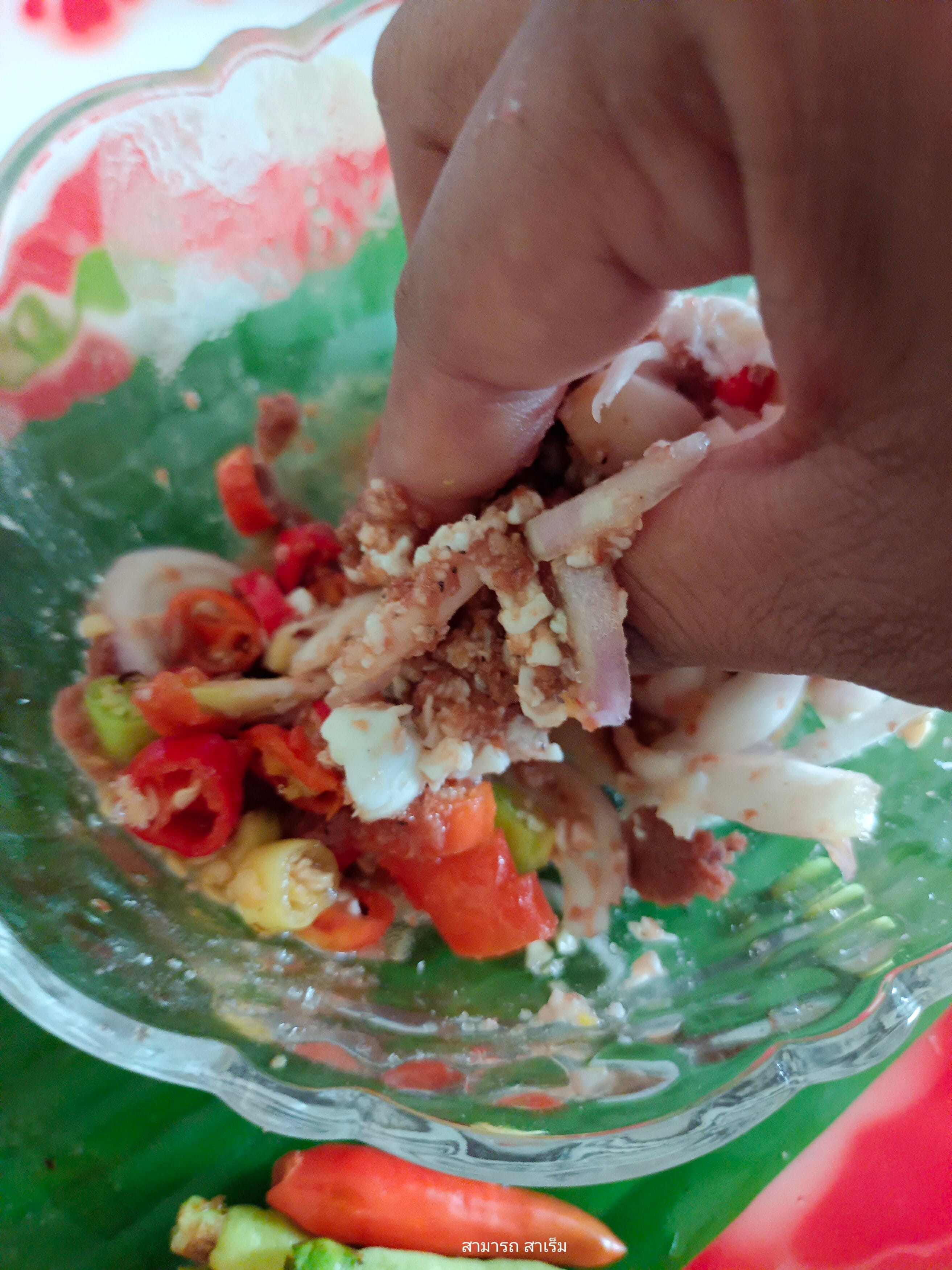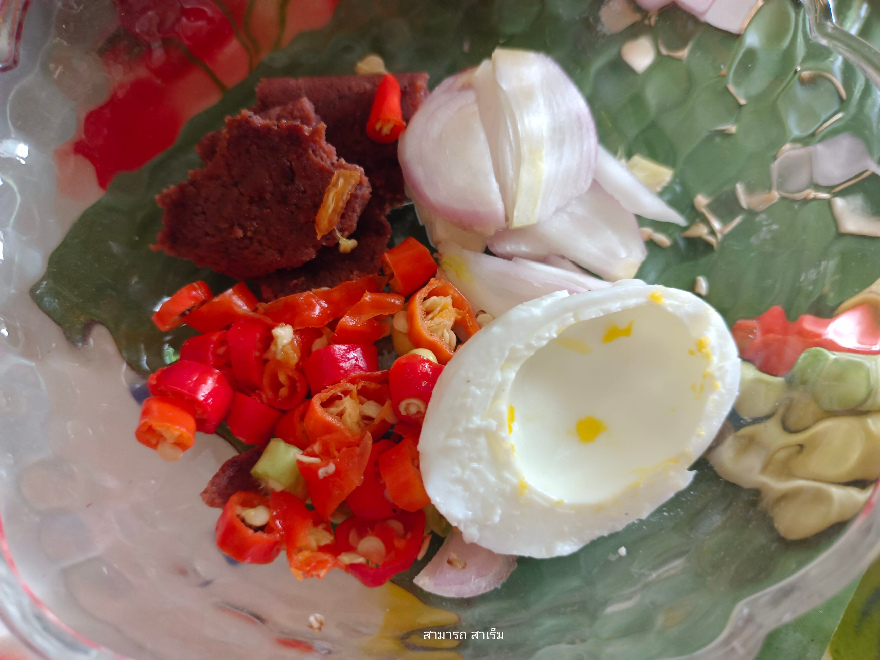 วิธีทำ ซอยหอมแดง ซอยพริกสด กะปิหมก ไข่ขาวต้ม น้ำมะขามเปียก น้ำตาลทราย และเกลือ ใส่ภาชนะเดียวกัน แล้วบีบให้ผสมรวมกัน ปรุงรสให้ เปรี้ยว หวาน เค็ม ตามความชอบ ทำง่าย ๆ นิยมกินกับปลาแห้งย่าง คลุกข้าวสวยร้อน ๆ