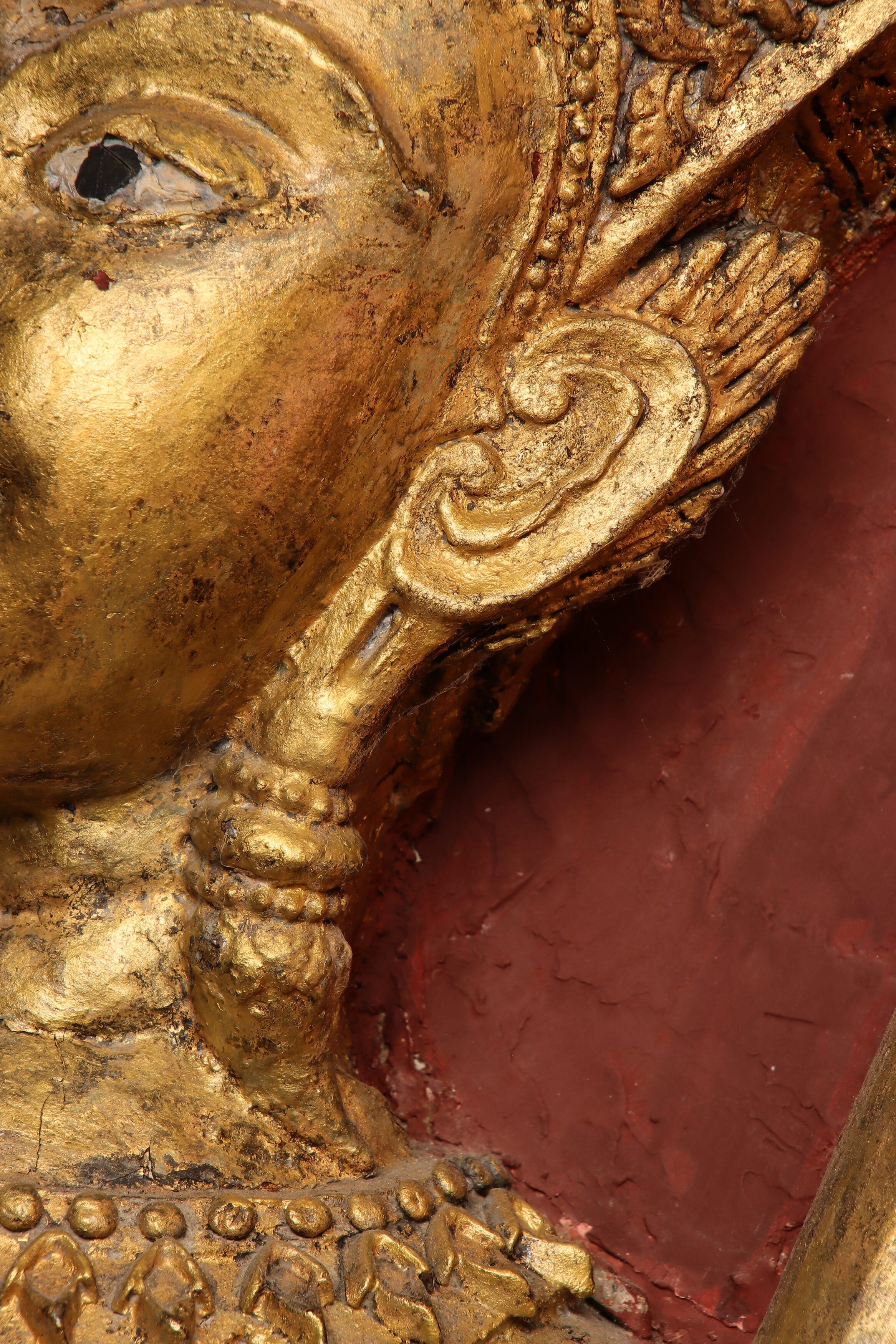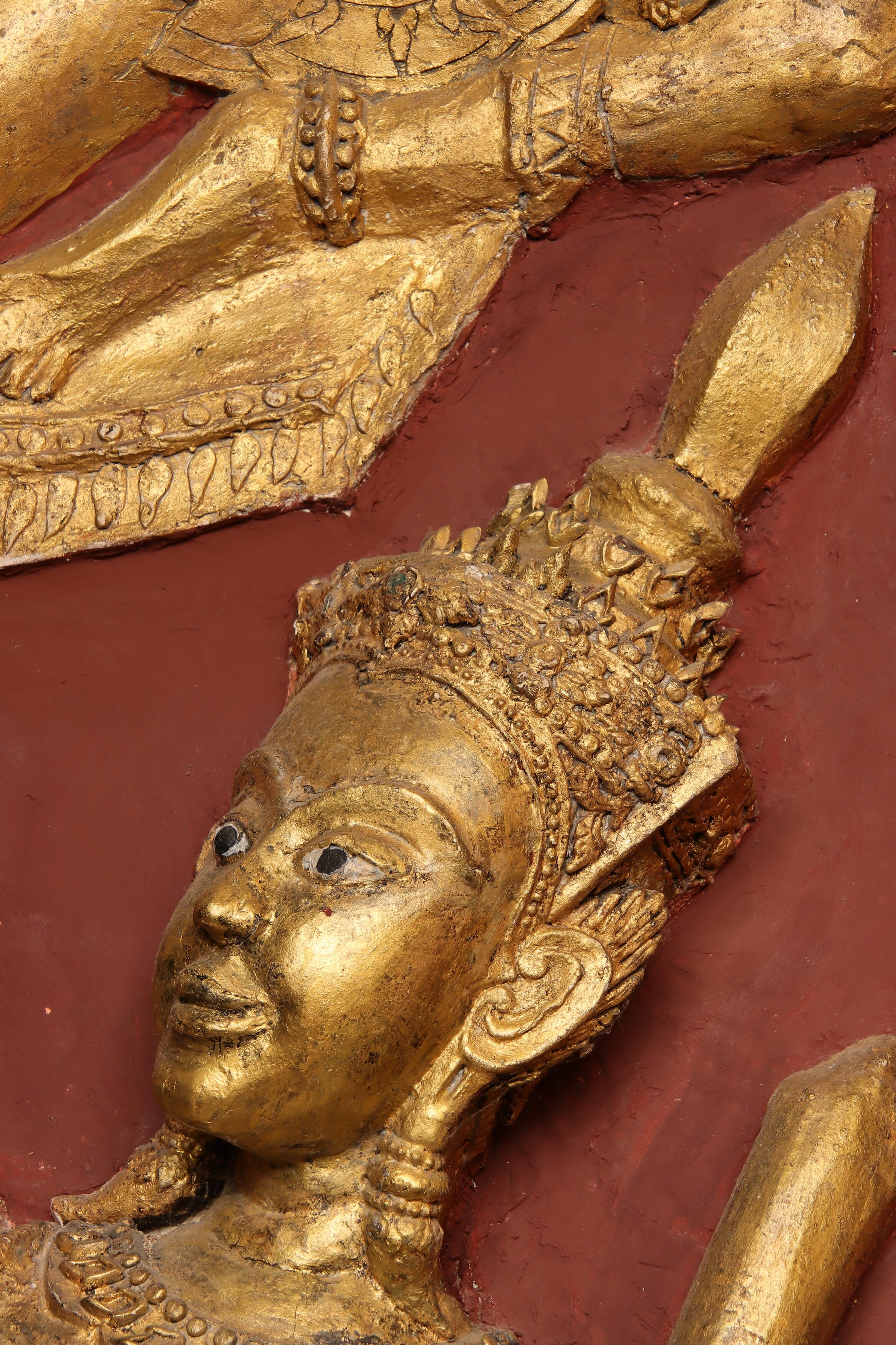 อย่างไรก็ตามแม้ประติมากรจะแสดงใบหน้าพญามารแบบเทพบุตร แต่ก็ยังเลือกใช้องค์ประกอบเครื่องทรงแบบอสูรตามมาตรฐานศิลปะในลุ่มน้ำเจ้าพระยาอยู่ดี คือแสดงครีพหูแบบอสูรแทนที่จะใช้กรรเจียกจรอย่างเทวดาแม้จะสวมชฏาก็ตาม ซึ่งขนบการใช้ครีพหูกับอสูรเช่นนี้ก็ยังปรากฏสืบมาถึงจิตรกรรมในสมัยรัตนโกสินทร์ พญามารสวมเกราะ ถือตระบอง มือหนึ่งยอขึ้นห้าม มือหนึ่งกระชับกระบองแนบเอวนี้ยังเป็นคอมโพสมาตรฐานของพญามารอันมีตัวอย่างในยุคสมัยใกล้เคียงกันนี้ที่จิตรกรรมวัดช่องนนทรี