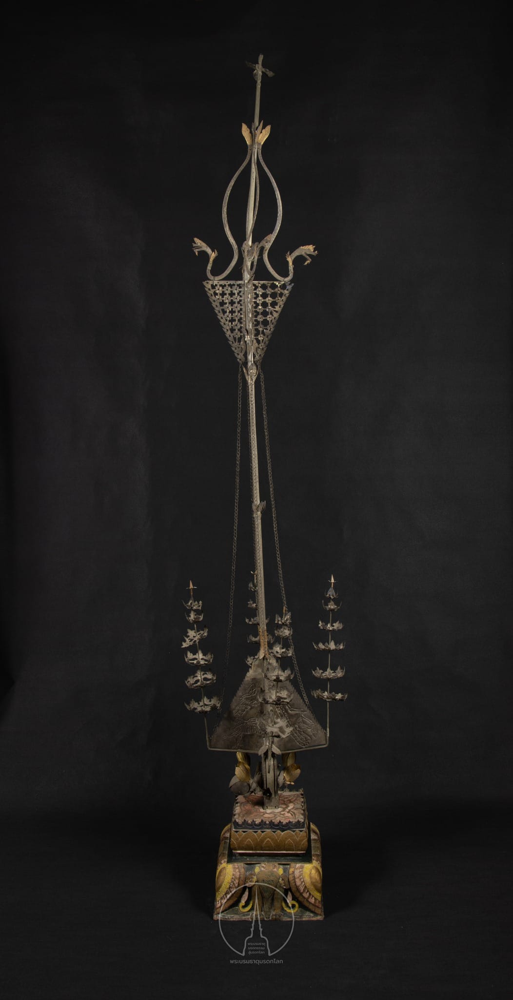 อันว่าบุคคลผู้ใดแลกระทำลงรักปิดทอง กายบุคคลผู้นั้นแล้วไปด้วยทอง แลบุคคลผู้นั้นมิได้ไปบังเกิดในตระกูลเข็ญใจย่อมจะไปบังเกิดในตระกูลทั้งสอง คือตระกูลกระษัตริย์ แลพราหมณ์มหาศาล มีทรัพย์เป็นอันมากด้วยผลานิสงส์ลงรักปิดทองเสาธง