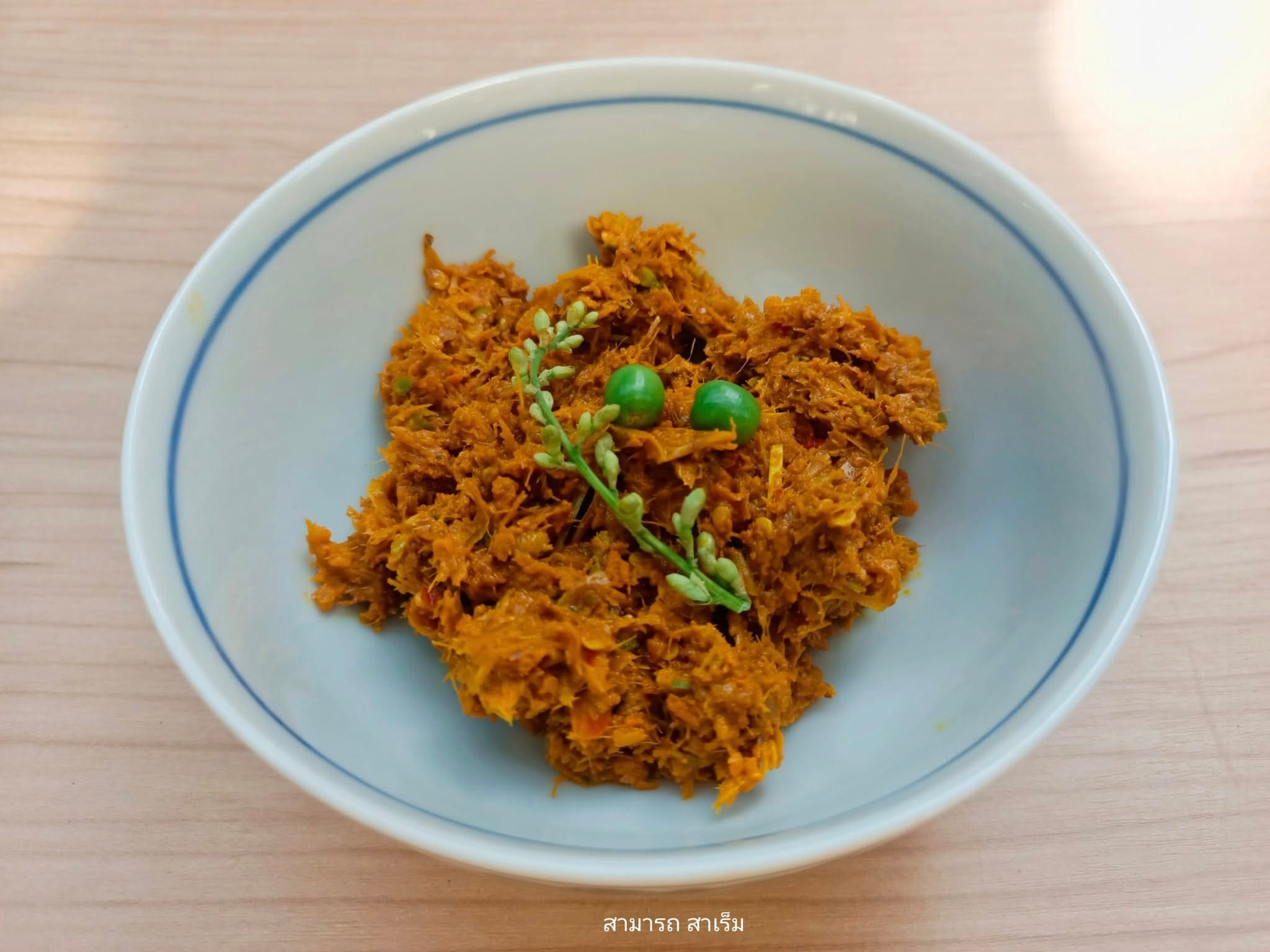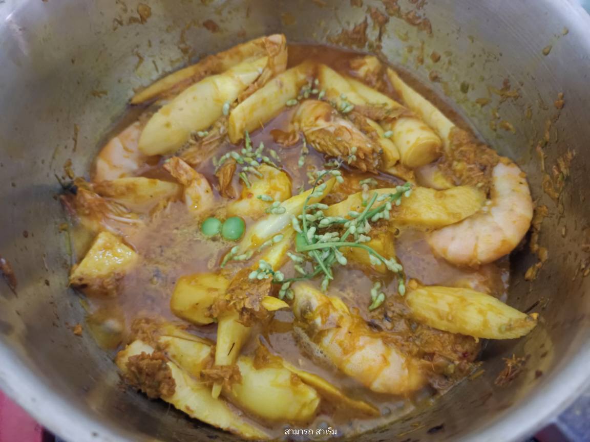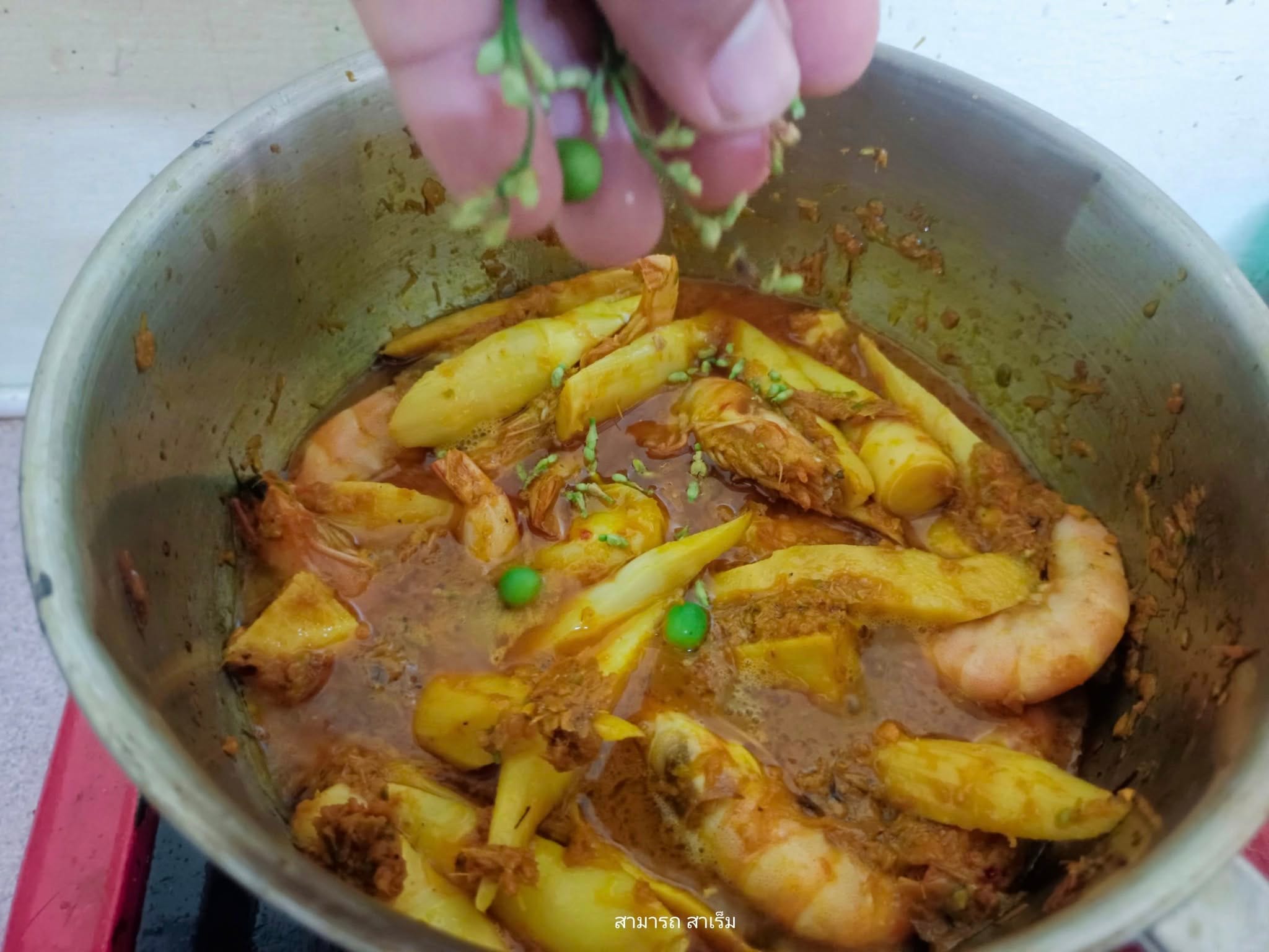 ตำส่วนผสมทุกอย่างรวมกัน สีของเครื่องแกงผัดเผ็ดครกนี้ สวยกว่าใส่พริกไทย เพราะปกติจะมีสีดำจากพริกไทยผสมอยู่ หลังจากนั้นผมตั้งน้ำมันให้ร้อน ตักเครื่องแกงลงไปผัดให้สุก มีกลิ่นหอมฟุ้งขึ้นมาจากกระทะ เข้าจมูก ทำให้รู้สึกสดชื่น ใส่กุ้งลงไปซึ่งผมตัดหนวด ตัดหางออก แต่ไม่ปอกเปลือก ผัดให้ผสมกับเครื่องแกง เมื่อกุ้งใกล้สุกก็ใส่หน่อไม้ ดอกข่าและลูกข่าตามลงไปด้วย เติมน้ำเปล่าเล็กน้อย ผัดไปเรื่อยๆ สังเกตว่ากุ้งสุกตามมารตฐานที่ตัวเองชอบแล้ว ชิมรสดูพบว่ายังจืดไปหน่อย จึงใส่เกลือหวาน(ฆาแรมานิ) จากปัตตานีลงไปเพิ่มรสชาติ ชิมดูอีกครั้ง ได้รสตามชอบแล้วก็ทำการปิดเตาแก๊ส ได้ผัดเผ็ดกุ้ง ที่มีสีสันแปลกตากว่าทุกครั้งที่ทำมา เนื่องจากไม่มีสีดำของพริกไทยผสมอยู่นั่นเอง รสชาติก็มีความแปลกใหม่เช่นกัน อาหารมือเช้าวันนี้จึงกินไปสองจานใหญ่หรือที่เรียกแบบคนบ้านควนบ้านผมว่า “กินชามมอ” หมายถึง กินข้าวจานพูนสูงเหมือนภูเขา หรือ “กินมาก” นั่นเองครับ