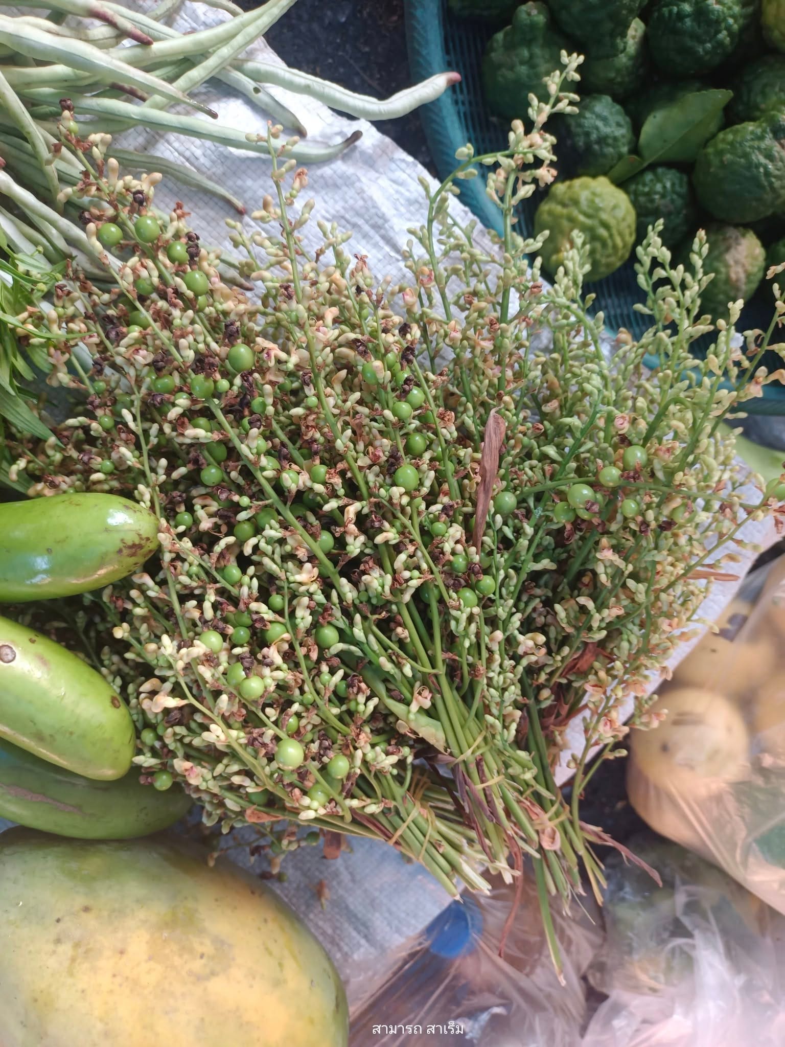 ถัดมาสี่ร้านเจอคุณยาย ขายผักพื้นบ้านหลายชนิดมองดูเพลินดี แต่ผมสะดุดกับ “ดอกข่า” ที่มีลูกรวมอยู่ด้วย ราคาขายมัดละ 10 บาท ดอกข่ากับลูกข่า ที่ผมพูดถึงอยู่นี้ เป็นข่าที่มีชื่อเรียกว่า “ข่าเล็ก” หรือ “ข่าป่า” ซึ่งมีขนาดของลำต้น และหัว เล็กกว่า “ข่าตาแดง” ที่เรารู้จักกันทั่วไป เป็นอย่างมาก และกลิ่นจะมีความฉุนมากกว่าข่าตาแดงด้วยครับ
