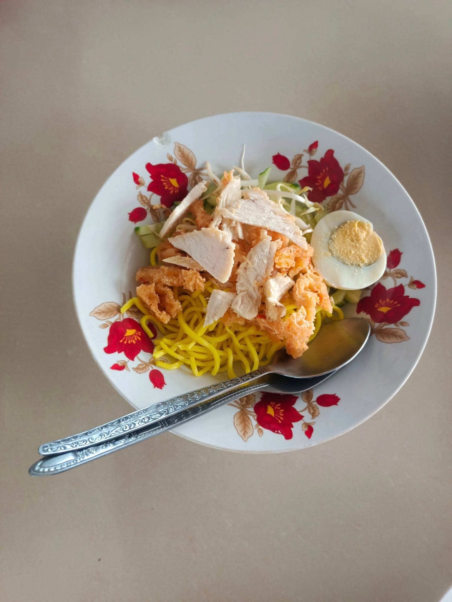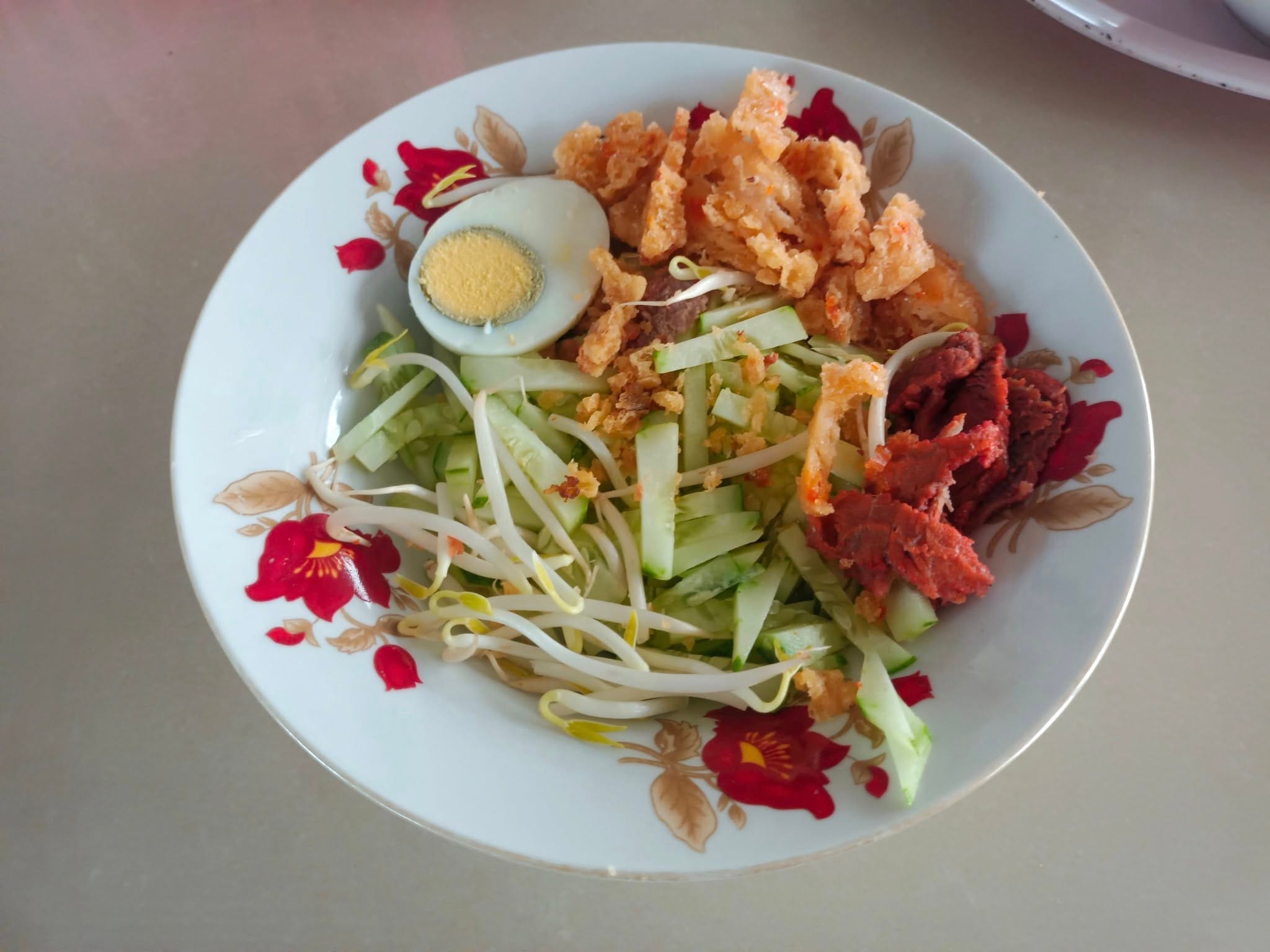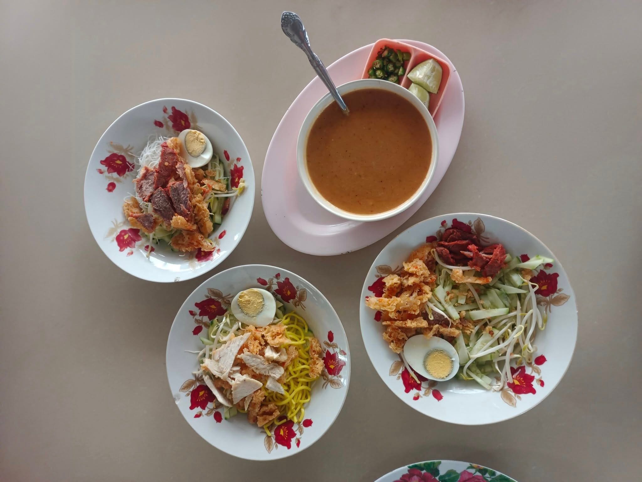 เมาะห์คอดีย๊ะให้ข้อมูลว่า หมี่เหลืองกับหมี่ขาวเพิ่งมีในตอนหลัง ลูกค้าบางคนในบ้านควนเองจะไม่ใส่ยังคงนิยมรับประทานแบบดั้งเดิมที่ไม่มีเส้นหมี่เหลืองกับหมี่ขาว สอดคล้องกับที่ครู ศมานนท์ พฤกษ์พิเนต ปราชญ์ของเมืองสตูล ผู้ก่อตั้งกลุ่มประวัติศาสตร์สตูล เคยบอกเล่าข้อมูลกับผมเกี่ยวกับอาหารจานนี้ว่า “…การใส่เส้นหมี่เหลืองเป็นสิ่งเพิ่มเติมเอาเองในท้องถิ่นเพรากลัวไม่อิ่ม เมื่อก่อนใส่แต่เส้นหมี่เหลือง เพิ่งมาใส่เส้นหมี่ขาวราวสัก 20-30 ปีนี้เอง…”