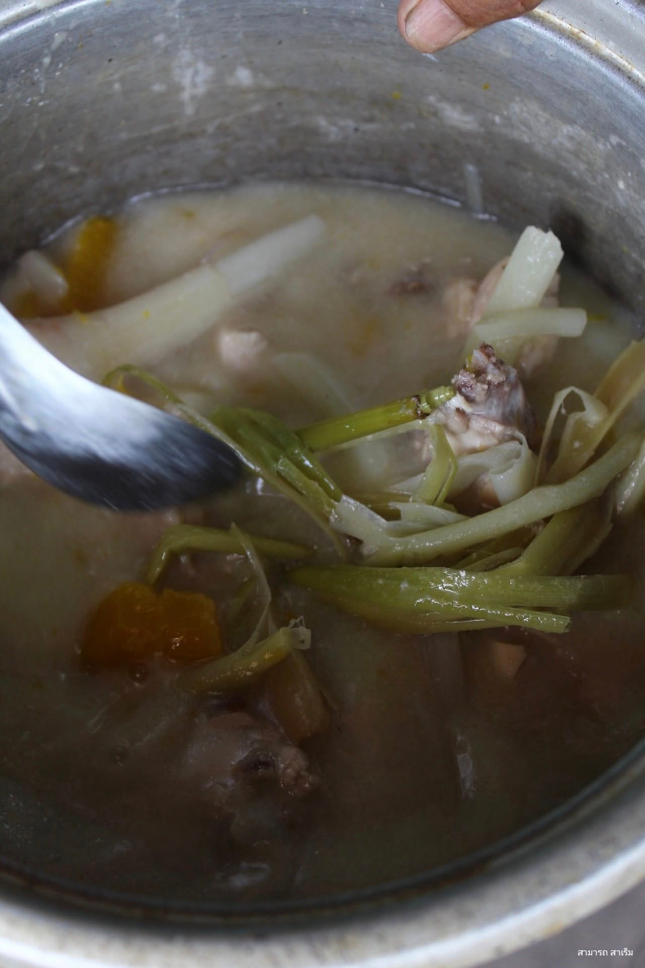 นอกจากจะได้ความรู้เรื่องขนมจีนแล้ว ก๊ะย๊ะยังใจดีทำอาหารมื้อเที่ยงและชวนผมกินด้วย อาหารชนิดนี้คือ “ซาหยอกไก่” ที่ใส่ หยวกข่า (ต้นขาวอ่อน)กับน้ำเต้า (ฟักทอง) คำว่า “ซาหยอก” ของคนที่นี่จะเรียกต้มกะทิที่เน้นผักเป็นหลัก ซึ่งมีทั้ง “ซาหยอกไข่” และ “ซาหยอกปลาโอ” แกงกับผักต่าง ๆ คำนี้เป็นสำเนียงมลายูสตูล (?) (อูรังมลายูที่นครศรีธรรมราชก็เรียก “ซาหยอก” เช่นกัน) ซึ่งเป็นรากคำเดียวกับภาษามลายูกลางที่เรียกว่า “sayur” (เมนูผักต่าง ๆ) หรือมลายูปาตานี (นายู) เรียกว่า “ซาโย” (?)