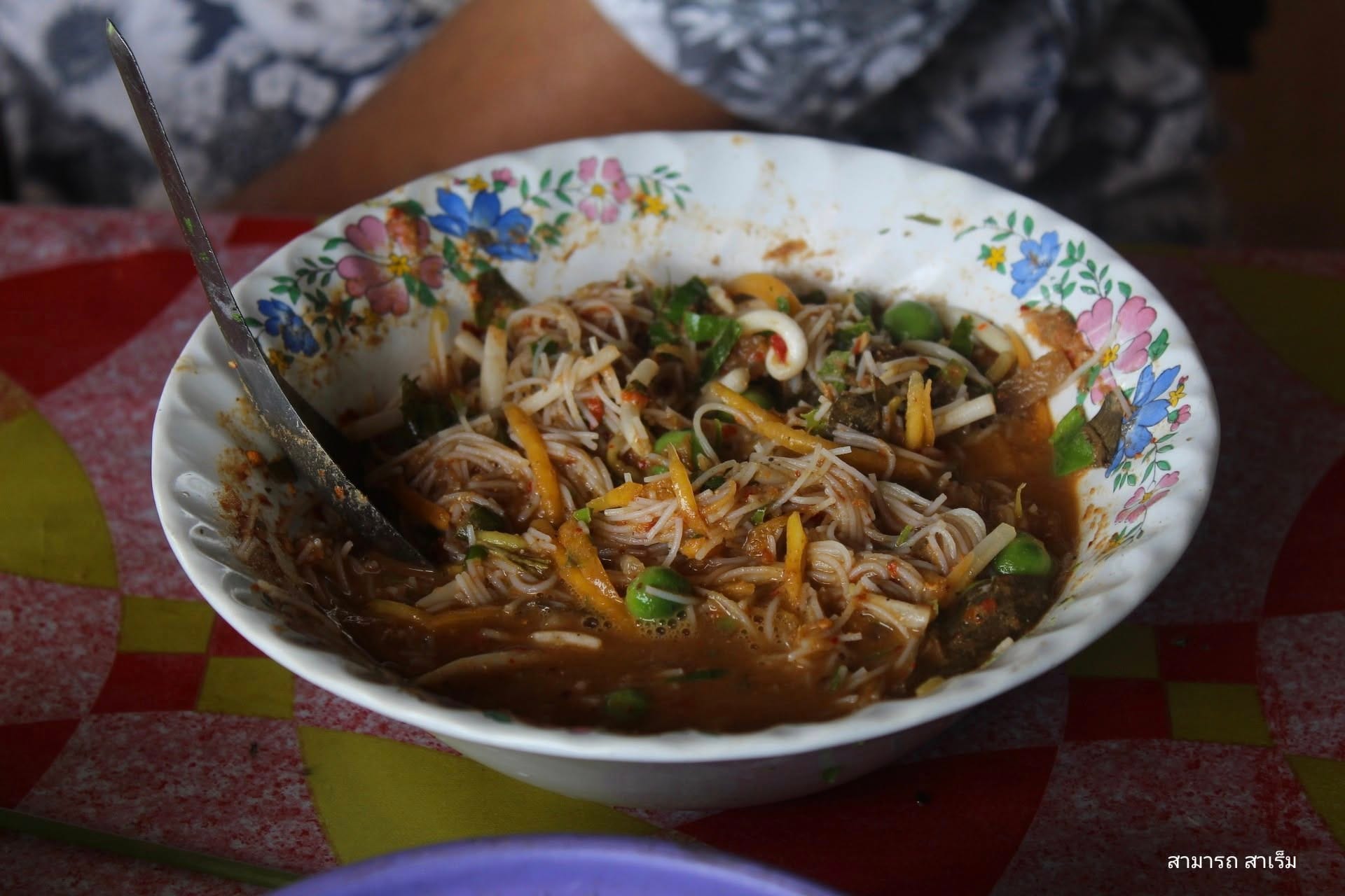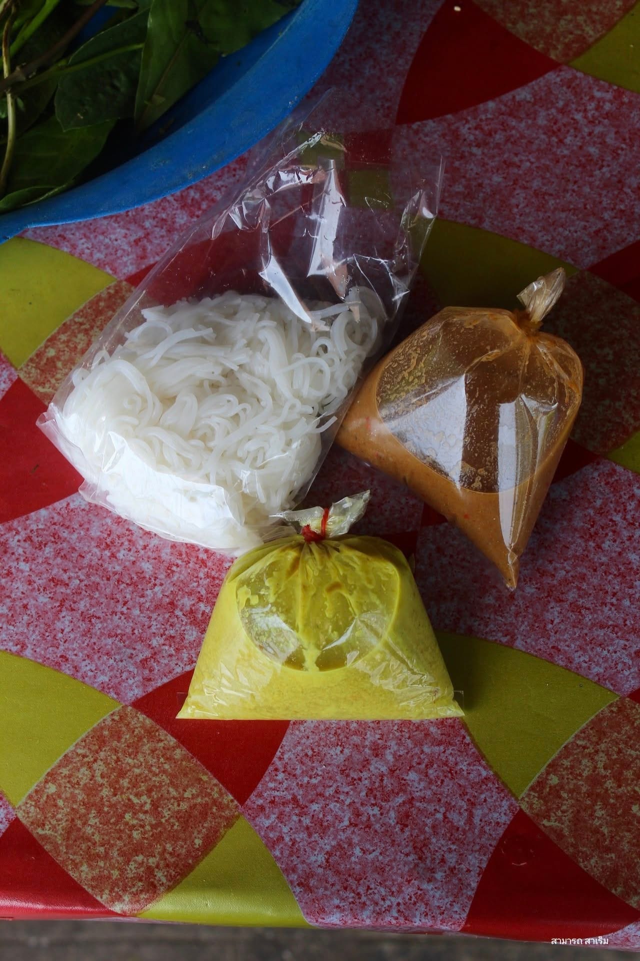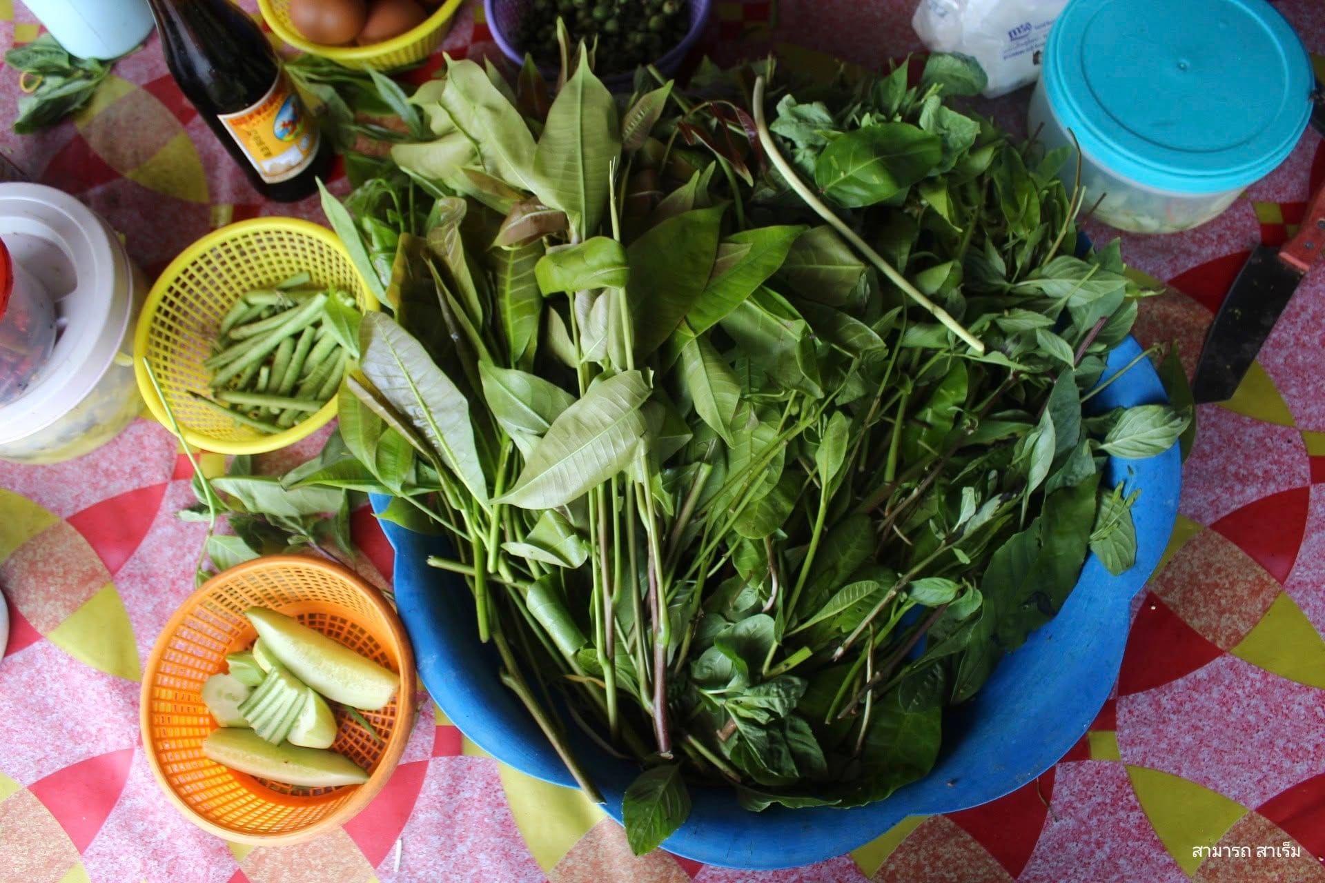 “ผักสด” มียอดเพกา, ใบยาร่วง (มะม่วงหิมพานต์), ยอดจิก, โหระพา, ยอดมันปู, แตงเบา (แตงกวา), ถั่วฝักยาว, มะเขือลาหนา (มะเขือพวง), ถั่วงอก,มะละกอขูดเป็นเส้น