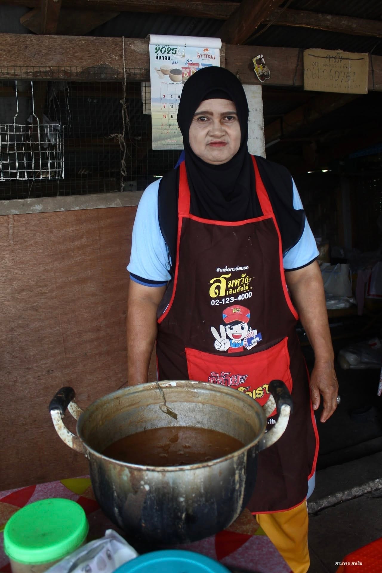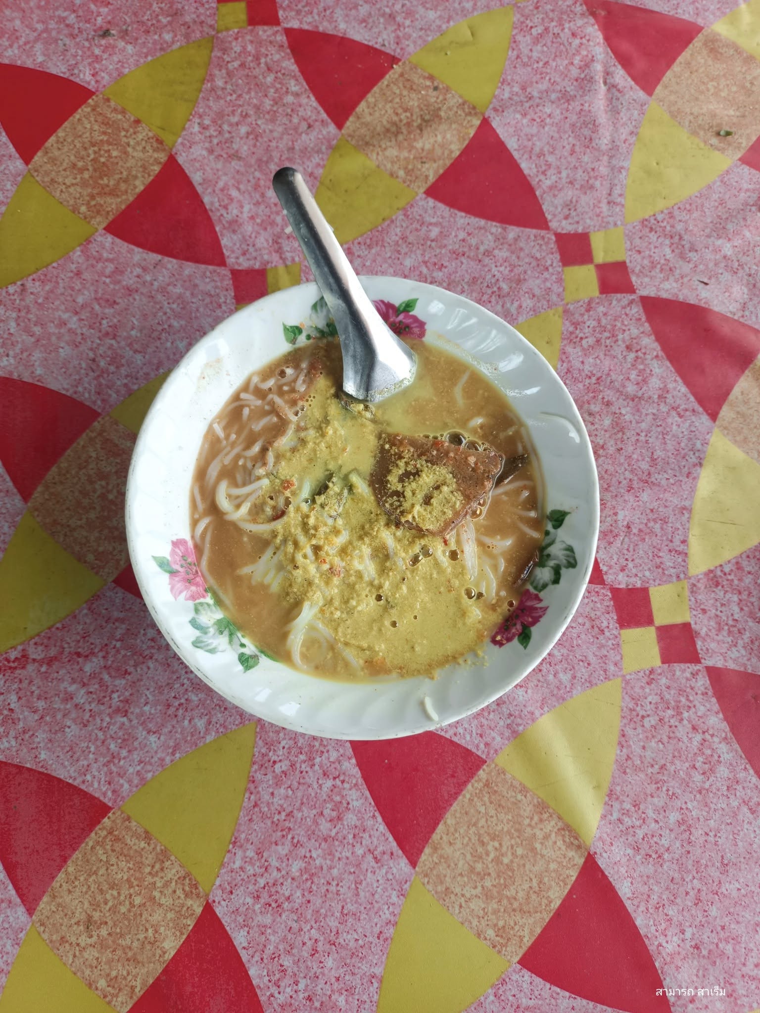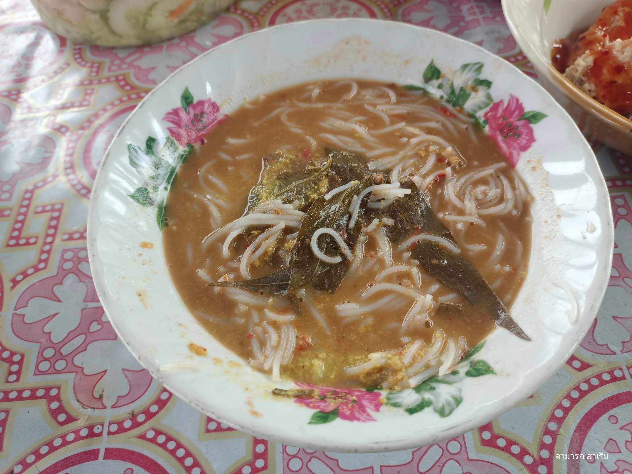 ระหว่างทานผมได้คุยกับ “มะน๊ะ” ที่เป็นลูกค้า่นเดียวกับผมท่านเป็นม๊ะใจดีอีกท่าน เกิดที่ฉลุงแต่มาแต่งงานที่หมู่บ้านนี้ “มะน๊ะ” ให้ข้อมูลเพิ่มเติมเกี่ยวกับวัฒนธรรมการกินขนมจีนของคนละงูว่ามีน้ำแกงถึง 4 แบบ ด้วยกัน