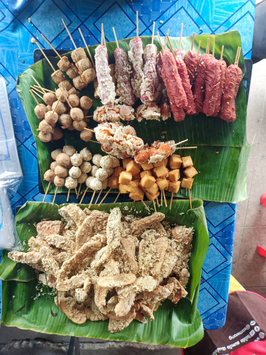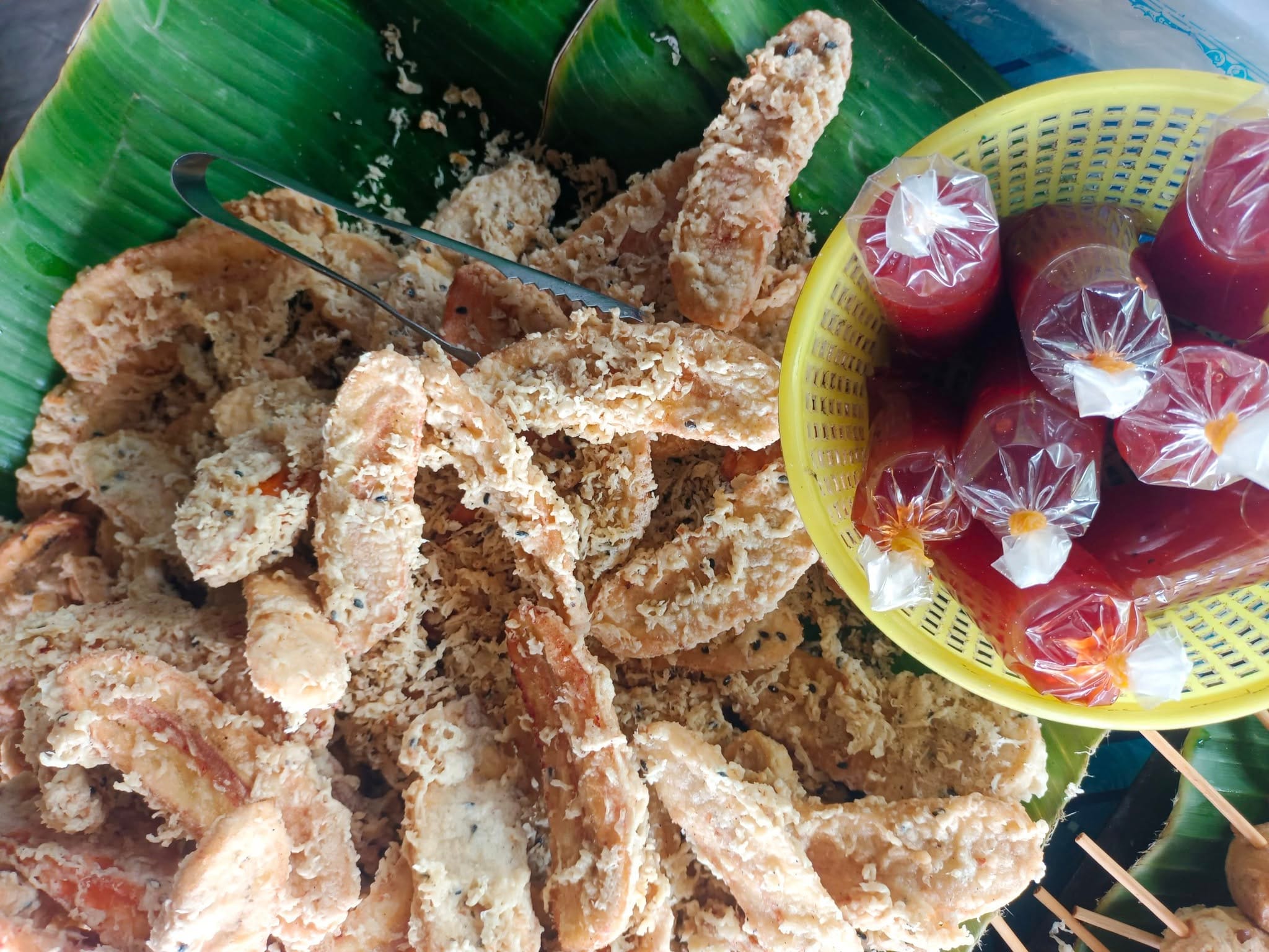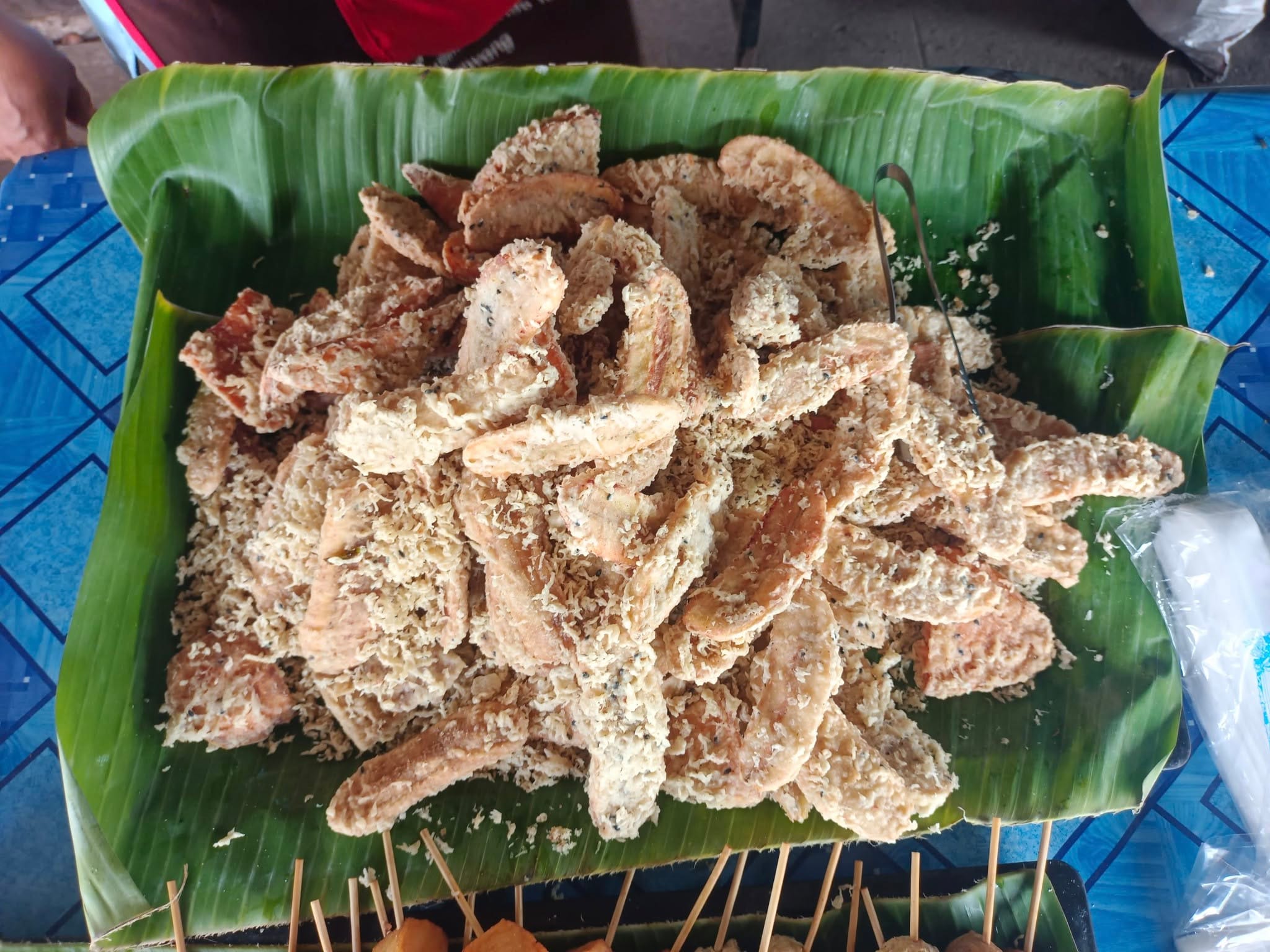 อาหารมื้อแรกที่ได้ลิ้มลองคือที่ร้านก๊ะย๊ะ ร้านเล็ก ๆ ริมถนนฝั่งตรงข้ามโรงเรียนบ้านตะโละใส มีเพียงโต๊ะวางสินค้าหนึ่งตัว กับโต๊ะนั่งลูกค้าอีกสองโต๊ะ สินค้าขึ้นชื่อคือ ของทอดกินกับน้ำจิ้ม กล้วยทอด และ หัวมันทอด ที่เสิร์ฟพร้อมน้ำจิ้ม เป็นน้ำจิ้มเดียวกับลูกชิ้น (3 ชิ้น 5 บาท) ของกินเล่นที่ขายมาก่อนอาหารอื่นๆ ตั้งแต่เปิดร้านช่วงแรก และเป็นวัฒนธรรมการกินกล้วยทอดที่ผมเคยได้ยินมานานแล้วว่ามีที่สตูล ผมจึงไม่พลาดที่จะลิ้มลอง ถือเป็นความแปลกใหม่ที่ได้ลิ้มลอง