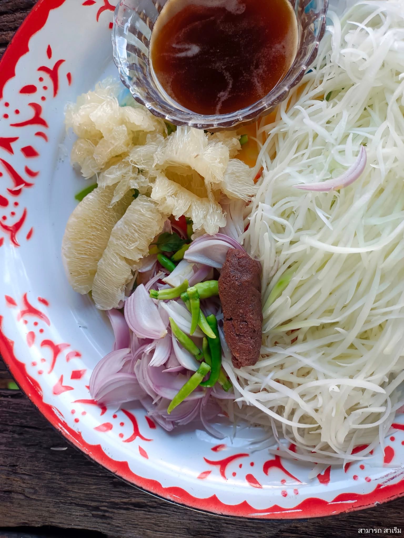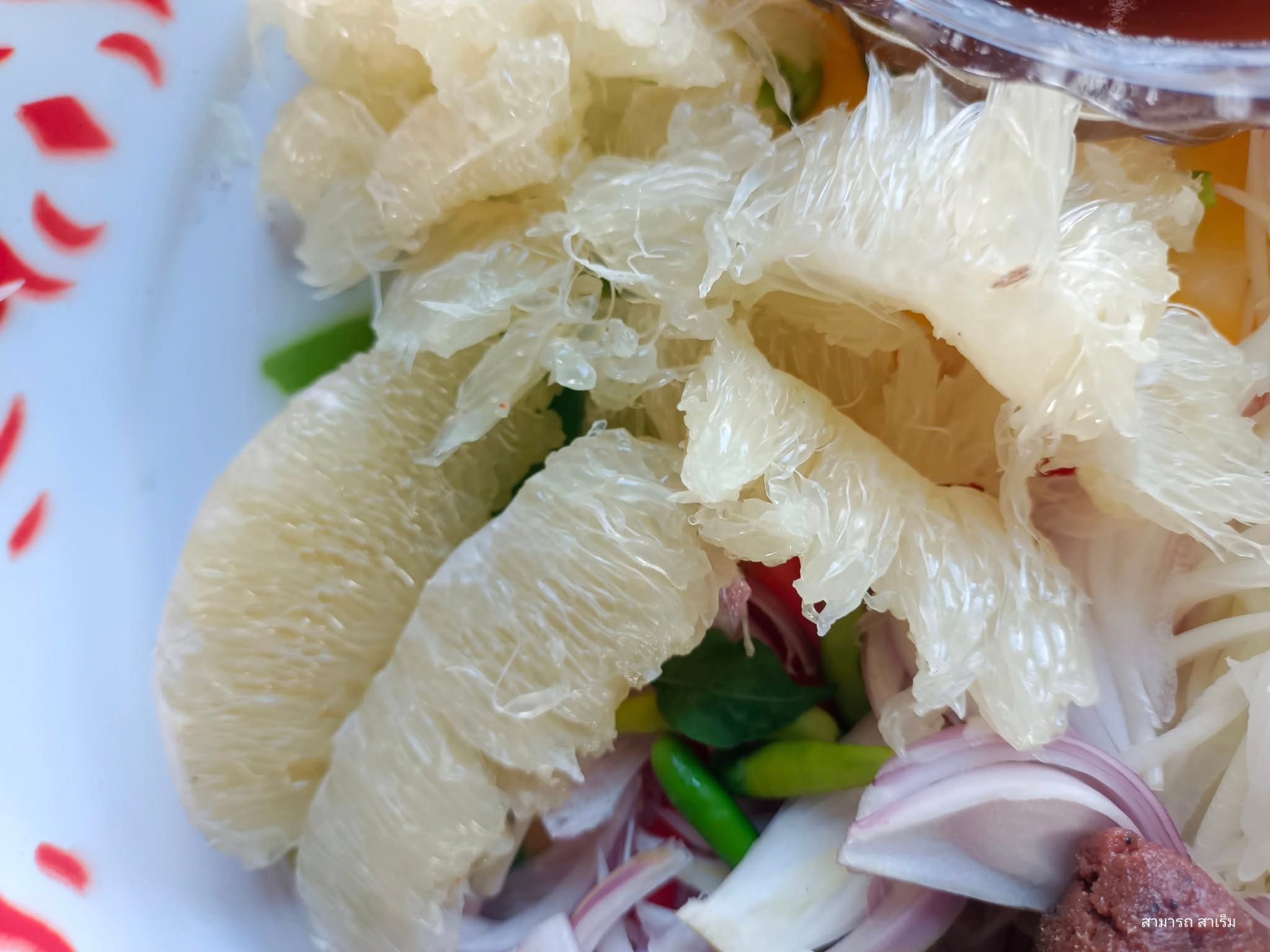 2.เตรียมเครื่องปรุง ซอยหอมแดง และ พริกสด เตรียมไว้เตรียมส้มนาวควายโดยปอกเปลือกคล้ายส้มโอ แล้วแกะเอาเฉพาะเนื้อด้านใน