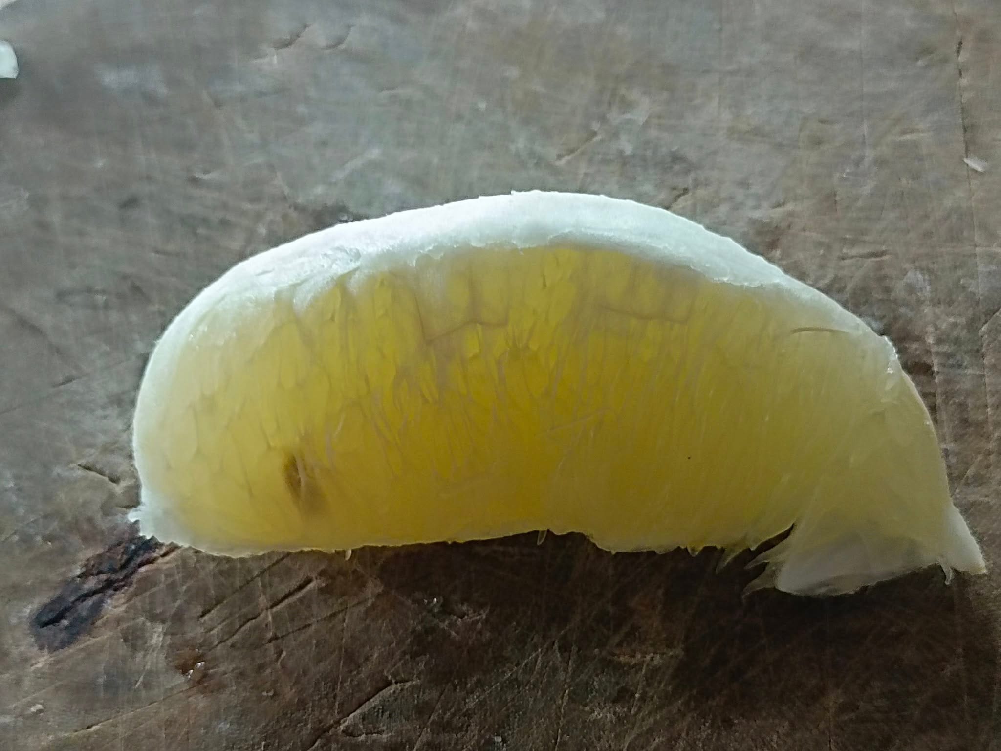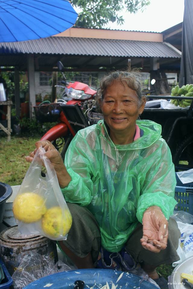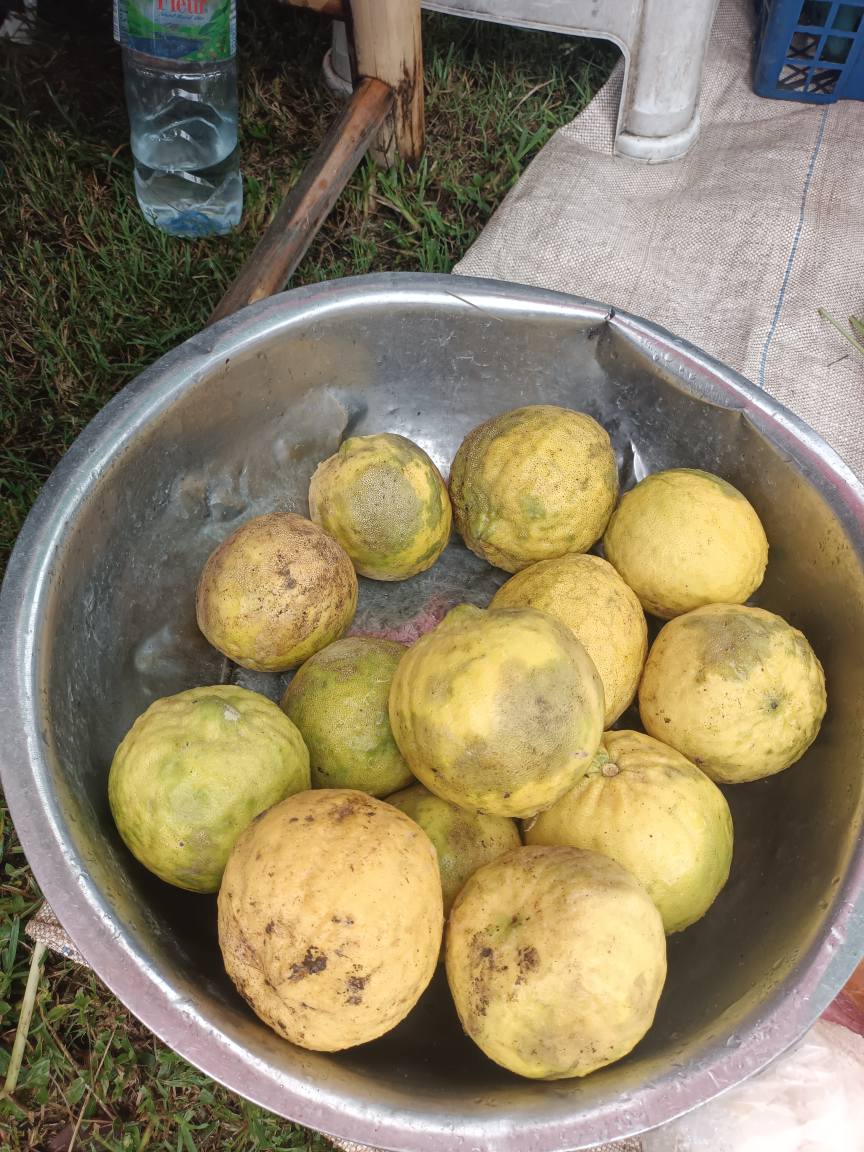 ขณะเดินเลือกซื้อพืชรสเปรี้ยวตั้งใจว่าอาจจะซื้อมะนาวหรือมะขามสดเพื่อทำแกงส้ม ก็ไปสะดุดตากับผลไม้รสเปรี้ยวลูกใหญ่ผิดตาที่วางขายในร้านผักพื้นบ้านแบกับดิน สอบถามได้ความว่ามันคือ #ส้มนาวควาย ซึ่งมีขนาดใหญ่กว่ามะนาวที่เราคุ้นเคยมาก อาจเป็นที่มาของชื่อที่มักใช้คำว่า “ควาย” มาเปรียบเทียบสิ่งที่มีขนาดใหญ่เกินปกติ คุณป้าเจ้าของร้านเล่าว่า “ส้มนาวควาย นี้ปลูกที่บ้านพังลา อำเภอสะเดา ลูกชายที่ไปอยู่ที่นั่นนำมาให้ ขายเพียงลูกละ 5 บาท…” โดยที่ 1 ลูกสามารถใช้แกงปลาได้ถึง 1 กิโลกรัม ด้วยความเปรี้ยวที่คาดว่าจะจัดจ้านและเป็นการรื้อฟื้นความทรงจำในวัยเด็ก ผมจึงอุดหนุนมาสองลูก