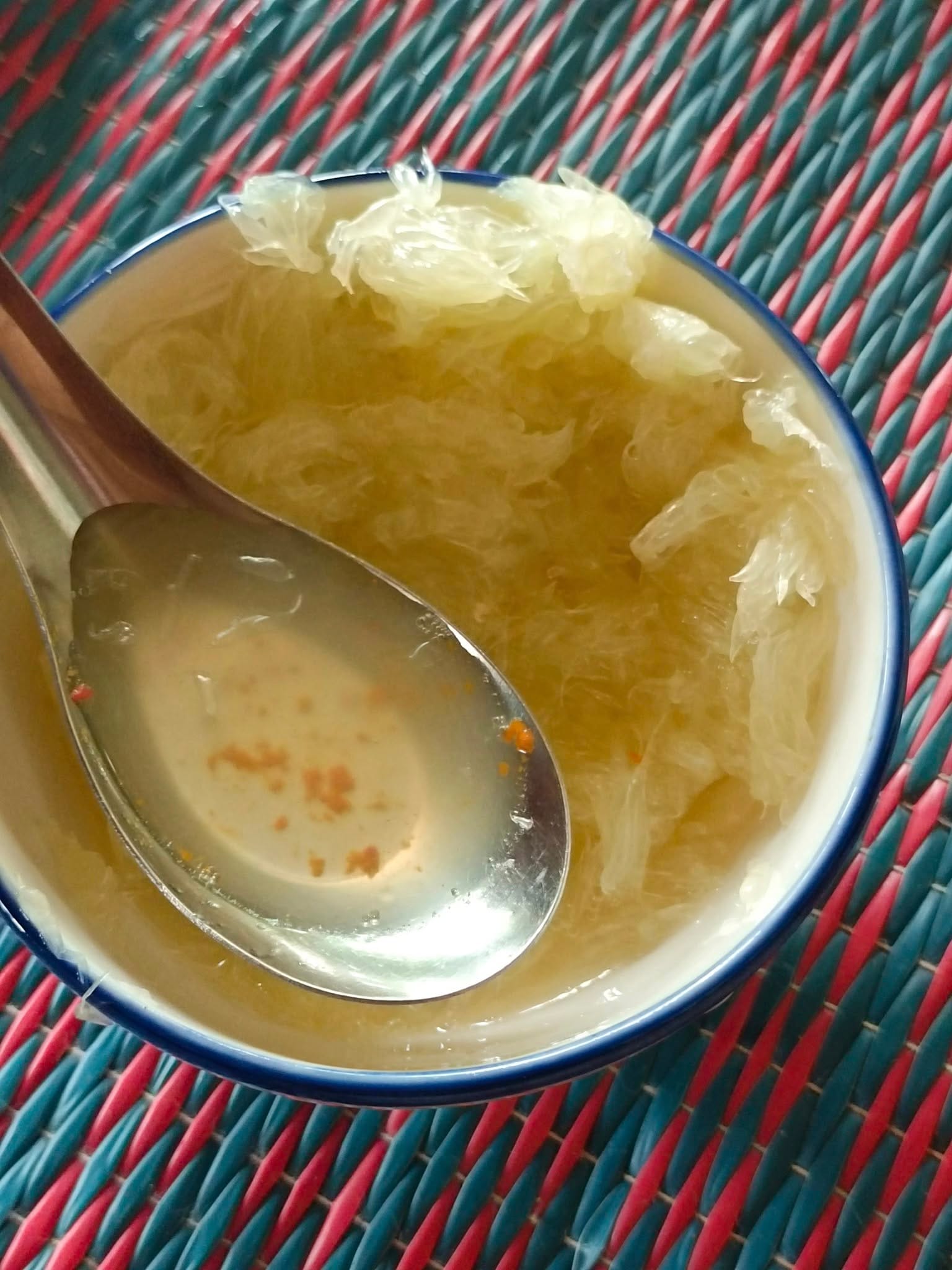 กลับถึงบ้านก็เริ่มลงมือเตรียมอาหารทันที จัดการล้างปลาสองซี่ที่เจาะหลังและโรยเกลือไว้ เสร็จแล้วเตรียมทำแกงส้ม เริ่มจากเตรียมส้มนาวควาย ผมปอกเปลือกส้มนาวควายเหมือนส้มโอ เอาเฉพาะเนื้อใช้ช้อนขยี้ให้เป็นน้ำ ทำไว้เพียงครึ่งลูกก่อน เพราะลองชิมดูแล้วพบว่า รสเปรี้ยวเข้มข้นมาก แล้วตั้งน้ำให้เดือด ละลายเครื่องแกงตำมือ ที่อุดหนุนมาจากคนในหมู่บ้าน ซึ่งมีรสชาติอร่อยและเป็นที่พึ่งของครัวยุคใหม่(ที่ไม่ทิ่มเครื่อง) เมื่อน้ำแกงเดือด จึงใส่ปลาคางโค๊ะและปลาหัวอ่อนลงไป รอจนปลาสุกจึงเติมน้ำส้มนาวควายที่เตรียมไว้ และปรุงรสด้วยเกลือ พบว่าใช้เพียงครึ่งลูกก็ให้รสเปรี้ยวที่ลงตัวแล้ว