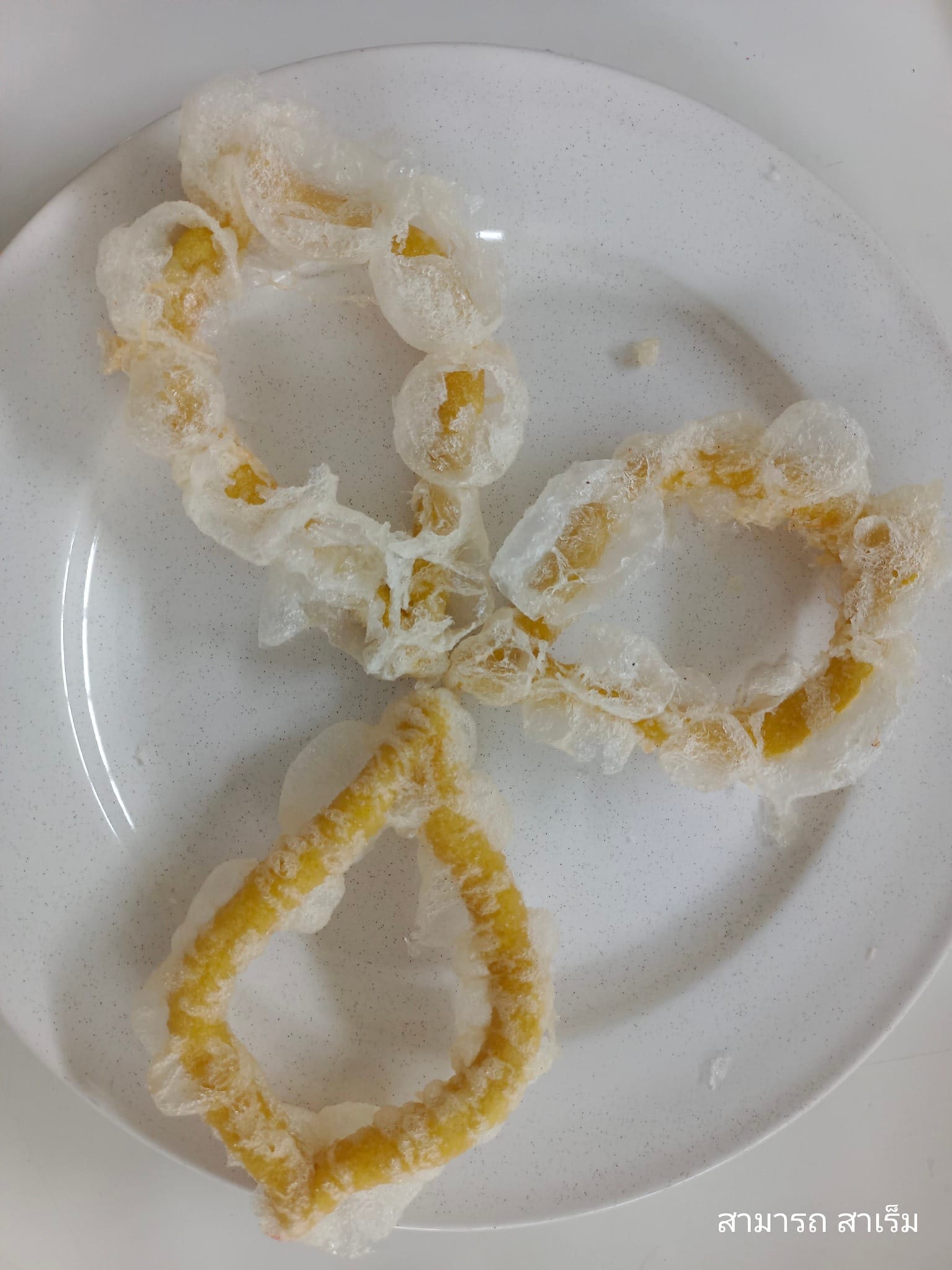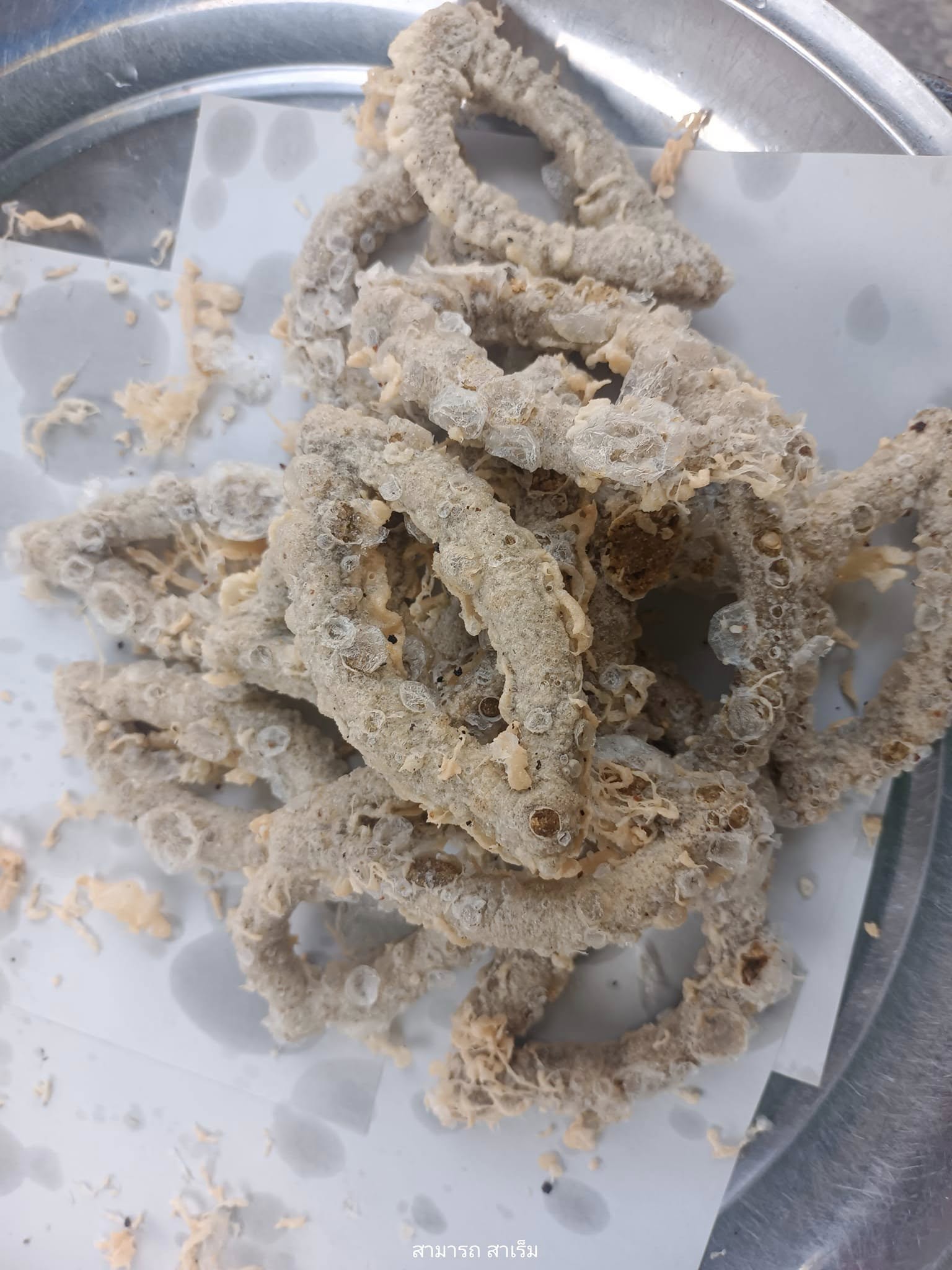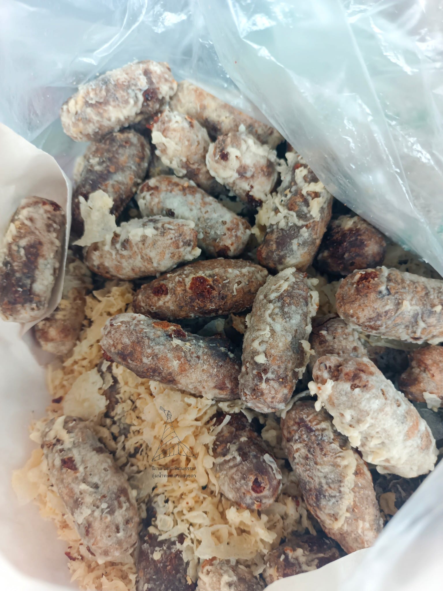 สิ่งที่สะดุดตาและชวนให้อุดหนุนเป็นพิเศษคือ ขนมทอด ชนิดหนึ่งที่มีลักษณะปั้นเป็นก้อนกลมสั้นยาว มีเส้นใยแป้งที่ทอดจนสุกกรอบผสมอยู่ด้วย คุณยายคนขายบอกว่านี่คือ “ขนมไข่เหี้ย” ซึ่งชื่อของมันมาจากสัตว์เลื้อยคลานที่หลายคนหวาดกลัว ผู้เขียนคาดเดาเอาเองว่า การตั้งชื่อเช่นนี้คงตั้งใจให้มีรูปลักษณ์คล้ายกับไข่ของสัตว์ชนิดนี้นั่นเอง