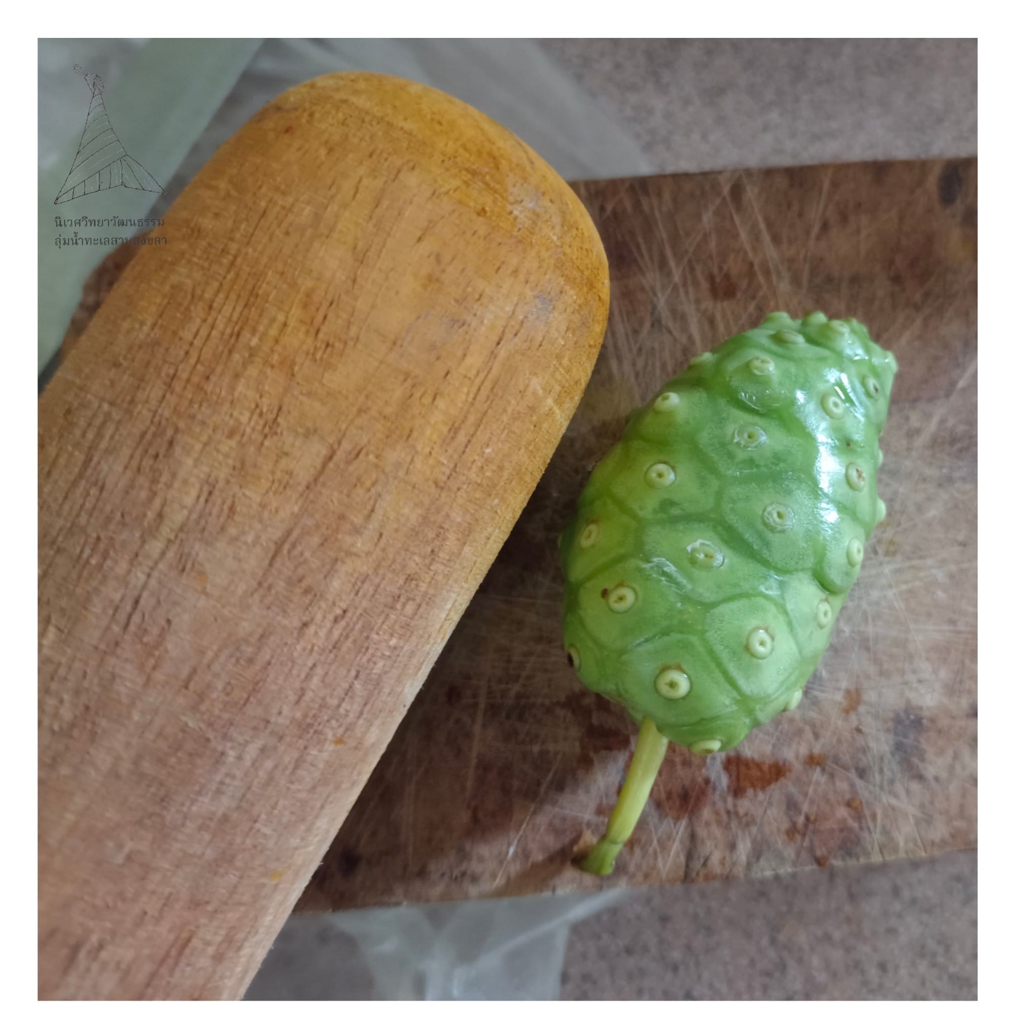 4 “รวมส่วนผสม” ตามด้วยเนื้อลูกยอที่ทุบเตรียมไว้ ลงไปตำ (ทิ่ม) รวมกัน
