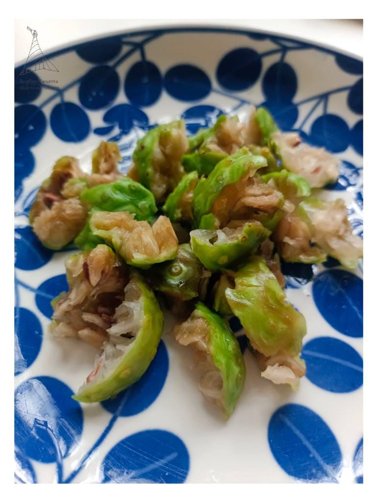 2. “จัดการเนื้อยอ” นำส่วนเนื้อที่ติดเปลือกออก (โดยที่เม็ดได้ถูกแยกออกแล้ว) แช่น้ำเกลือไว้ จากนั้น ขยำล้างกับน้ำเกลือ เพื่อทำให้เนื้อนิ่มลงและช่วยลดความฝาด ขั้นตอนนี้จะมีความคันติดมือมาด้วยให้ระวัง