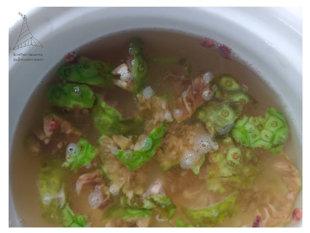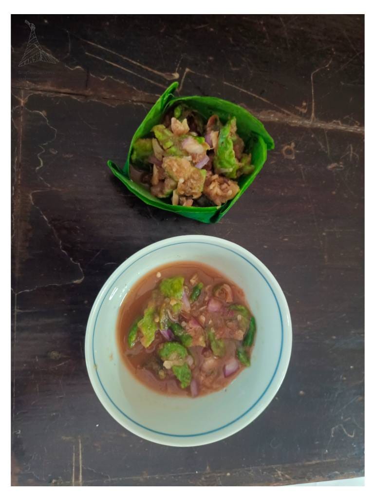 “ใบเพสลาด” นำมาลวกก่อน แล้วใส่ใน “แกงเผ็ดปลาช่อนย่าง” หรือ “แกงเผ็ดกุ้ง”