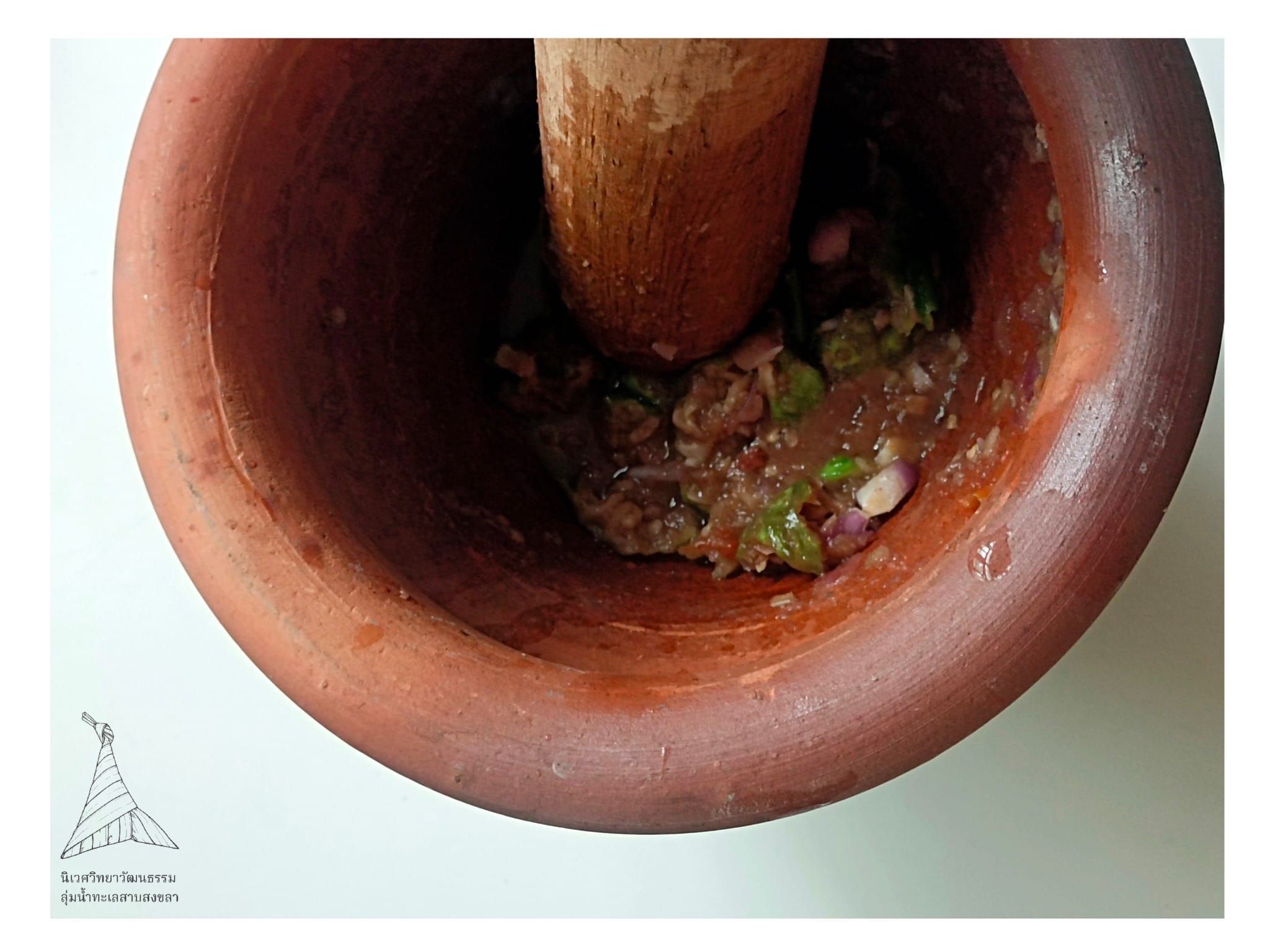 3. “ตำเครื่องปรุง” ตำ หอมแดง พริกสด กระเทียม และ กะปิ ในครก