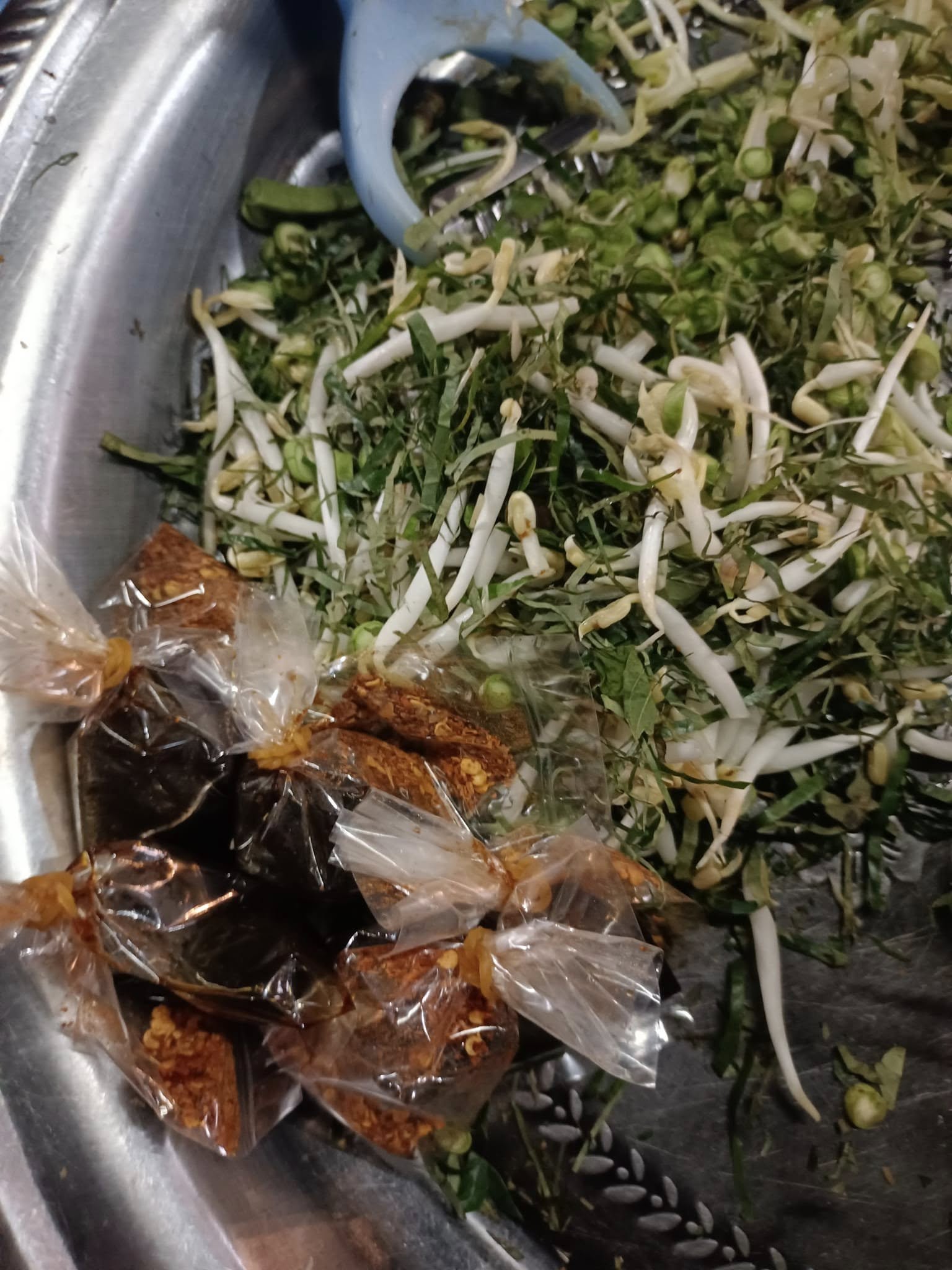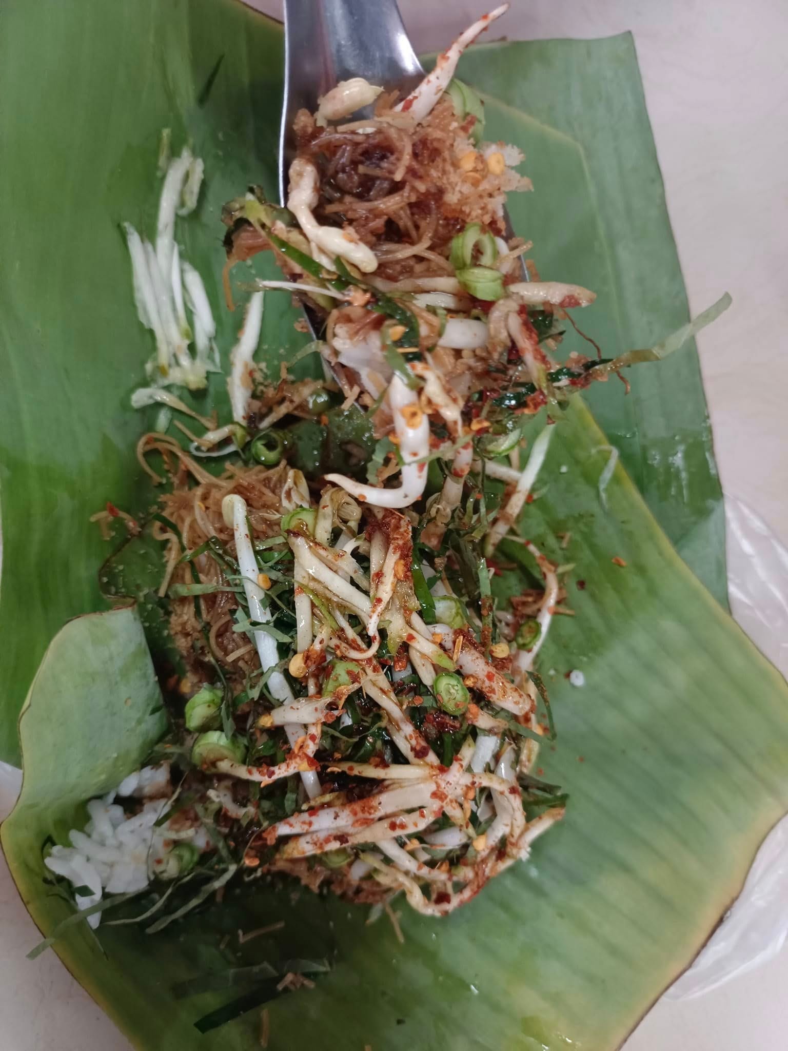 เมื่อมาถึงตลาดเช้าควนเนียง ซึ่งตั้งอยู่ใกล้กับสถานีรถไฟ บรรยากาศเต็มไปด้วยความคึกคัก ในตลาดมีทั้งของสด ของแห้ง อาหาร และขนมพื้นบ้านมากมายละลานตา และแน่นอน พี่สาวของผมก็ไม่พลาดที่จะ “อุดหนุนเพื่อการเรียนรู้” ตามเช่นเคยที่เราเจอกันเมื่อไปตลาด ท่ามกลางร้านรวงมากมาย มีร้านข้าวยำของคุณยายท่านหนึ่งขายอยู่ ผมไม่พลาดที่จะพาแขกคนสำคัญไปเรียนรู้ข้าวยำแบบฉบับคนสงขลา หรือคนลุ่มน้ำทะเลสาบสงขลา