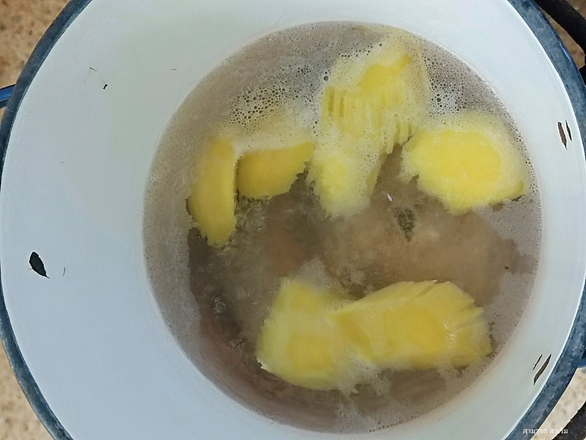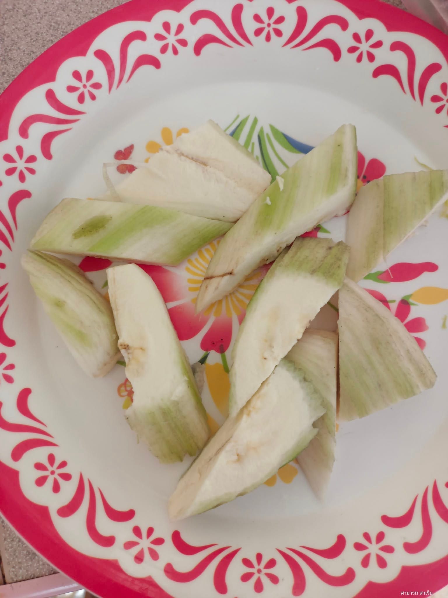เมนูที่แม้แต่ตัวผมเองก็ไม่เคยกินมาก่อน วัตถุดิบที่ใช้ในการแกงส้มหม้อนี้มีความพิเศษยิ่ง ไม่ได้มีแค่ม่วงมุดเท่านั้น แต่ยังมี “กล้วยเขียว” กล้วยแก่ที่ “ป้าภู่” แบ่งให้มาอีกทอดหนึ่ง โดยเป็นกล้วยที่มาจากพัทลุง ซึ่งมีลักษณะคล้ายกล้วยน้ำมาก แต่ผลใหญ่กว่า เนื้อสัมผัสคล้ายกัน มีความนุ่มละมุนลิ้นเมื่อนำมาแกง