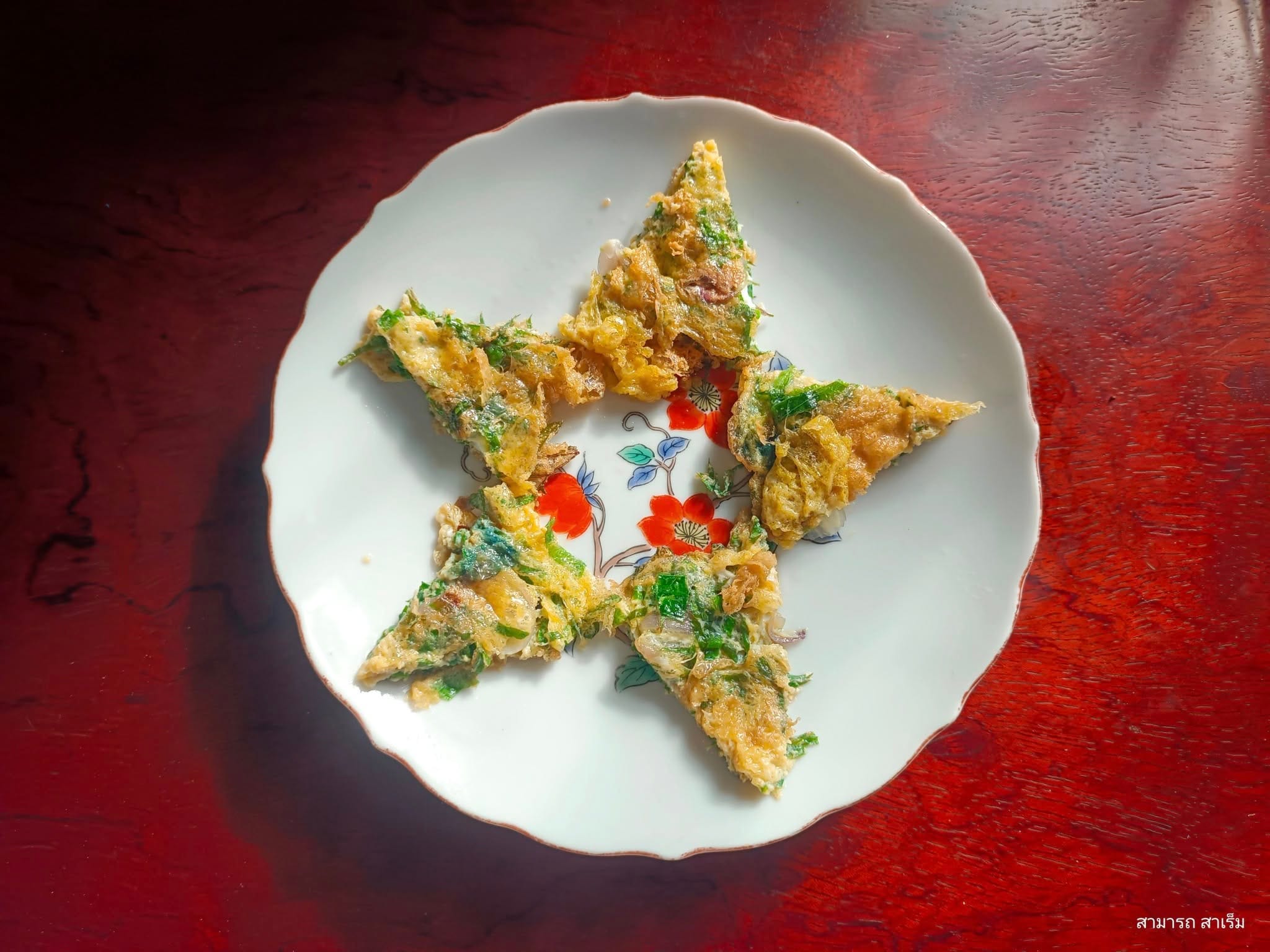 ไข่เจียวใส่ใบเล็บครุฑ ใบเหมียง หอมแดงและดอกอัญชัน ปรุงรสด้วยเกลือ ทอดให้สุกกรอบกินกับแกงส้มหม้อนี้