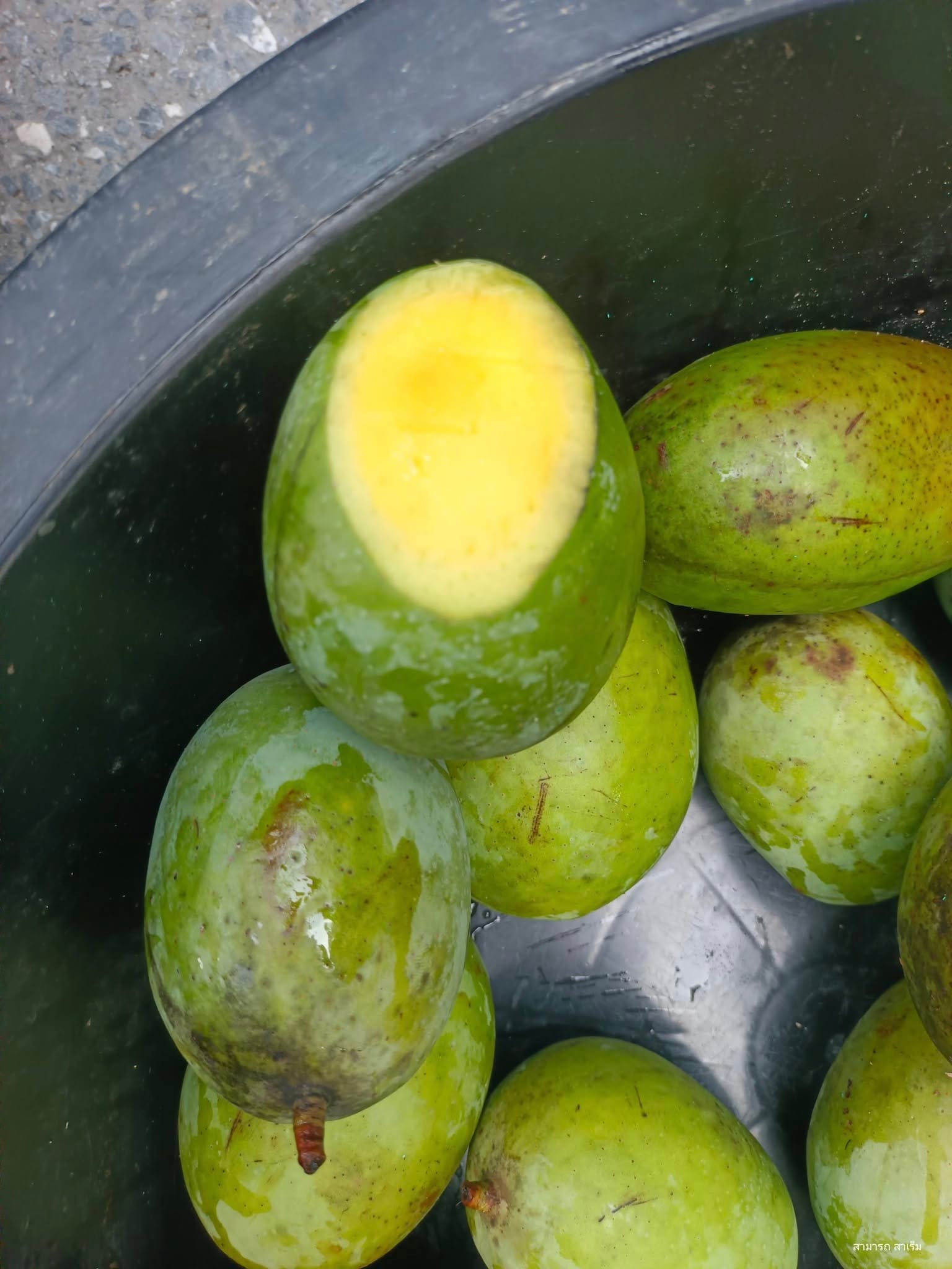 นี่คือของที่ต้องอุดหนุนโดยไม่ลังเล คุณยายบอกว่าถ้าจะรอให้สุกกินอร่อยแบบหวานหอมต้องรอไปอีกสามวัน ซึ่งจะตรงกับวันพฤหัสบดีพอดี “ม่วงมุด” คือผลไม้ลูกผสมที่น่าสนใจยิ่ง เป็นการผสมผสานระหว่าง มะม่วง ชนิดหนึ่ง กับ ลูกมุด (หรือส้มมุด) ผลไม้ท้องถิ่นภาคใต้ที่พบได้ในไทย มาเลเซีย และอินโดนีเซีย ฯลฯ ลูกมุดมีเอกลักษณ์ทั้งในกลิ่นและรสชาติ ลูกแก่ใช้แกงส้ม ยำหรือทำน้ำชุบ (น้ำพริก) ได้ ส่วนลูกสุกจะมีกลิ่นอันเป็นเอกลักษณ์ที่คนชอบจะบอกว่า “หอม” แต่สำหรับคนใต้จำนวนไม่น้อยกลับไม่ชอบและบอกว่า “เหม็น” จนไม่อาจทนได้เลยทีเดียว ส่วนเจ้า “ม่วงมุด” ก็มีลักษณะคล้ายกัน ลูกแก่ใช้ทำน้ำชุบ ยำและแกงส้มได้อร่อย ส่วนลูกสุกก็นิยมกินเช่นกัน แต่กลิ่นจะมีความหอมน้อยกว่า “ลูกมุด” มาก ครั้งแรกที่พบที่สงขลาในชื่อ “มุดม่วง” นั้น รสชาติอร่อยและมีกลิ่นหอมชวนติดใจ