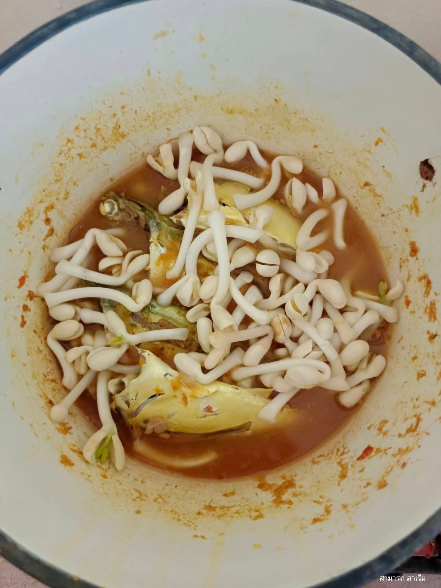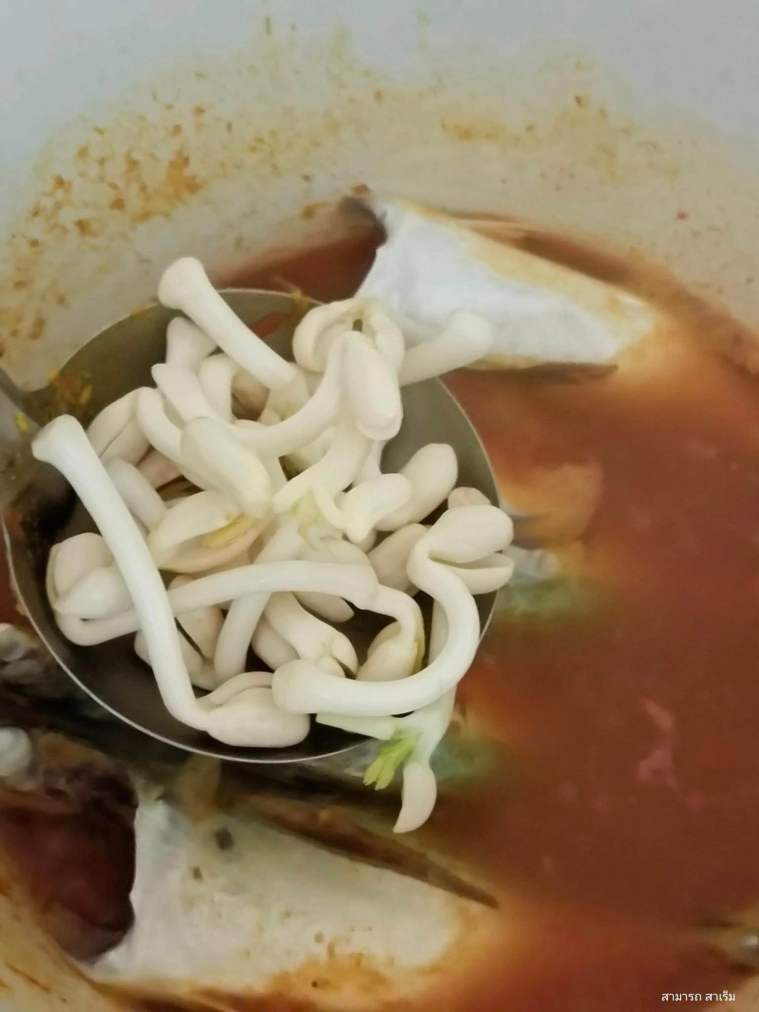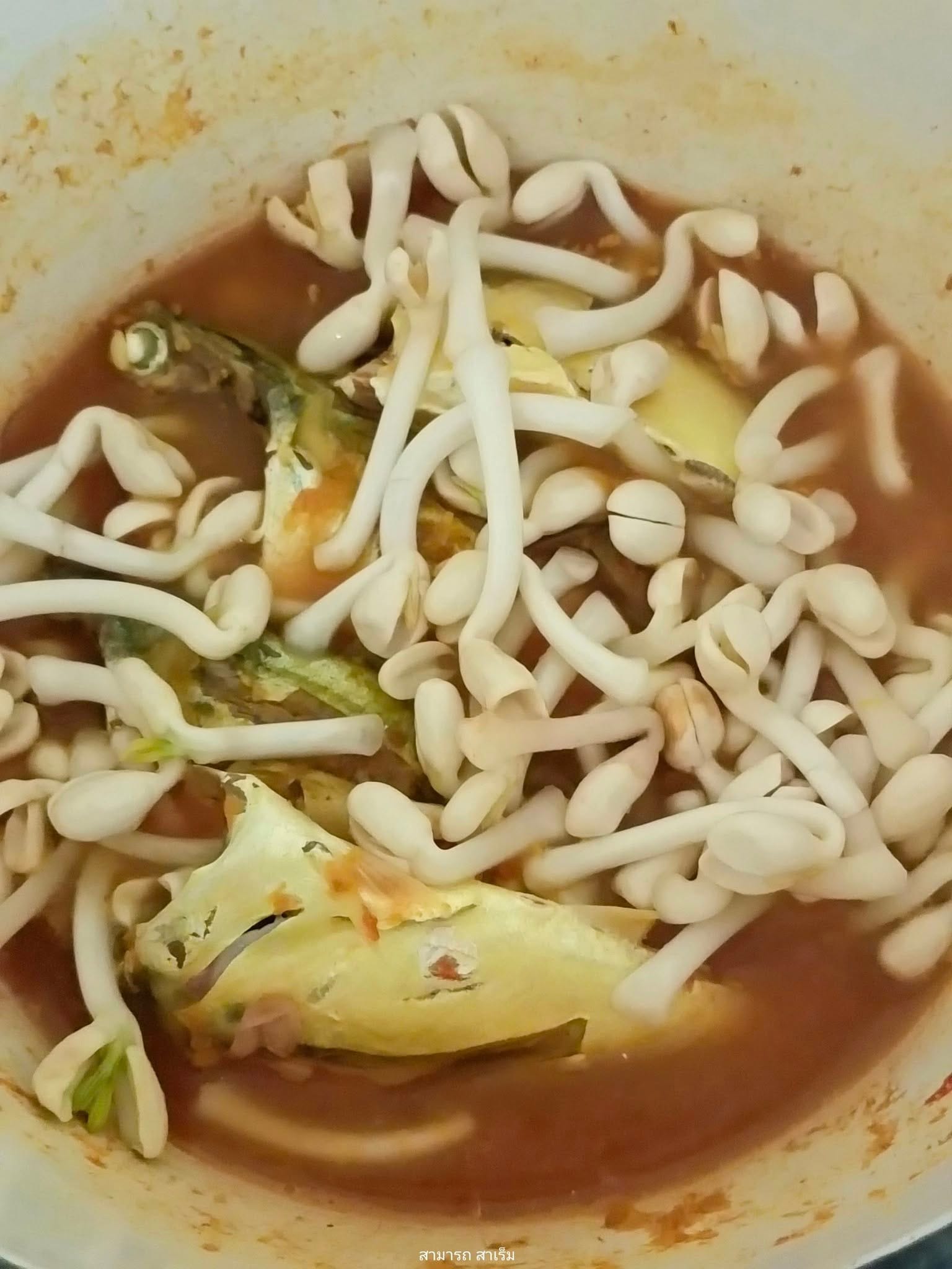 น้ำแกงส้มข้น ๆ ที่เหลือจากเมื่อวานถูกนำมาเพิ่มเนื้อปลาและปรุงรสใหม่อีกเล็กน้อย กระบวนการปรุงเริ่มต้นอย่างเรียบง่าย หม้อน้ำแกงถูกตั้งไฟ เติมน้ำเปล่าเพิ่มเพียงเล็กน้อย พอเดือดพล่าน จึงใส่ปลาทูมันสดที่ล้างเตรียมไว้ลงไป เมื่อเนื้อปลาสีขาวขุ่นใกล้สุก “ถั่วหัวโต” ก็ถูกเติมตามลงไปทันที เพื่อรักษาสัมผัสความกรอบและความมันอันเป็นเอกลักษณ์ เมื่อทุกอย่างเดือดอีกครั้ง การปรุงรสขั้นสุดท้ายก็มาถึง รสเปรี้ยวที่ขาดไม่ได้ในแกงส้มปักษ์ใต้ถ้วยนี้ ถูกเติมเต็มด้วย “น้ำส้มจาก” (น้ำส้มสายชูหมักจากต้นจาก) ซึ่งให้ความเปรี้ยวอันเป็นอัตลักษณ์ ตัดด้วยเกลือเล็กน้อย รสชาติเปรี้ยวนำเค็มที่คุ้นลิ้นก็เป็นอันเสร็จสมบูรณ์