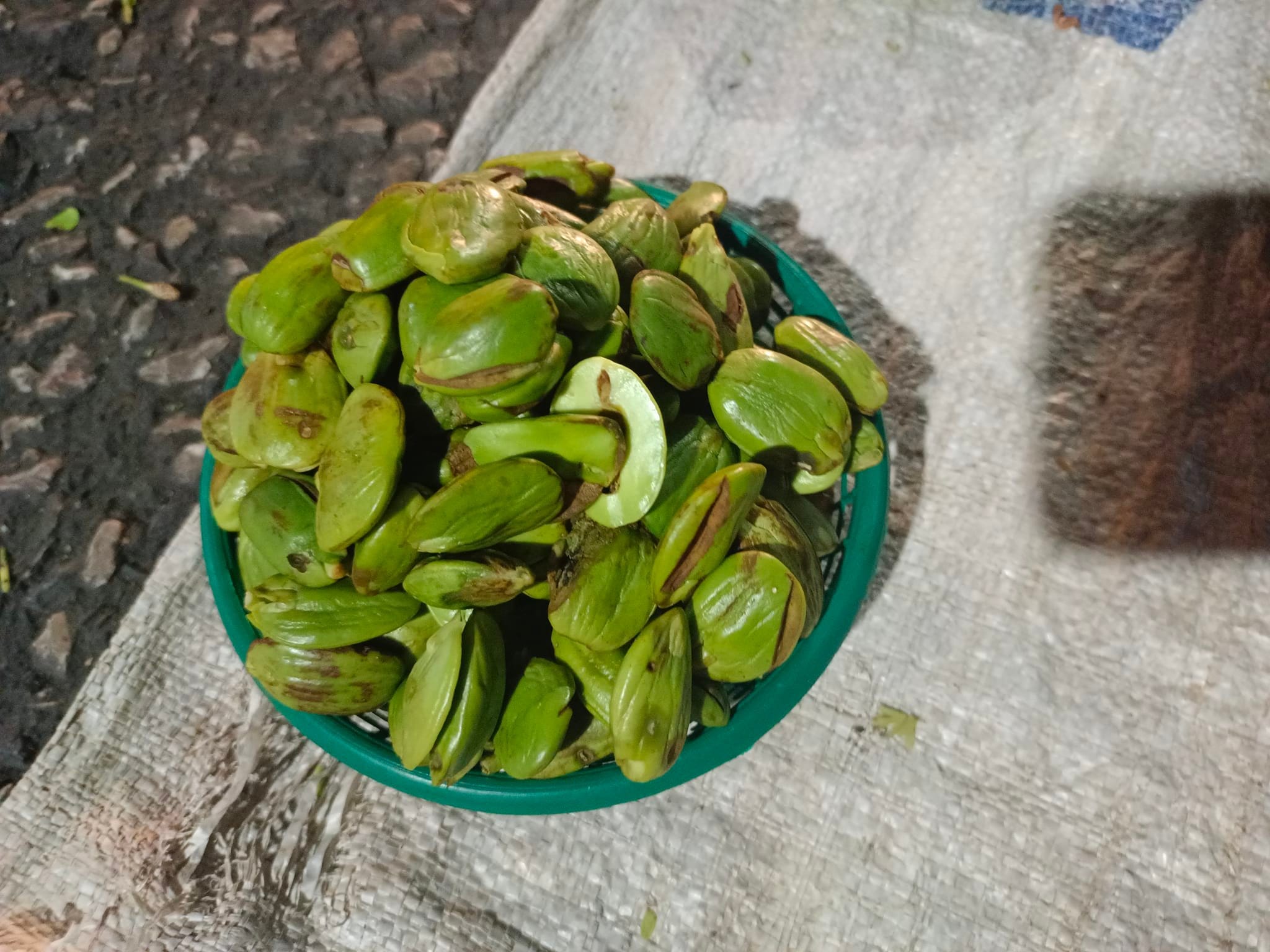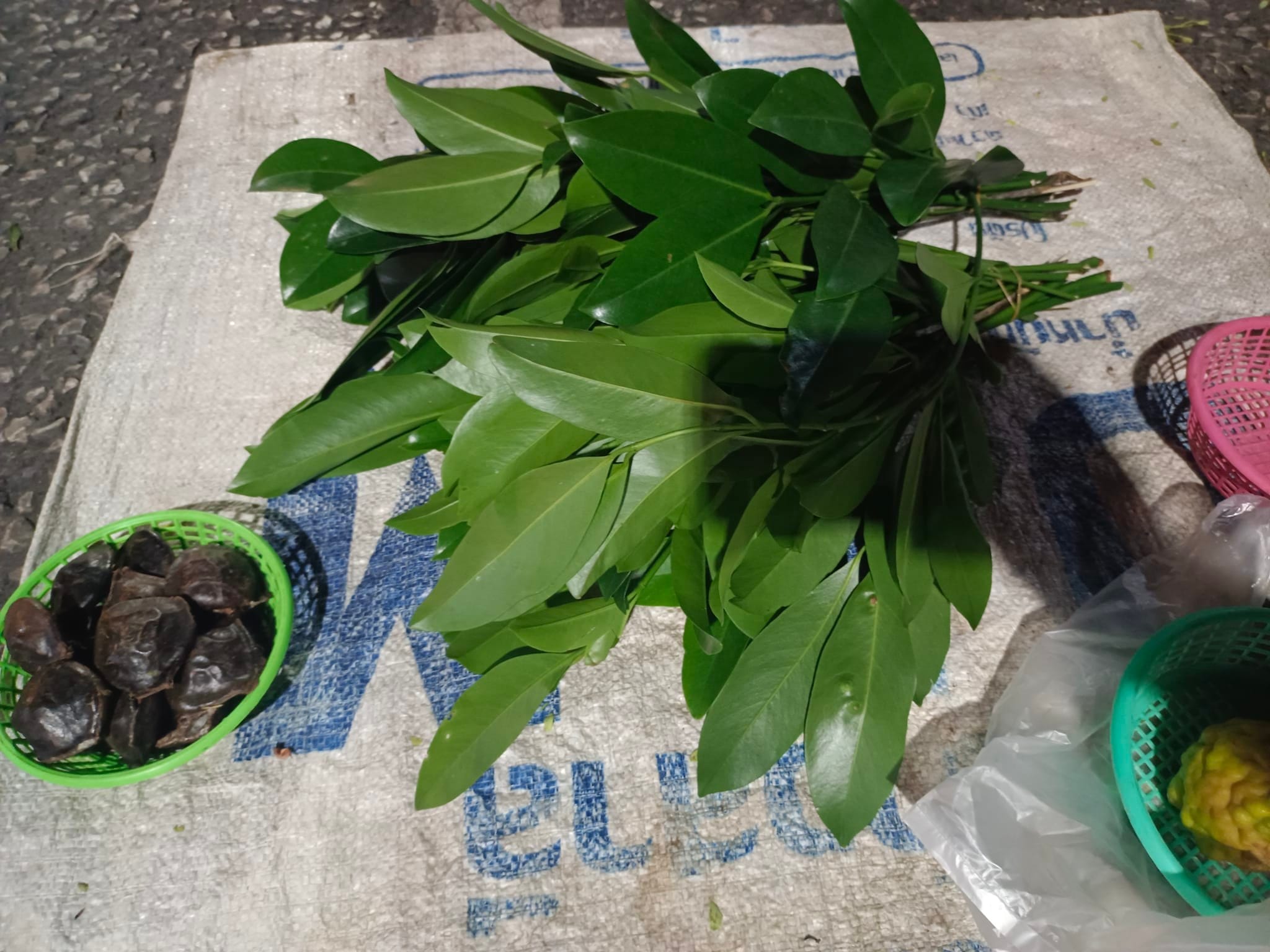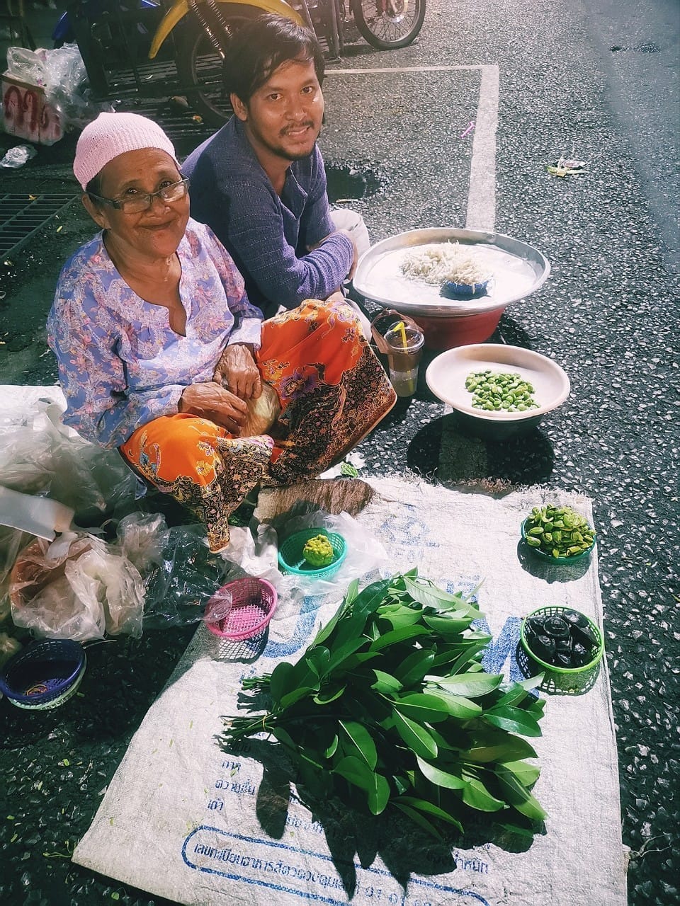 ท่ามกลางความพลุกพล่านและแผงค้ามากมาย สายตาของเราก็สะดุดเข้ากับร้านเล็ก ๆ ของ “มะแก่” (ยาย) ท่านหนึ่งที่ตั้งร้านแบบ “แบกะดิน” สินค้าที่วางขายคือพืชผักพื้นบ้านไม่กี่ชนิด ทั้ง #หน่อไม้ #ลูกตอ #ใบส้มมวง(ชะมวง) #ลูกเนียง และ #ลูกกรูด ที่เหลือไม่มากนัก เราไม่พลาดที่จะแวะเข้าไปพูดคุยและขอถ่ายรูปท่านไว้เป็นที่ระลึก