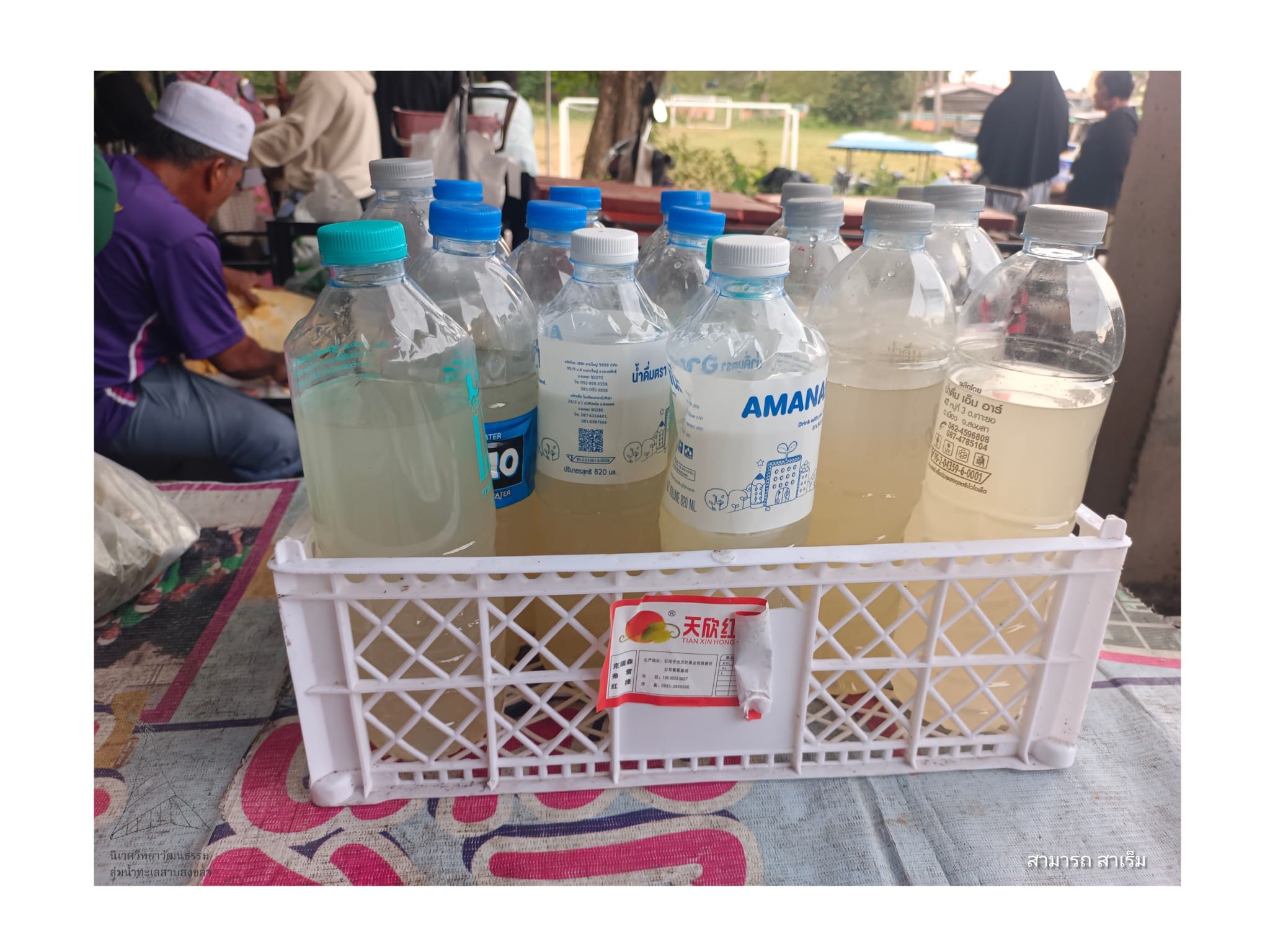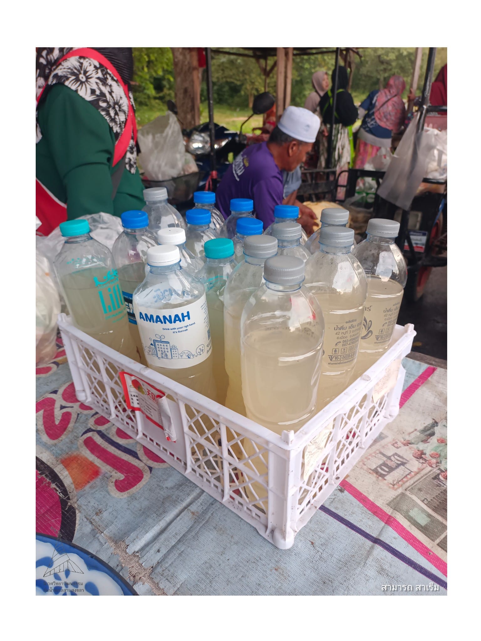 เพื่อนนัสซีเล่าเสริมว่า “…ทำแบบบ้านๆง่ายๆ เพราะมะทำขนมหลายอย่าง น้ำพร้าวเหลือเยอะแปรรูปเป็นน้ำส้มดีหวาทิ้ง ทำได้ไม่มากมีลูกค้าประจำรอซื้อกัน…” ผมจึงไม่พลาดที่จะอุดหนุนมาสองขวด ขวดละ 10 บาท พร้อมกับฝากอาจารย์พี่เกื่ออีกหนึ่งขวด มะยังได้แนะนำเคล็ดลับการใช้ รสชาติจะเปรี้ยวจัด เวลาแกงจึงไม่ควรใช้เยอะ สามารถใช้แกงกับปลาขี้ตัง หรือปลามีหลังได้หมดแล้วแต่ชอบ