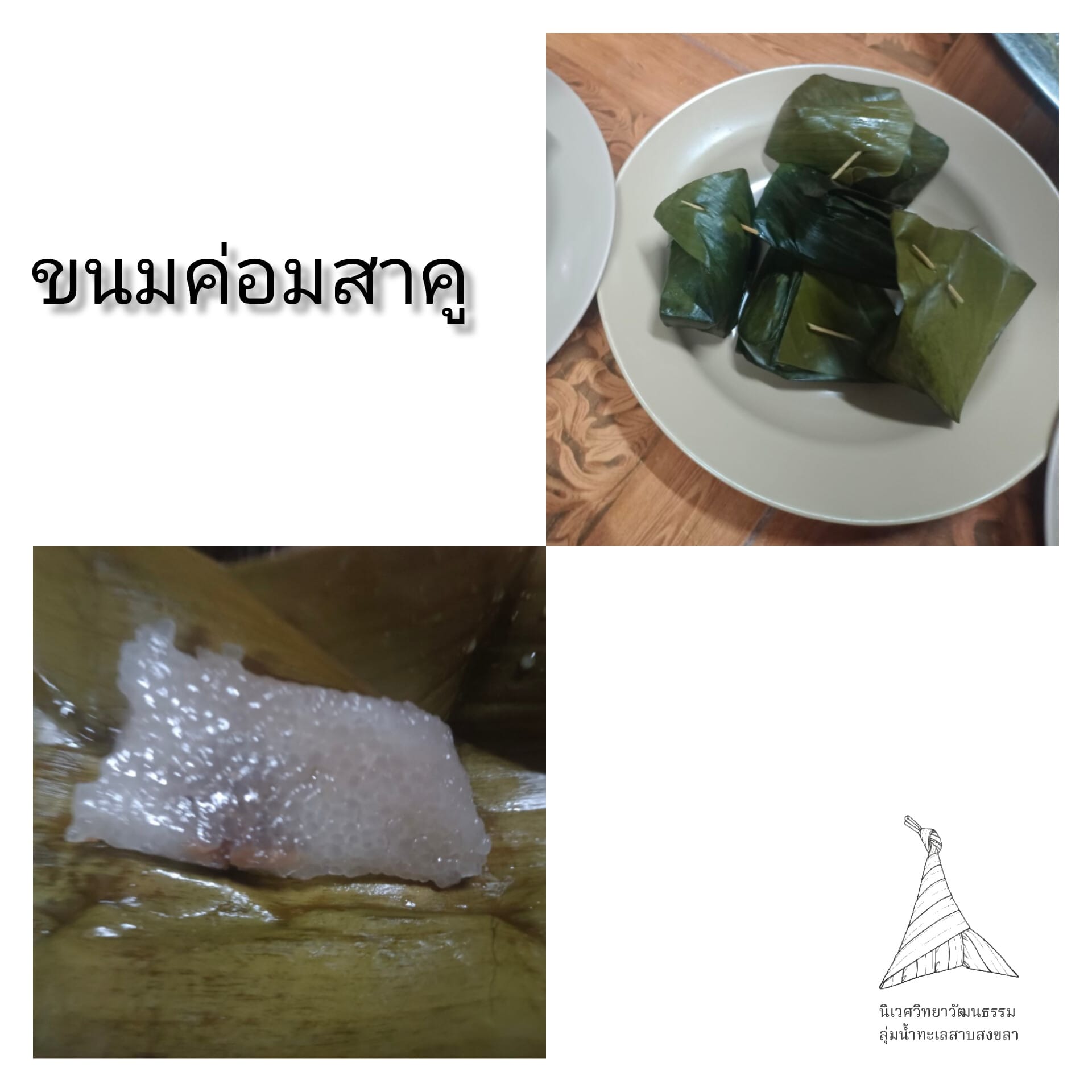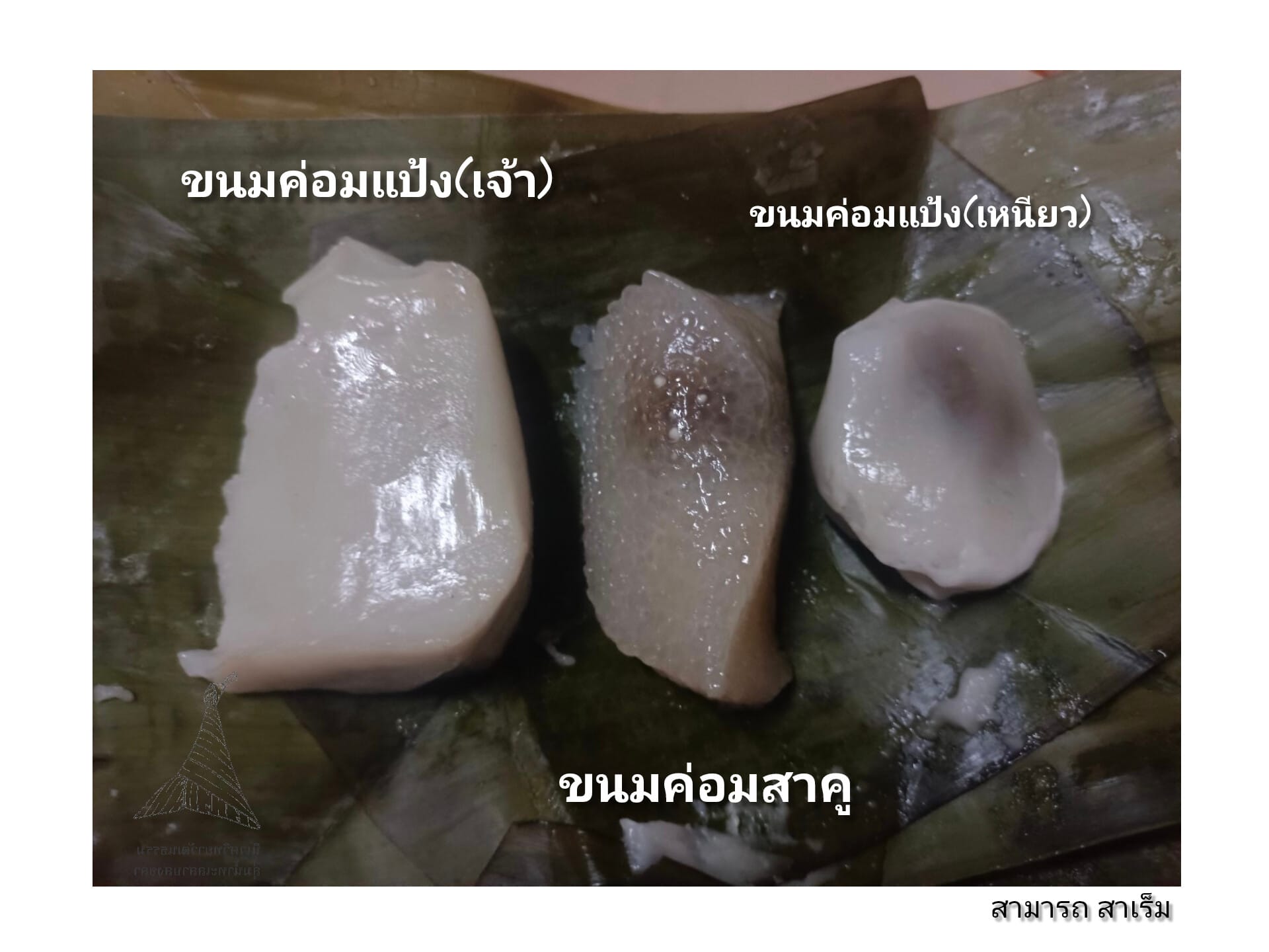 ขนมค่อมอีกชนิดหนึ่งคือ “ขนมค่อมสาคู” ซึ่งใช้ สาคูที่ทำจากมันสำปะหลังเป็นสินค้าสำเร็จรูปที่หาซื้อได้จากร้านชำในหมู่บ้าน ซึ่งซื้อมาจากในตลาดอีกทีหนึ่ง เป็นวัตถุดิบที่ผลิตในโรงงาน เป็นส่วนห่อหุ้มไส้ อย่างไรก็ตาม ญาติผู้ใหญ่ (โต๊ะดะ) ได้เล่าถึงความดั้งเดิมว่า ในอดีตนั้น ขนมค่อมสาคูแท้จริงแล้วจะใช้ แป้งสาคู (จริง) ที่ได้จาก ต้นสาคู ซึ่งเคยมีอยู่มากมายในหมู่บ้านเมื่อครั้งที่ท่านยังเยาว์วัย แต่ในปัจจุบัน ต้นสาคูในหมู่บ้านได้หมดไปแล้ว จึงต้องเปลี่ยนมาใช้สาคูจากมันสำปะหลังแทน ซึ่งสะท้อนให้เห็นถึงการเปลี่ยนแปลงของระบบนิเวศและการปรับตัวด้านอาหารตามสภาพแวดล้อมที่เปลี่ยนไป และวัตถุดิบใหม่ๆ ที่เข้ามาแทนที่ของดั้งเดิมที่เคยผลิตได้เองในหมู่บ้าน