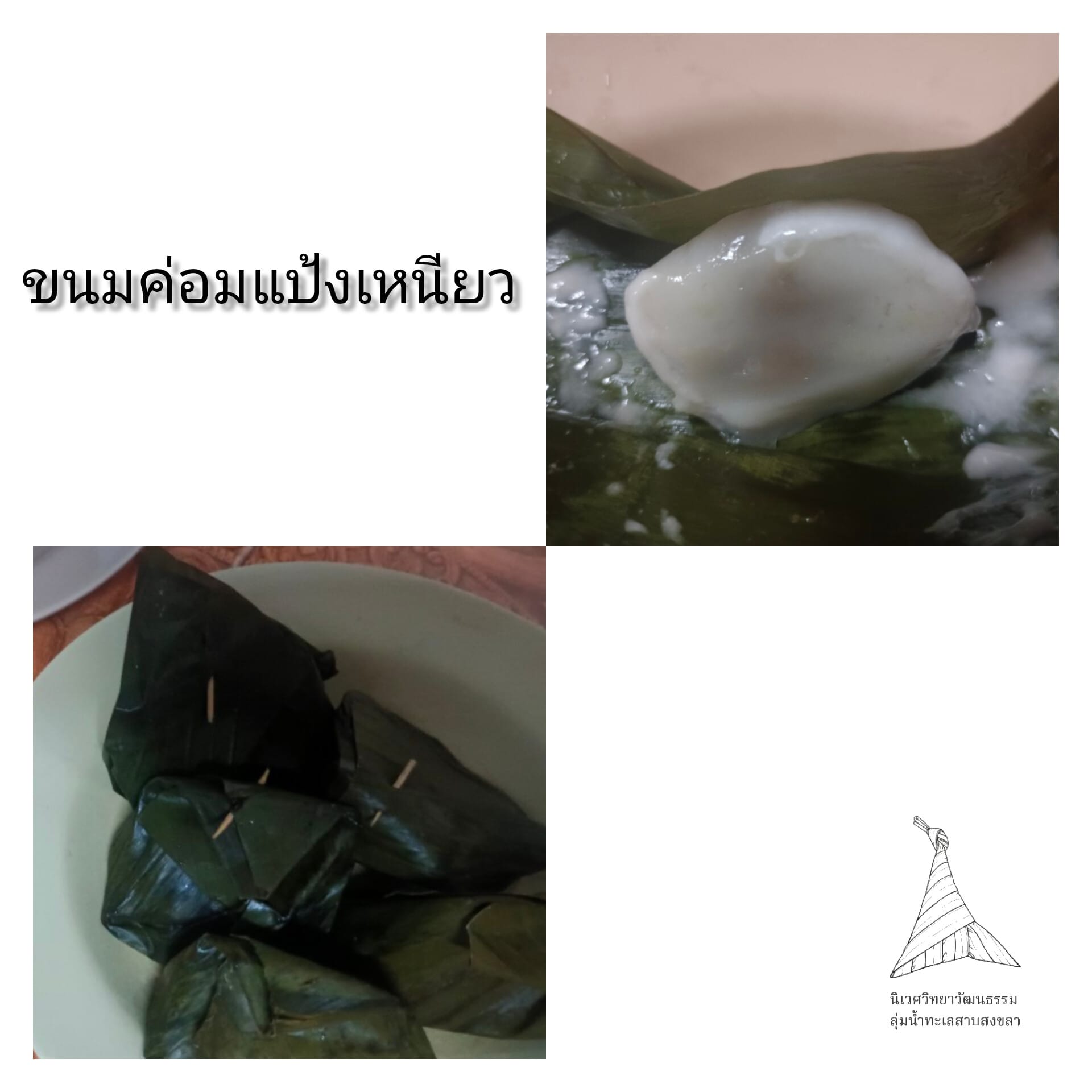 นี่คือขนมค่อมที่ใช้ แป้งข้าวเหนียว เป็นส่วนประกอบหลักในการห่อไส้ทำจากมะพร้าวทึนทึกผัดกับน้ำตาลหรือถั่วเขียวผัดกับน้ำตาล ซึ่งมีลักษณะคล้ายกับ “ขนมเทียน” ของคนภาคกลาง แต่สำหรับชาวบ้านควน ขนมเทียนยังหมายถึงขนมอีกแบบที่ทำจากแป้งข้าวเหนียวผสมมะพร้าวทึนทึกและน้ำตาล ห่อเป็นรูปสี่เหลี่ยม