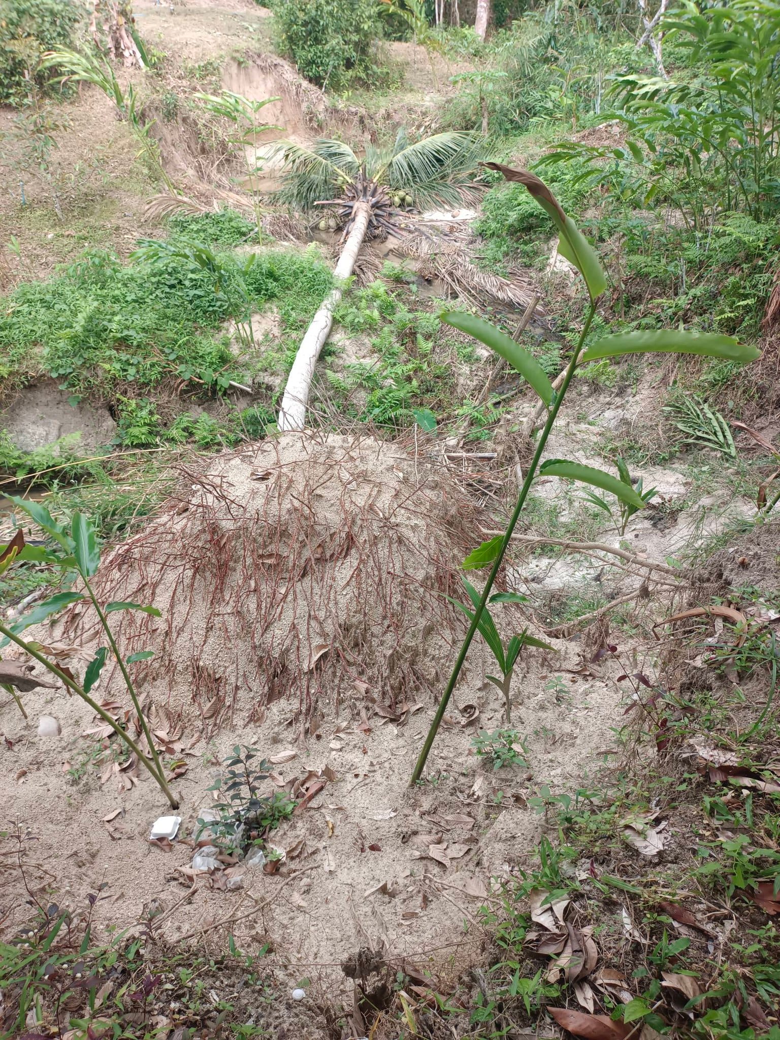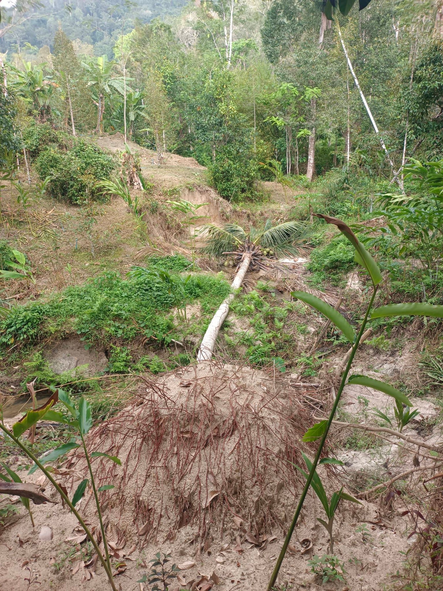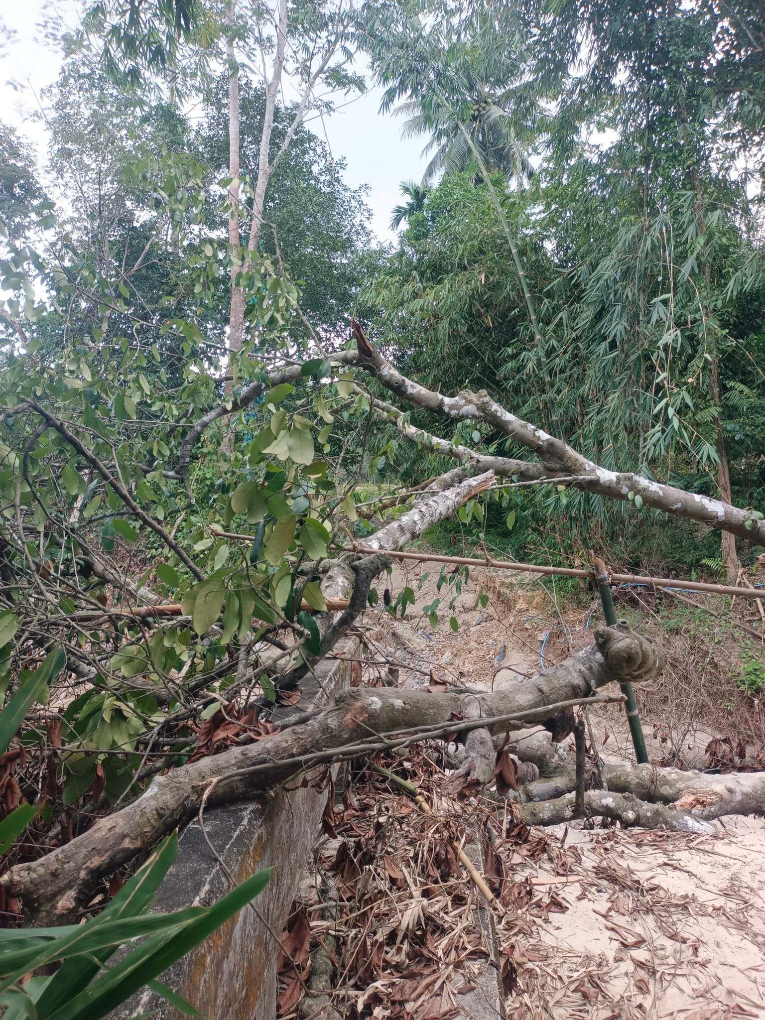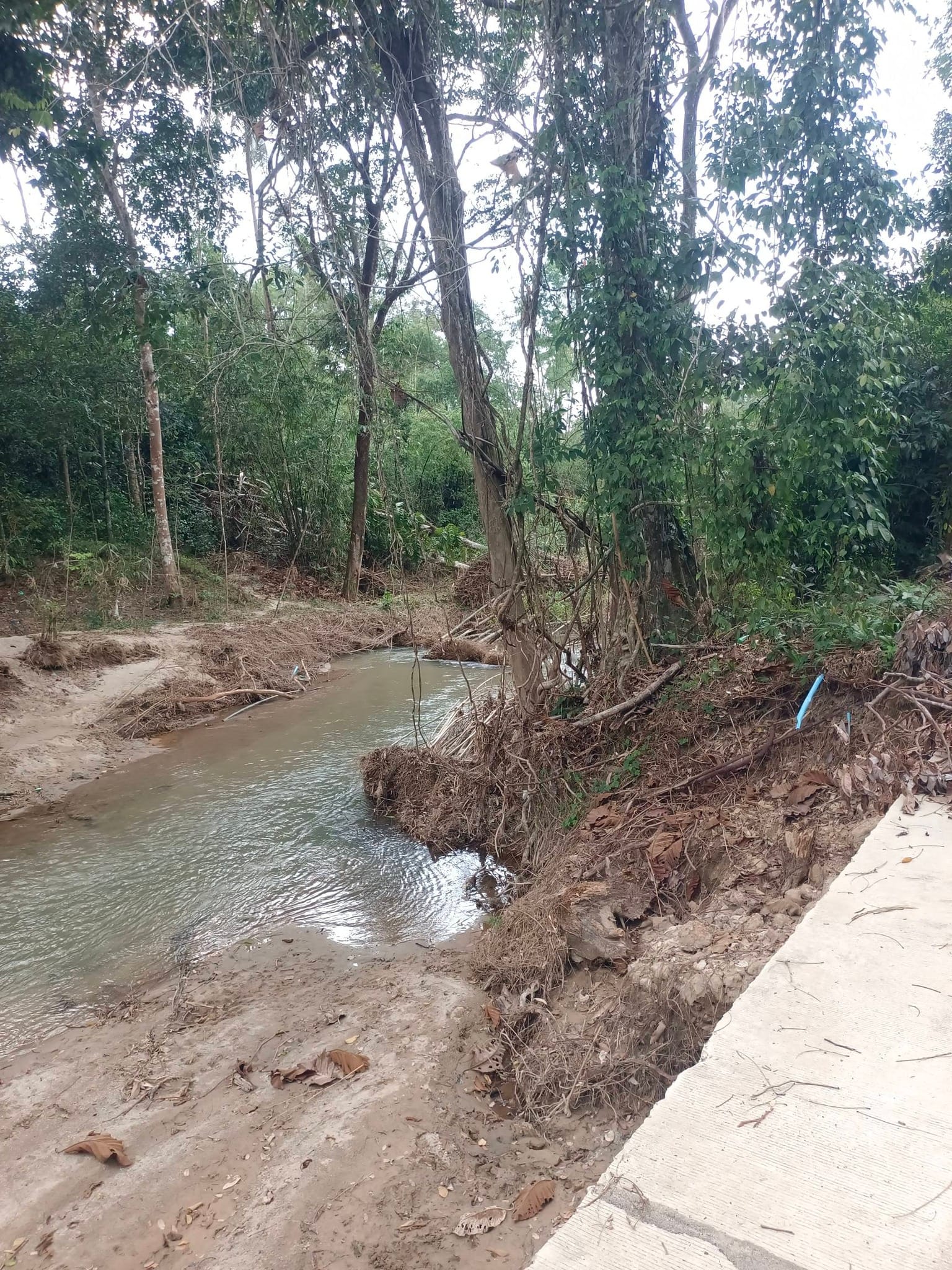 อย่างไรก็ตาม ในความสงบงามนั้น เราได้เห็นร่องรอยของความโหดร้ายจากธรรมชาติ มวลน้ำมหาศาลเมื่อปลายเดือนพฤศจิกายน 2568 ที่สร้างความเสียหายแก่เศรษฐกิจหาดใหญ่และลุ่มน้ำทะเลสาบสงขลารวมถึงหลายจังหวัดในภาคใต้ ก็ได้ทิ้งบาดแผลไว้ที่นี่เช่นกัน ต้นจำปาดะอายุกว่าร้อยปีถูกน้ำป่าพัดโค่น รวมถึงต้นไม้อื่นๆ สะพานขาด และดินถล่ม บังนีบอกเล่าว่า “อยู่ที่นี่มา 30 ปี ไม่เคยเห็นน้ำรุนแรงขนาดนี้มาก่อน”