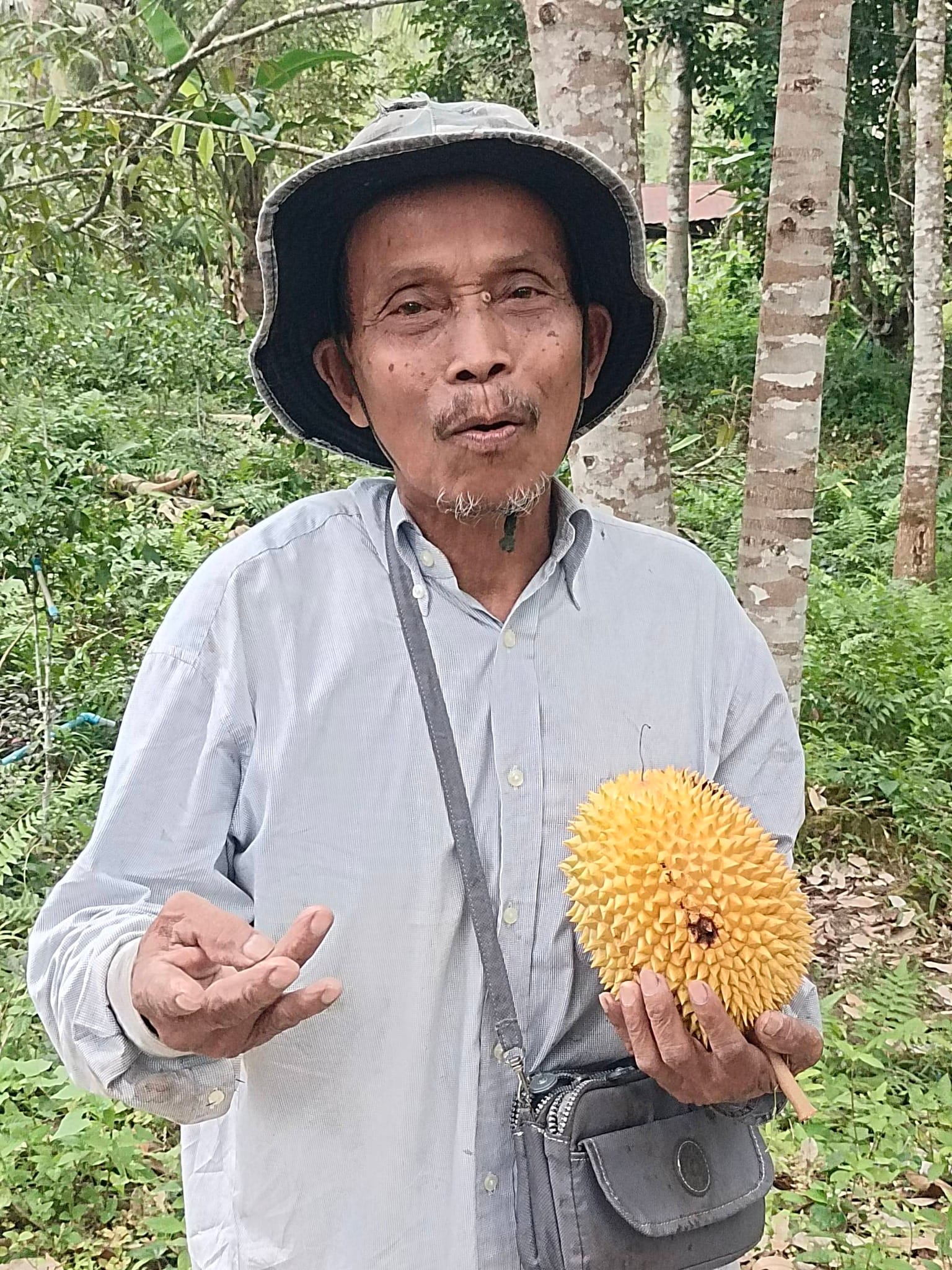 ถนนลาดยางสายเล็กเลี้ยวลดจากถนนยนตการกำธร นำพาเราผ่านดงดอกดาหลาสีแดงอมชมพูที่บานสะพรั่ง ก่อนจะเปลี่ยนเป็นถนนดินที่ยังหลงเหลือร่องรอยหลุมบ่อจากอิทธิพลของฝนกระหน่ำเมื่อปลายเดือนพฤศจิกายนปีที่ผ่านมา เราเดินเท้าต่อจนถึงบ้านไม้ใต้ถุนสูงริมคลองน้ำใสที่ไหลเย็นจนต้องลงไปสัมผัส บังนีต้อนรับเราด้วยทุเรียนบ้านต้นใหญ่ที่มีอายุกว่าสองทศวรรษ รสชาติหวานสลับจืดตามแต่ต้นที่งอกงามขึ้นมาเองจากเมล็ดที่เพื่อนบ้านกินทิ้งไว้ ซึ่งบังนีบอกอย่างมีน้ำใจว่า “ทุเรียนต้นนี้ไม่เคยขาย ใครผ่านไปมาเห็นตกอยู่ก็เก็บกินได้ตามสบาย” รอบบ้านของบังนีอุดมไปด้วยพรรณไม้ผลนานาชนิด ทั้งลองกอง ลางสาด เงาะ มังคุด และจำปาดะ สะท้อนความอุดมสมบูรณ์ของพื้นที่ป่าต้นน้ำที่เลี้ยงดูชีวิตคนในหมู่บ้านนี้มาหลายชั่วอายุคน