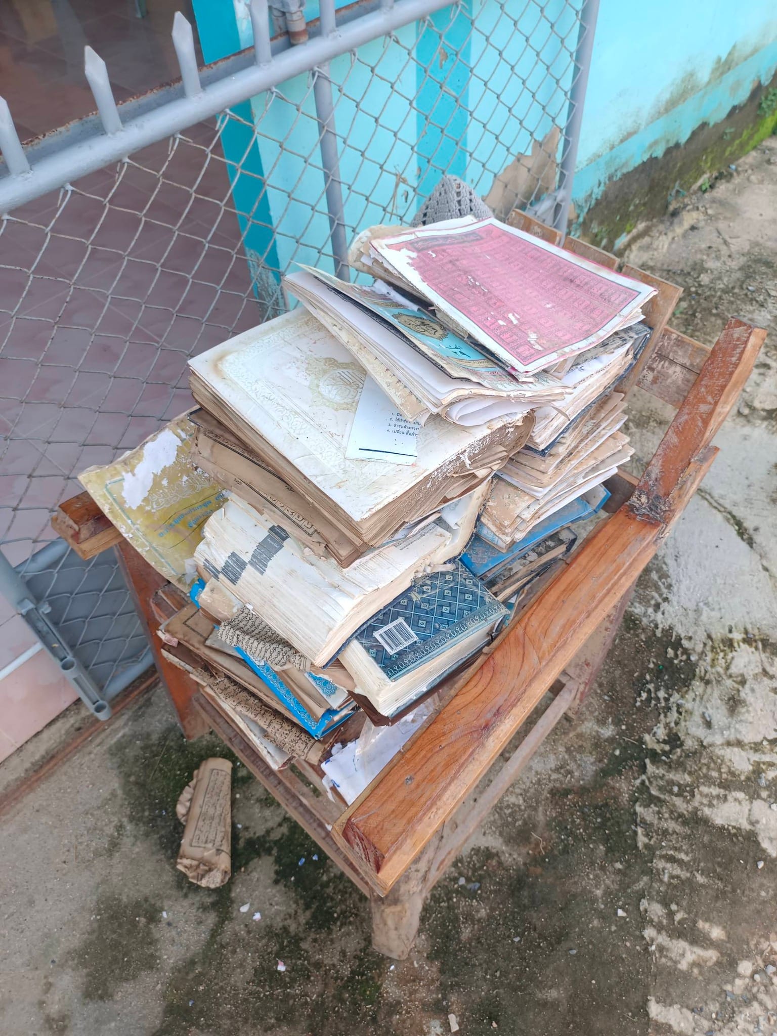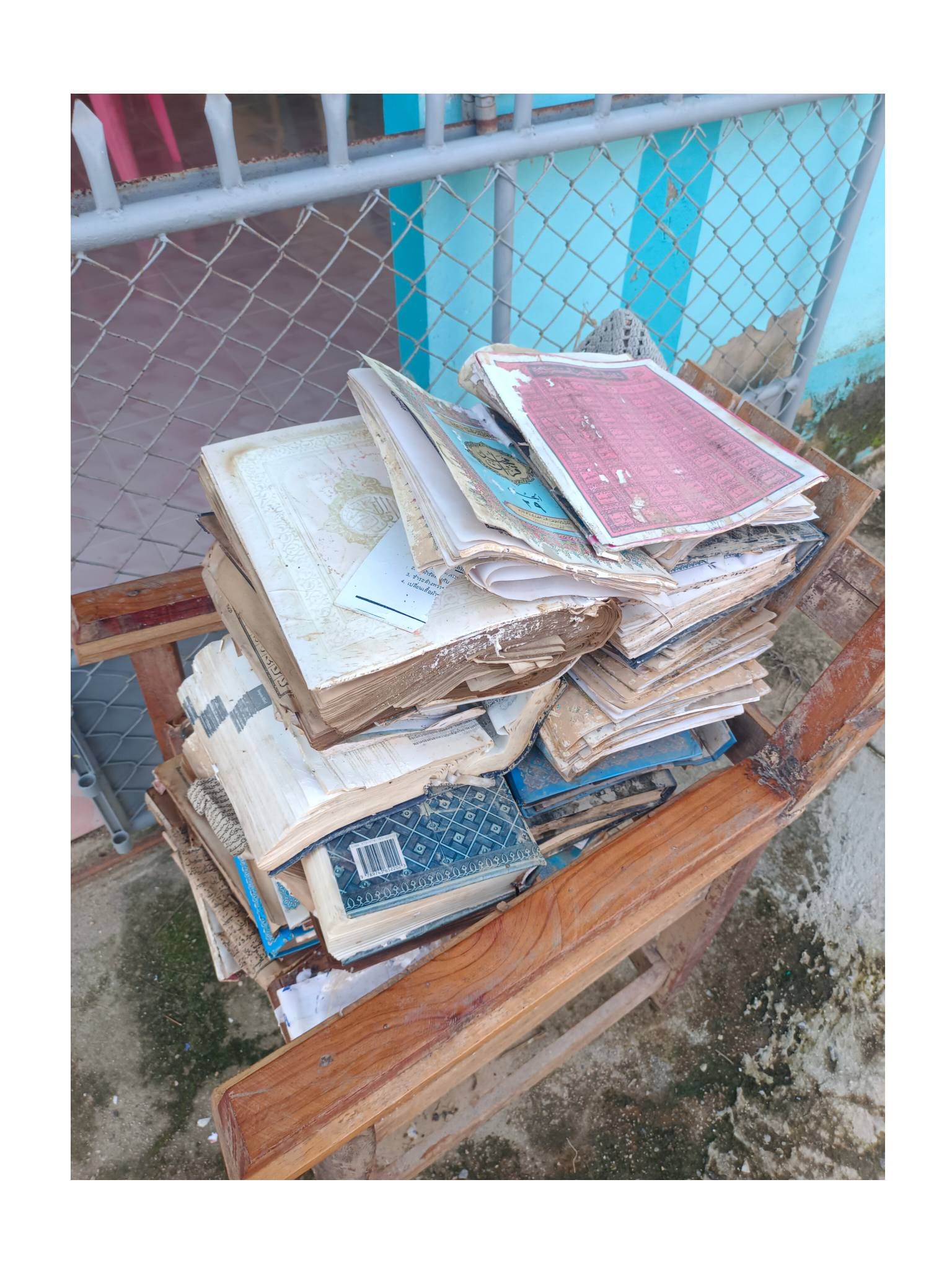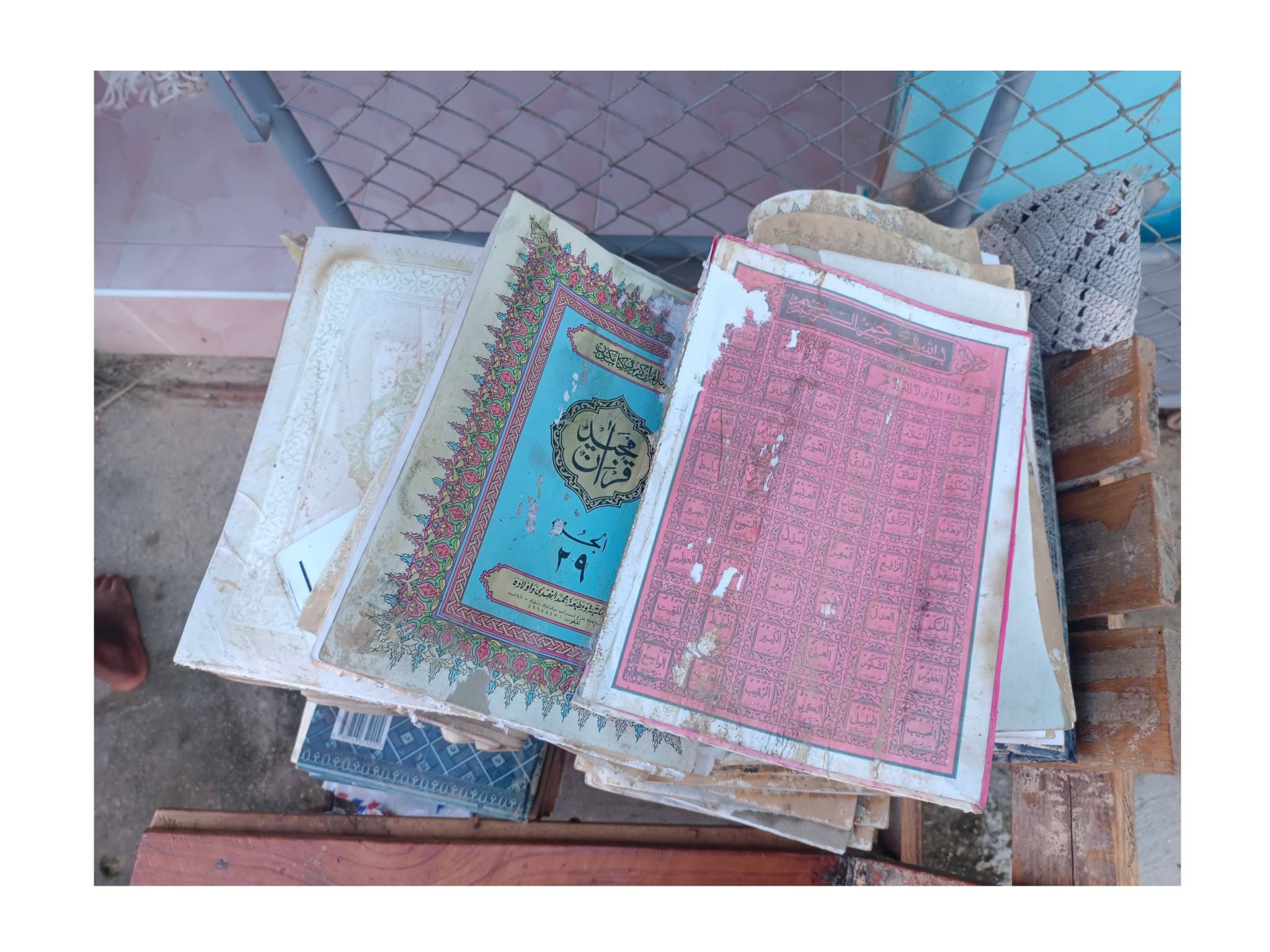 ของวากัฟ หมวกกะปิยะห์ ซายาดะห์ (ผ้าปูละหมาด) รวมถึงเสื่อและหมอนที่ญาติผู้วายชนย์อุทิศไว้เพื่อส่วนรวม ซึ่งปกติใช้รองร่างผู้เสียชีวิตขณะทำพิธีก่อนฝัง บัดนี้ถูกนำมาตากแดดหวังเพียงให้กลับมาใช้งานได้อีกครั้ง…ชะตากรรมของสัตว์เลี้ยง “งัวตายเหม็ด” (วัวตายหมด) คือถ้อยคำสั้นๆ ที่สรุปความสูญเสียทางเศรษฐกิจของหมู่บ้าน วัวนับ 40-50 ตัวต้องสังเวยชีวิตให้กับอุทกภัยครั้งนี้…