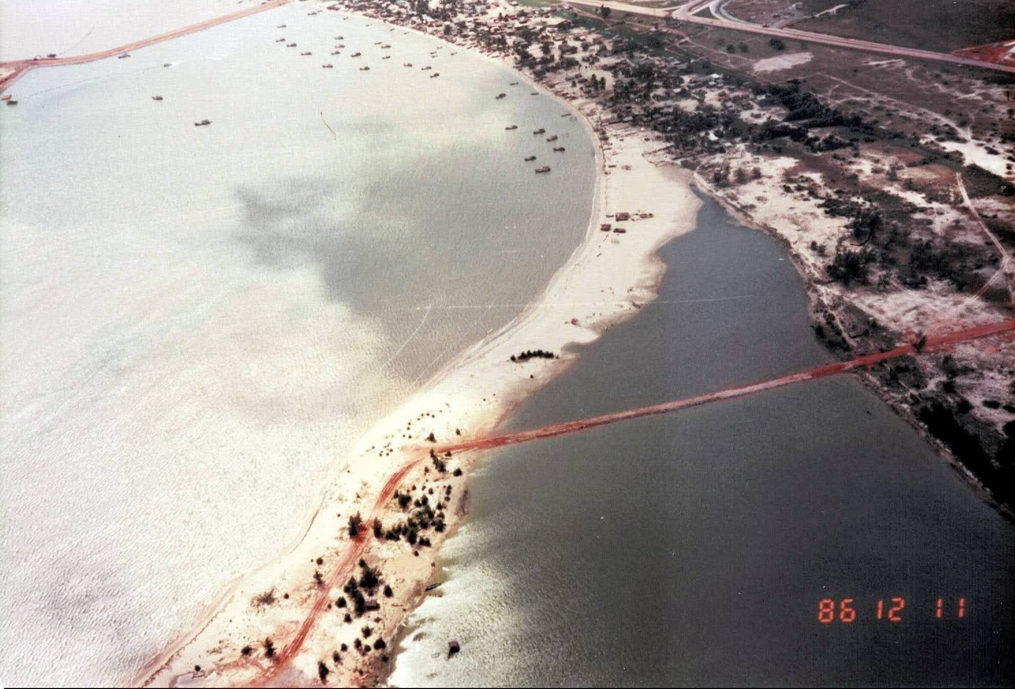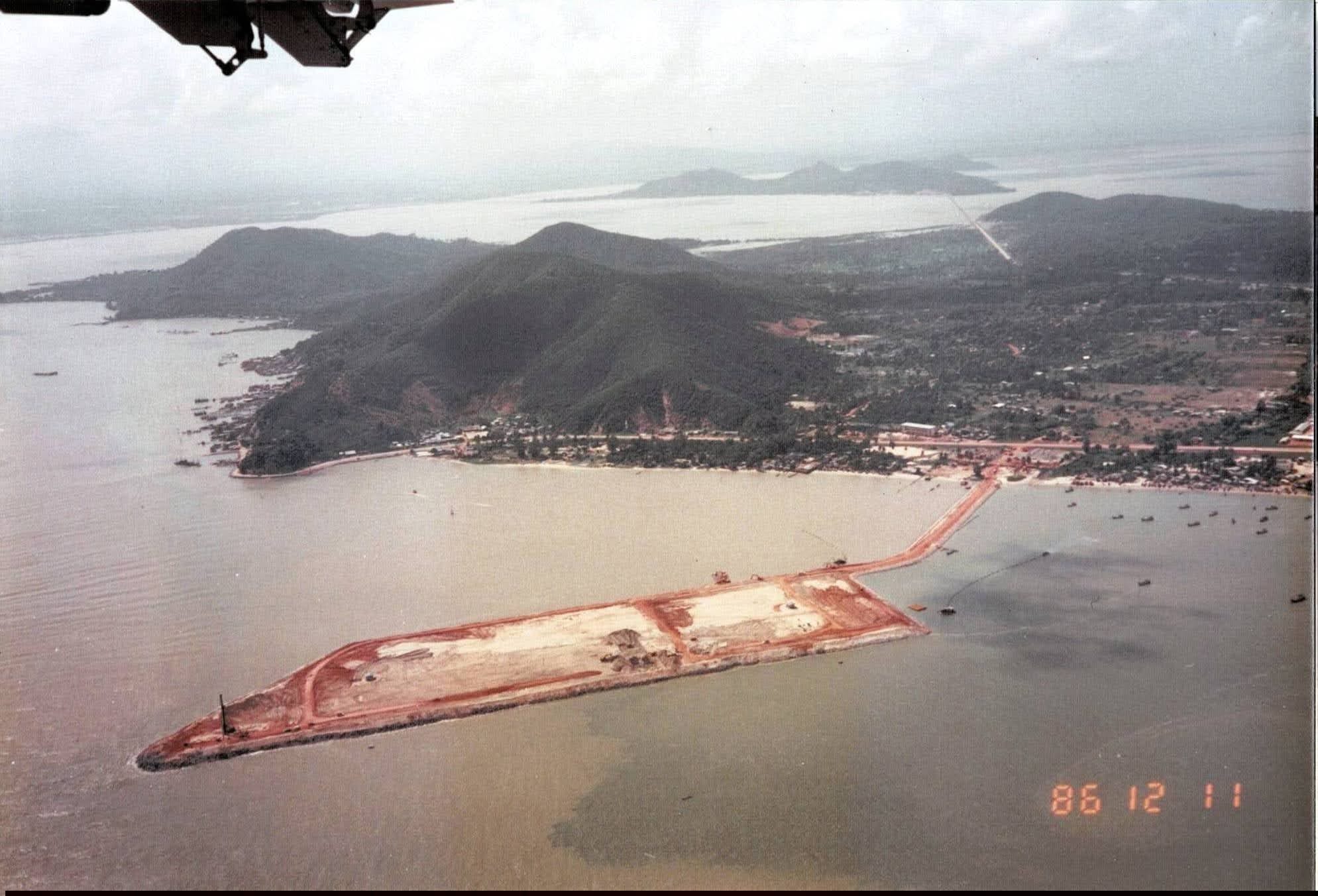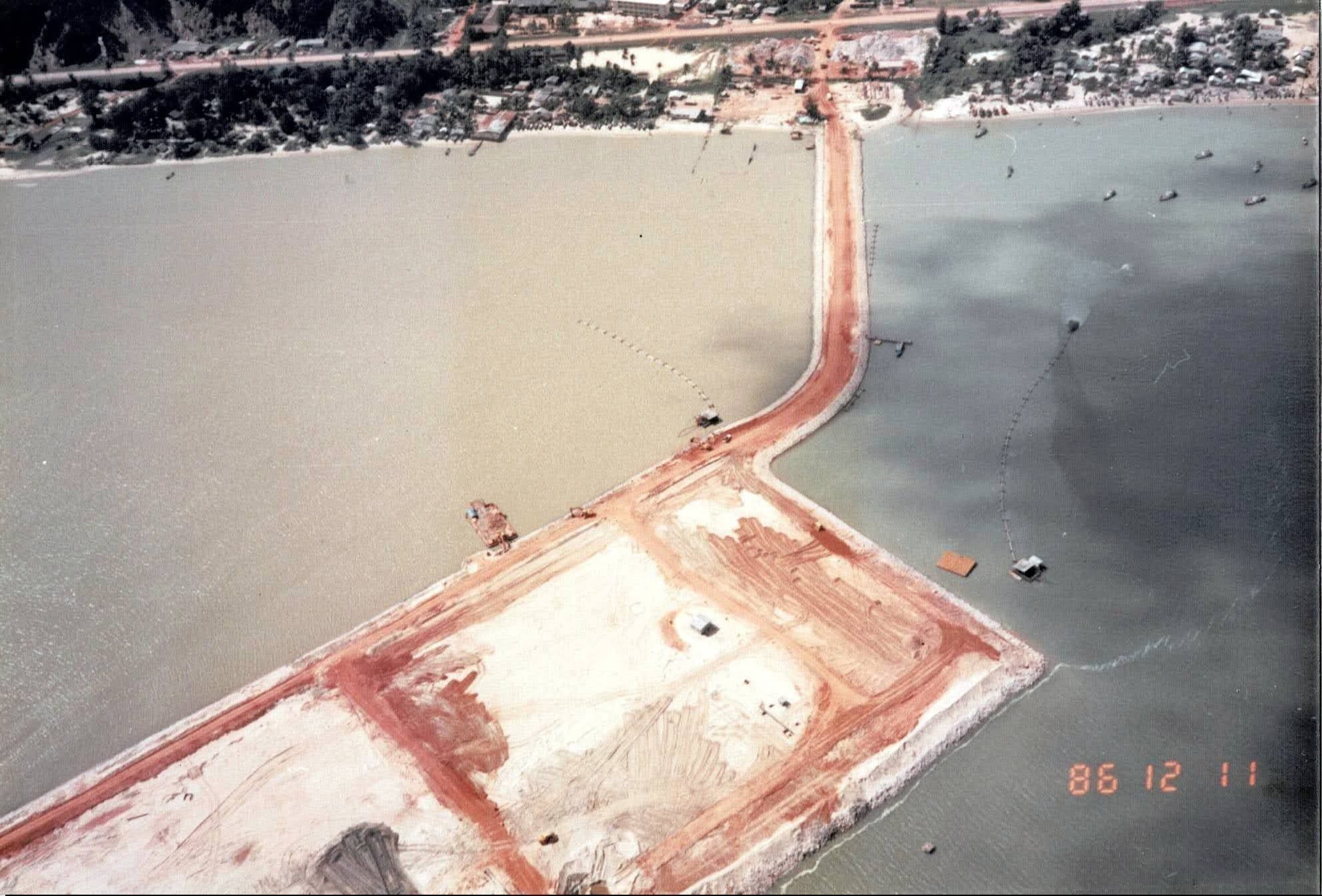 ภาพถ่ายขณะสร้างท่าเรือน้ำลึก กับ เขื่อนกั้นปากทะเลสาบสงขลาตอนล่าง
