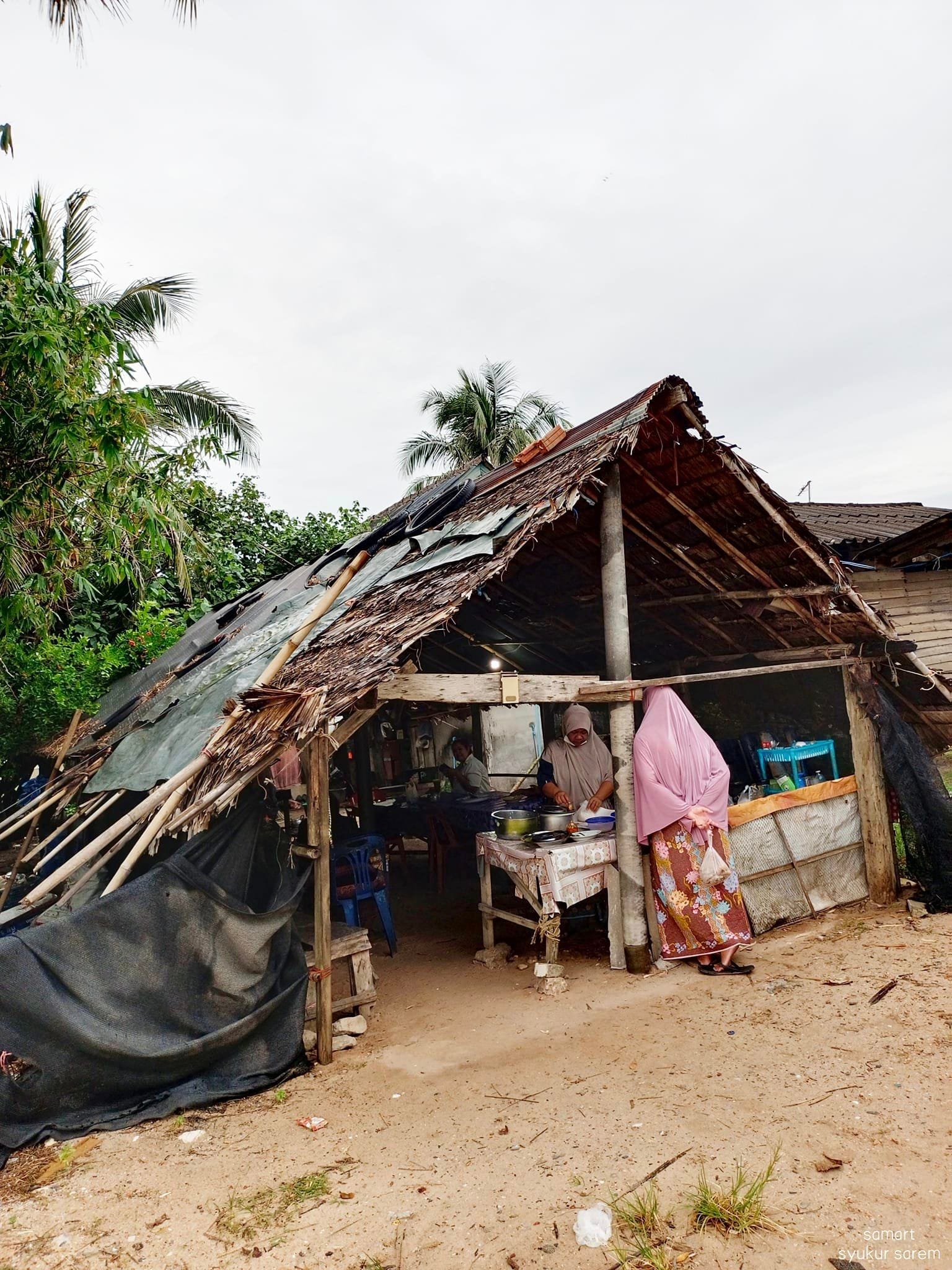 ทุกเช้าในหมู่บ้านแห่งนี้มีร้านขายข้าวหลายร้าน มีอาหารหลากหลายให้เลือกรับประทาน มีหนึ่งร้านที่ผู้เขียนรู้สึกชอบมาก คือร้านในโพสนี้ เป็นร้านเล็ก ๆ หลังคาทรงจั่วมุงด้วยใบจากสาคู พื้นของร้านคือหาดทราย ข้างในมีโต๊ะให้นั่ง เจ้าคือ “วาบ่าววาหวี” โดย วาบ่าวสามี ทำหน้าที่ชงน้ำชา ส่วนวาหวี ภรรยา ทำหน้าที่ขายข้าวยำกับข้าวแกงวันที่ผู้เขียนไปนั้น ข้าวแกงวันนี้มีแกงไก่เป็นแกงกะทิหรือที่เรียกว่า “แกงคั่ว” จะทานคู่กับน้ำชุบมะม่วงเบา