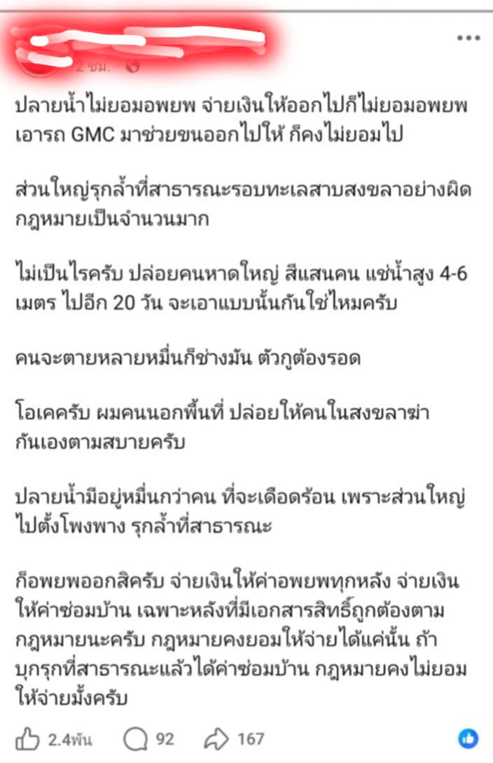 #ถึงภาครัฐ #พรรคการเมือง การแก้ปัญหาที่ยั่งยืนคือการแก้ปัญหาทั้งระบบทั้งลุ่มน้ำทะเลสาบสงขลาไม่ใช่การแก้เฉพาะจุดแค่ทำอย่างไรไม่ให้น้ำท่วมเมืองหาดใหญ่ พวกเราคนคูเต่ารับน้ำท่วมซ้ำซากทุกปี ความทุกข์นั้นมากพออยู่แล้ว อย่าให้ใครที่มองไม่เห็นหัวประชาชนมาสร้างความเข้าใจผิดซ้ำเติมพวกเราอีกเลย