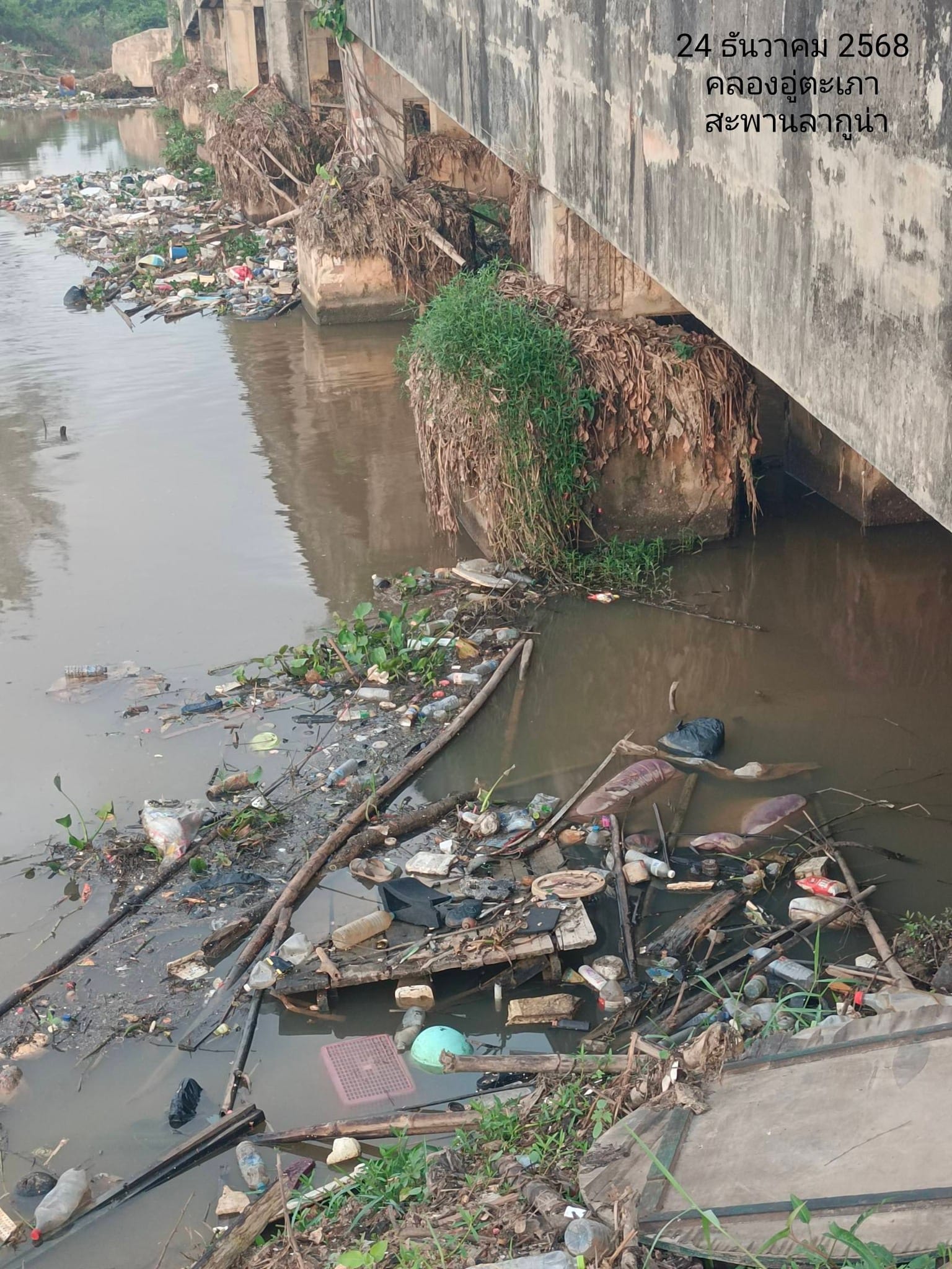 สิ่งกีดขวางทางน้ำ ขยะที่อุดตันบริเวณคอสะพานทำให้น้ำไหลไม่สะดวก