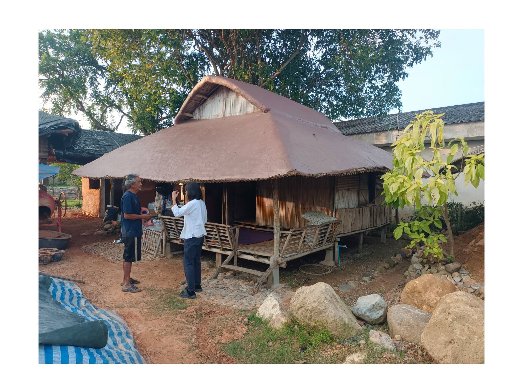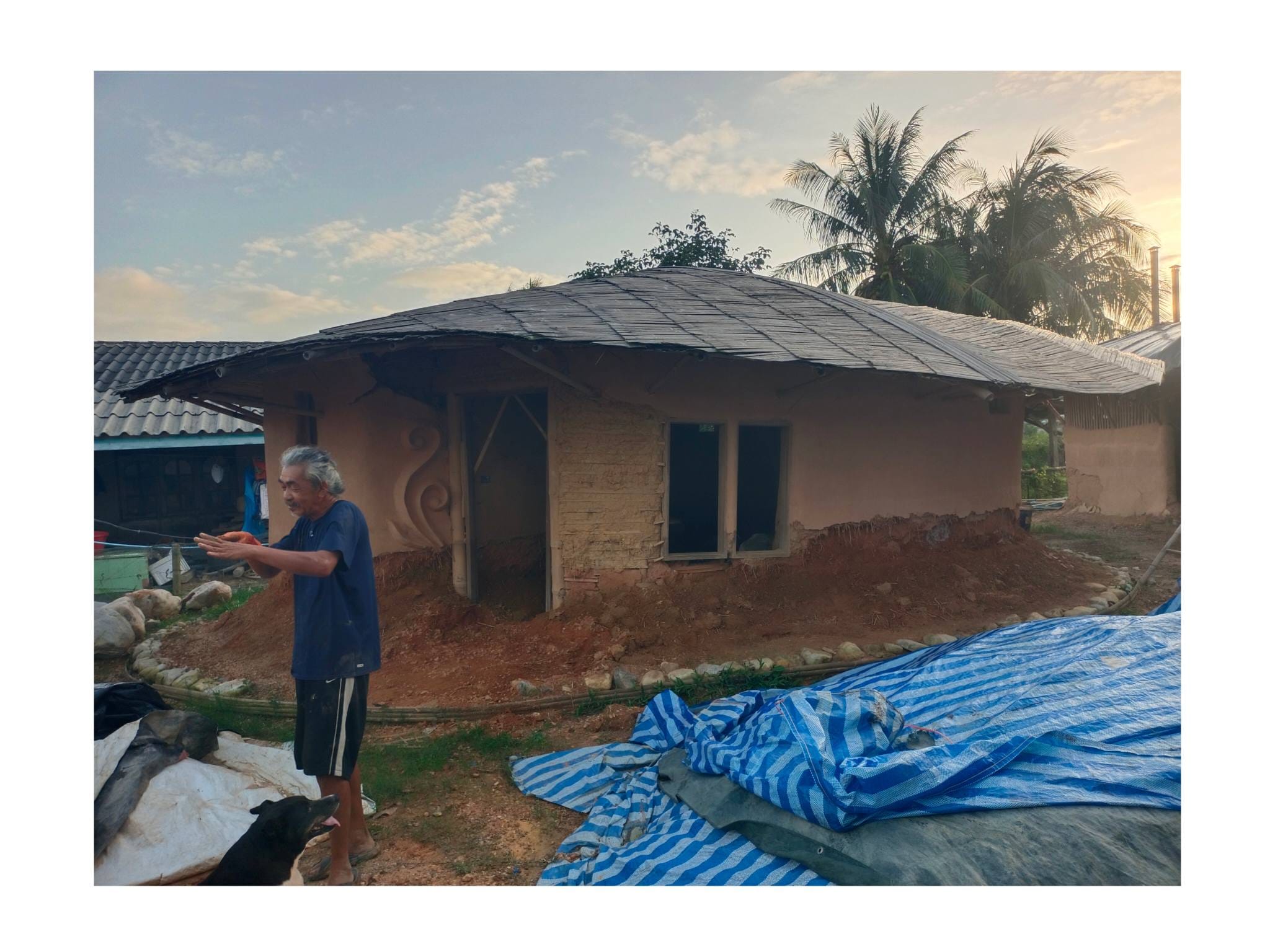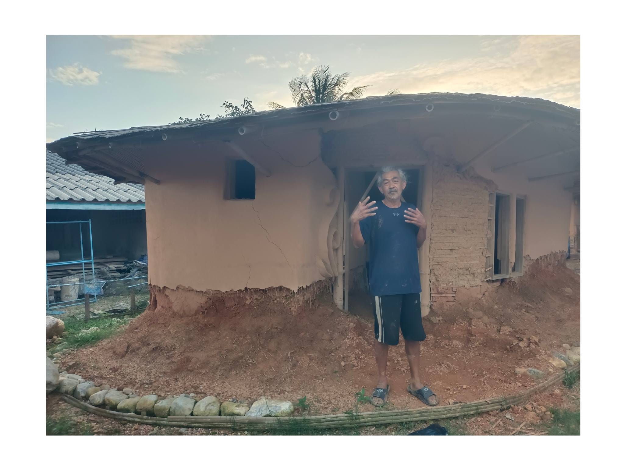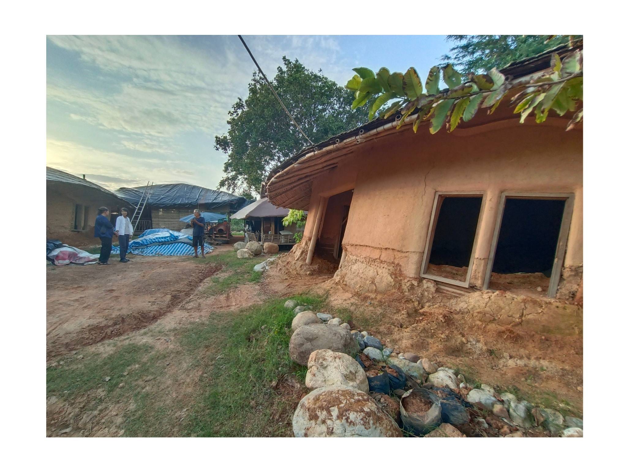 ด้วยความรู้ความเชี่ยวชาญด้านศิลปะและการทำบ้านดินของอาจารย์เก่ง ตลอด 2 ปีที่ผ่านมา ทั้งคู่จึงได้ทุ่มเทแรงกายและแรงทุนสร้างกลุ่มอาคารบ้านดินขึ้นมา โดยหวังจะให้ที่แห่งนี้เป็นมากกว่าที่อยู่อาศัย แต่เป็นทั้ง โฮมสเตย์ และ ศูนย์การเรียนรู้ เพื่อแบ่งปันวิชาบ้านดินและงานศิลปะให้แก่ผู้ที่สนใจ…”สร้างมาเกือบ 2 ปี เป็นงานแฮนด์เมดทั้งหมด มีค่าแรงช่างสะสมมาล้านกว่าบาท ทั้งหมด 3-4 หลัง ตอนนี้มึนไปหมด คิดอะไรไม่ออกเลย” ป้ากบถ่ายทอดความรู้สึกท่ามกลางซากปรักหักพังของอาคารที่ครั้งหนึ่งเคยเป็นรูปธรรมของความฝัน…