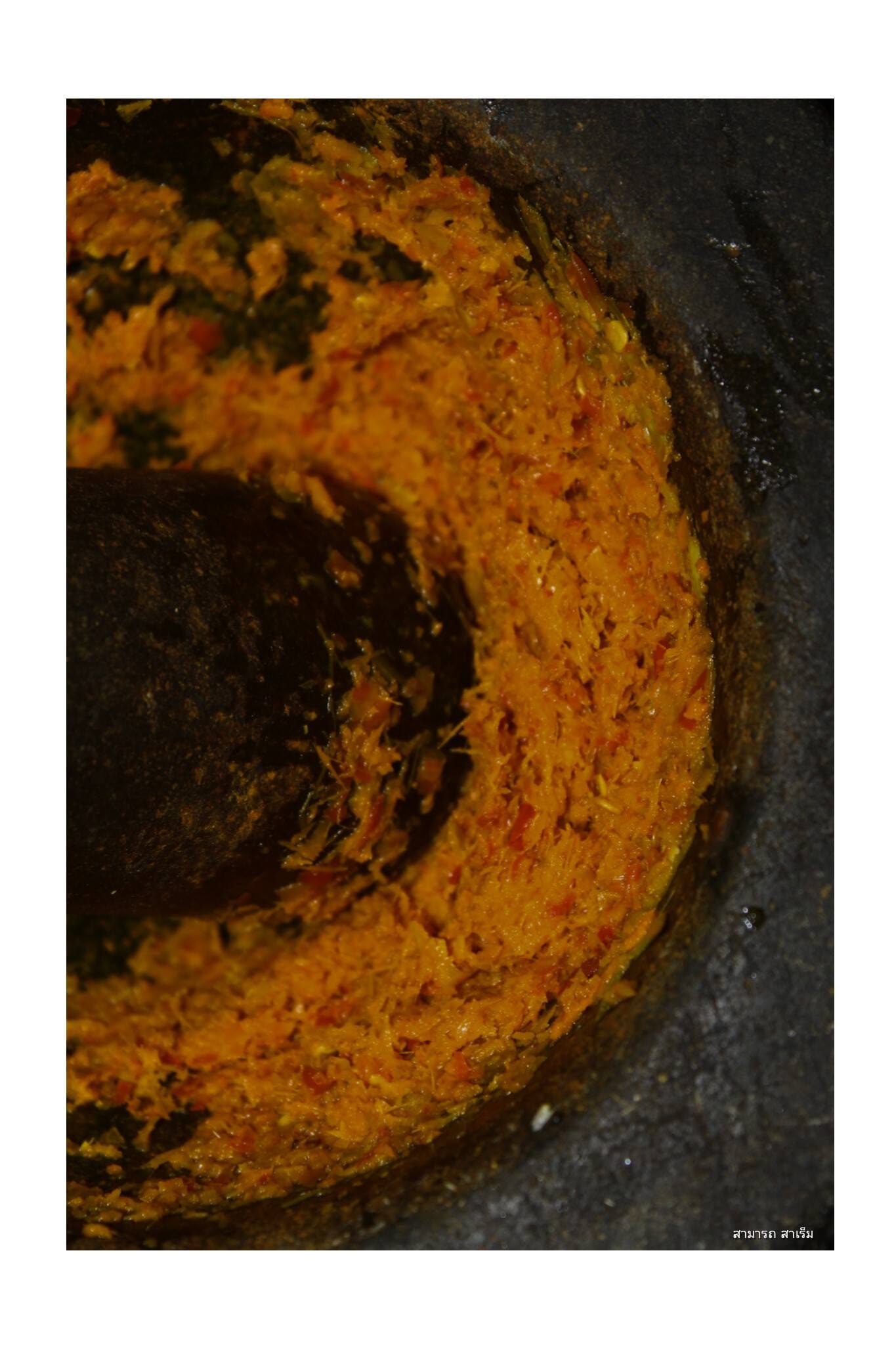 1.พริกสด (คนบ้านควนเรียก ลีปปลี ), หอมแดง, กระเทียม, ขมิ้น, เกลือ, และ กะปิ (เคย) ถูกตำจนละเอียดเป็นเนื้อเดียวกัน หากวันไหนใช้มะขามเปียกก็จะใส่ลงไปตำในครกด้วย แต่วันนี้เราเลือกใช้ “ส้มนาวบ้าน” ซึ่งในแถบนี้มีส้มนาว(มะนาว) หลากหลายสายพันธุ์ ทั้งส้มนาวแป้น ส้มนาวข้าว ส้มนาวควาย ฯลฯ โดยทำการผ่าและบีบน้ำเตรียมไว้แยกต่างหาก