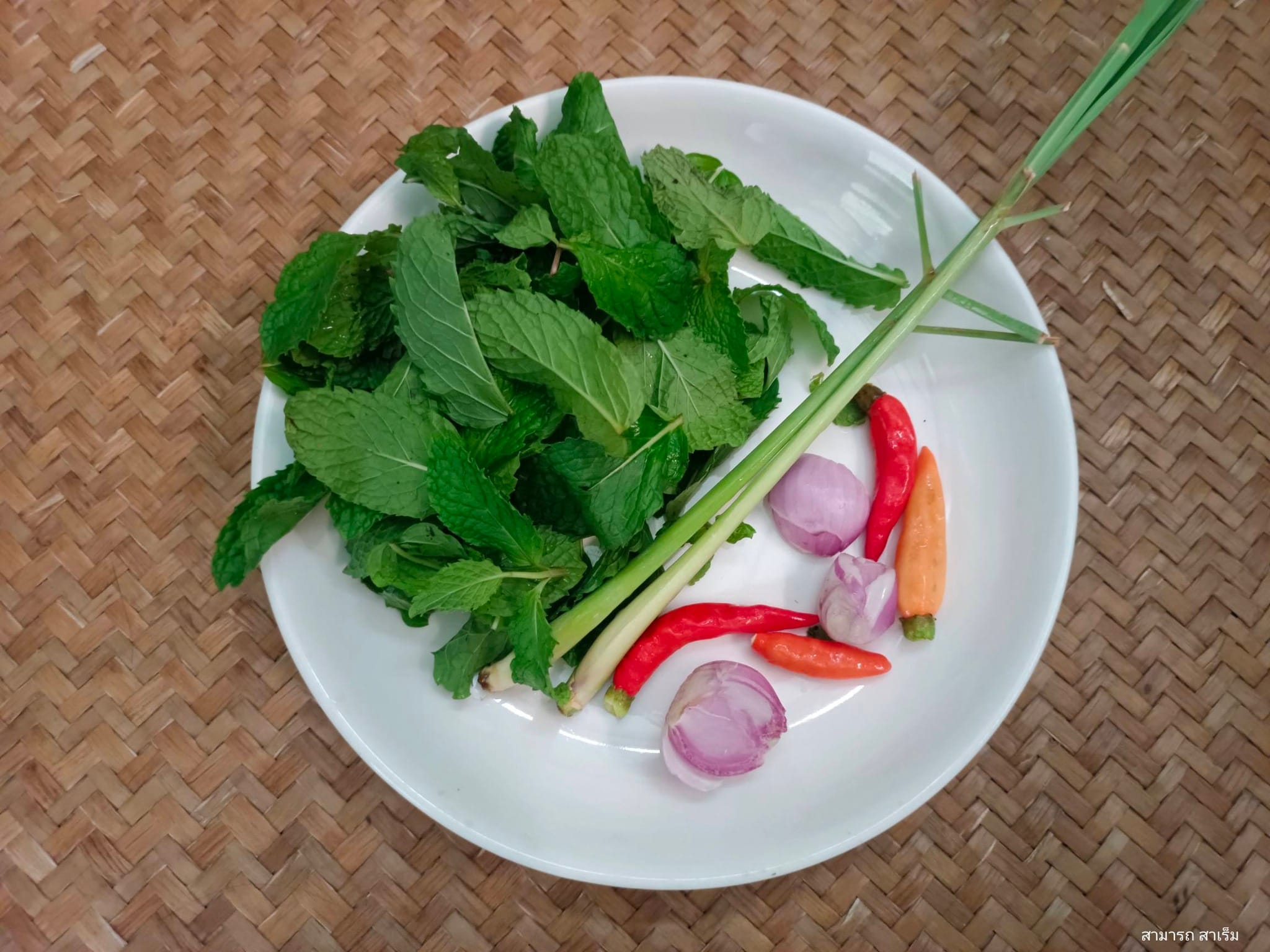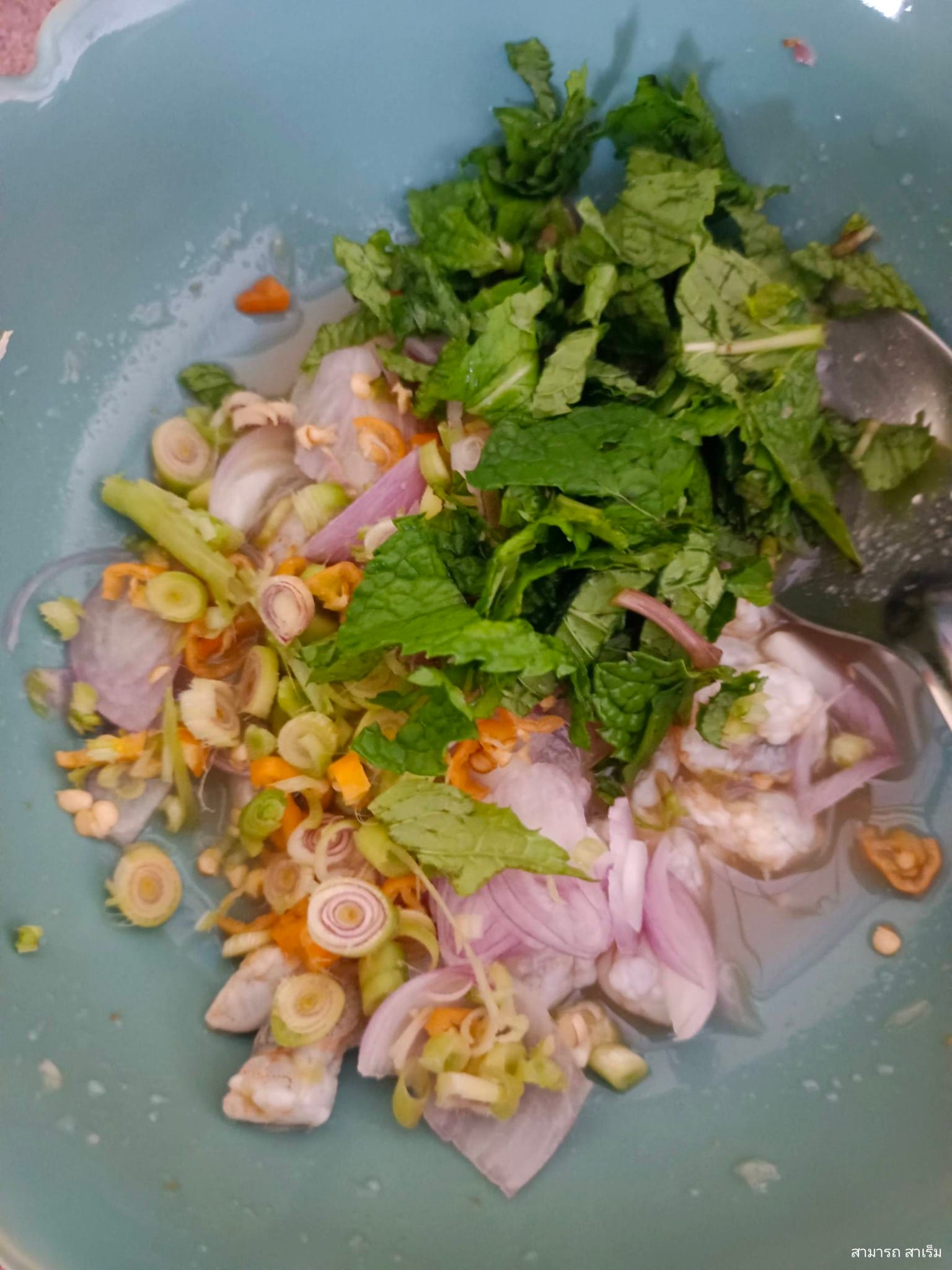 4. การสร้างกลิ่นหอม ใส่สมุนไพรซอย ได้แก่ หอมแดง ตะไคร้ และที่ขาดไม่ได้คือ ใบมะเงาะ (สะระแหน่) คลุกเคล้าให้เข้ากันเป็นขั้นตอนสุดท้าย