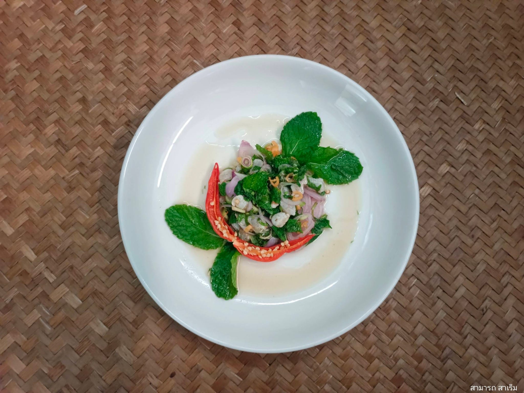 “เวาะ” ได้แบ่งปันความรู้เกี่ยวกับเมนูยำปลาดิบและกุ้งดิบแบบสูตรในครัวของท่าน โดยเฉพาะคำแนะนำให้ลองทำยำ “ปลาหลุมโปย” ซึ่งเป็นปลาท้องถิ่นที่มีลักษณะคล้ายปลาตะลุมพุก แต่สิ่งที่น่าสนใจยิ่งกว่าชนิดของเนื้อสัตว์ คือองค์ประกอบสำคัญที่ชาวบ้านบ่อตรุเรียกว่า “ใบมะเงาะ” ผมได้ยินก็ไม่รู้จัก สอบถามกัลญานมิตรในเฟสบุ๊คจึงได้ความรู้ว่า ใบมะเงาะ แท้จริงแล้วคือ “สะระแหน่”