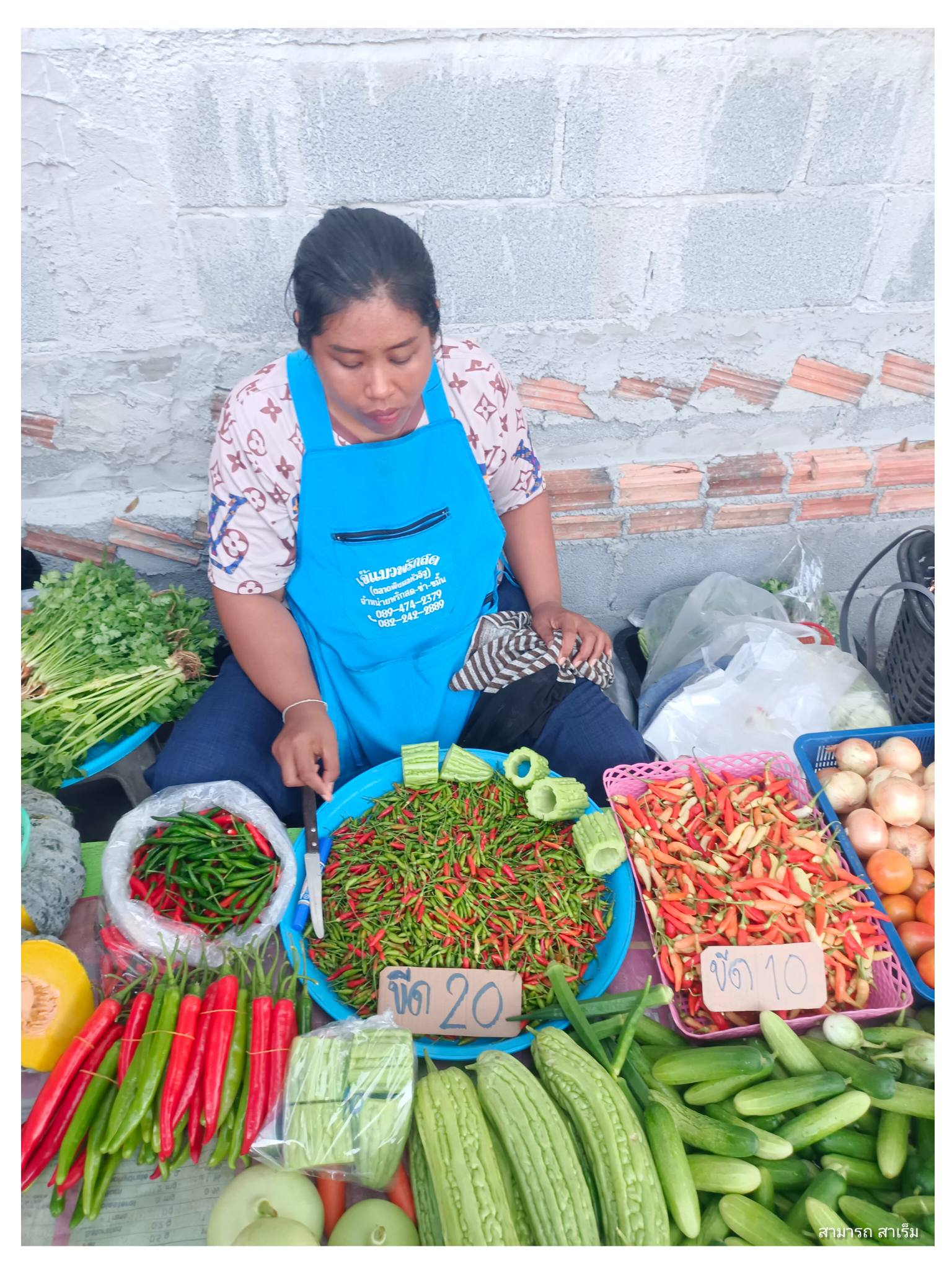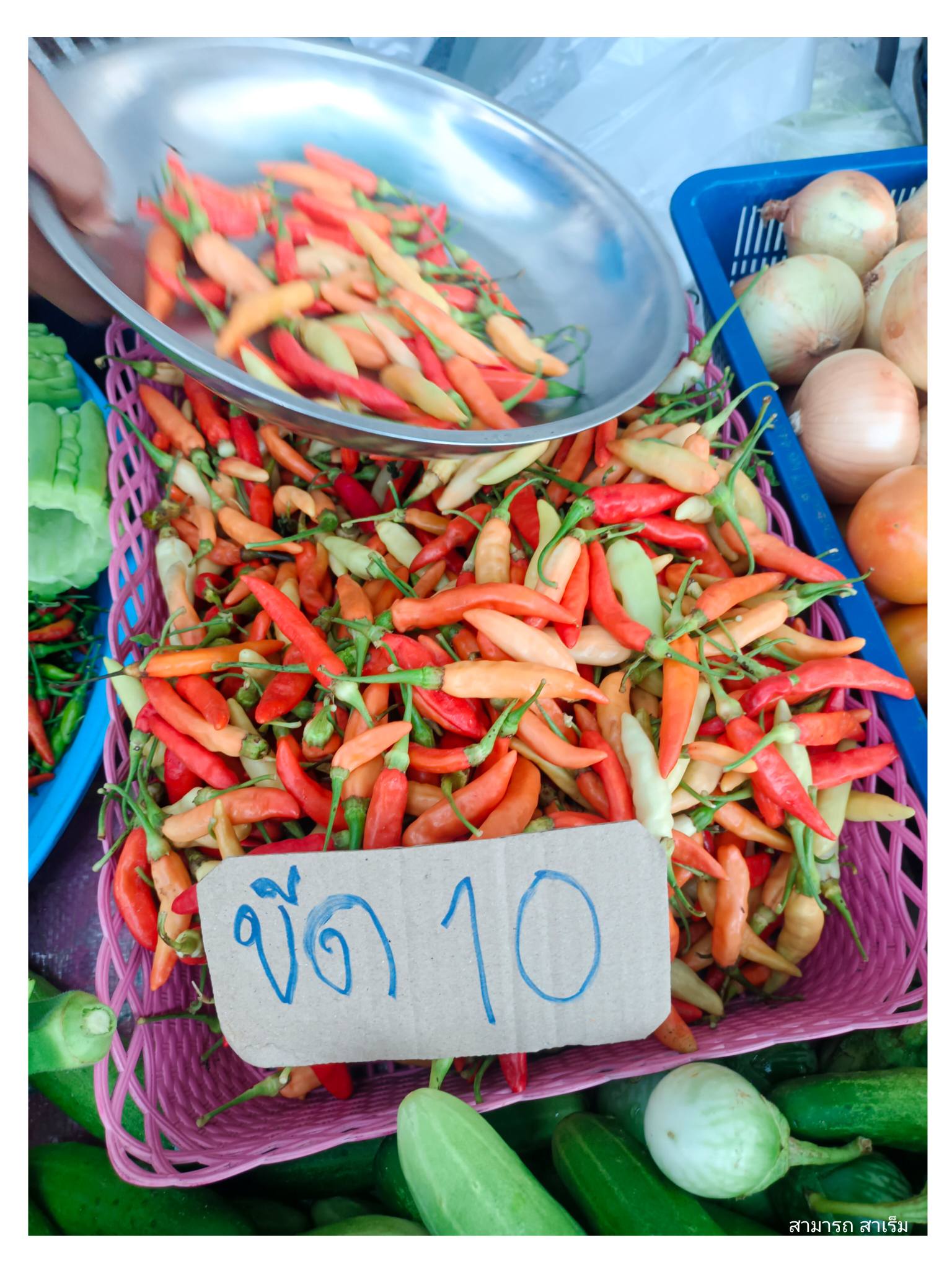 แม่ค้าชาวนครศรีธรรมราชบอกเล่าด้วยความภูมิใจว่า นี่คือ “ดีปลีชีบ้านเรา” ซึ่งหมายถึงพริกที่ปลูกในพื้นที่จังหวัดนครศรีธรรมราช เมื่อไต่ถามลึกลงไปจึงทราบว่า เป็นผลผลิตจากตำบลท่าเรือ ซึ่งตั้งอยู่ห่างจากวัดพระมหาธาตุวรมหาวิหารไปทางทิศใต้ราว 10 กิโลเมตร ช่วงนี้เป็นช่วงที่พริกออกผลผลิตรอบแรก ขนาดของเม็ดจึงดูอวบใหญ่เป็นพิเศษ ทว่าแม่ค้ายืนยันด้วยเสียงผสมหัวเราะและรอยยิ้มว่า “เม็ดใหญ่หรือเม็ดเล็ก ความเผ็ดเท่ากัน”