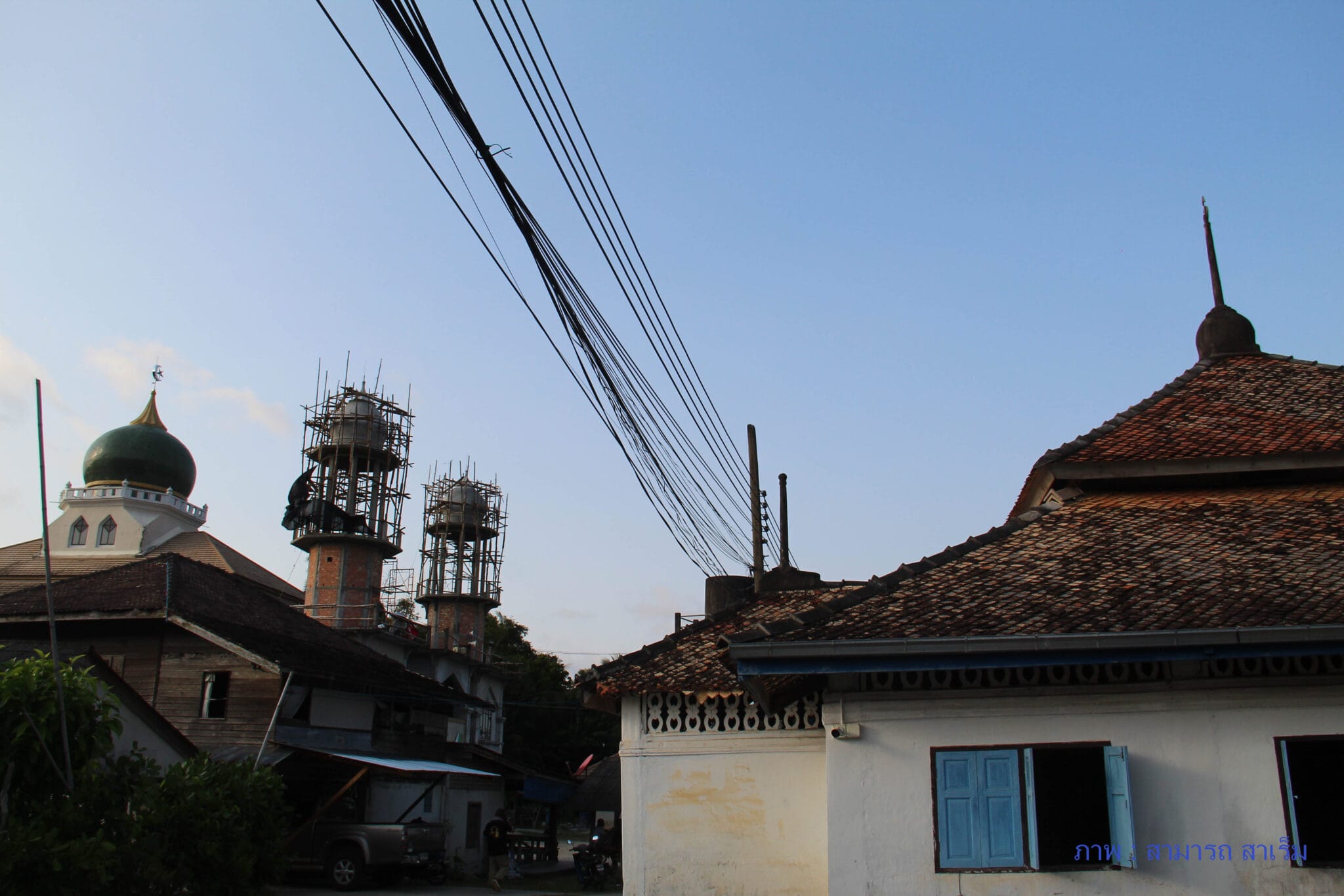 ทางขวามัสยิดหลังใหม่ของบ้านทรายขาวกำลังก่อสร้าง โดยโดมของมัสยิดเอามาจากมัสยิดกลางปัตตานี ทางขวาคือสุเหร่าหลังเดิมตั้งห่างกันประมาณ ๒๐๐ เมตร