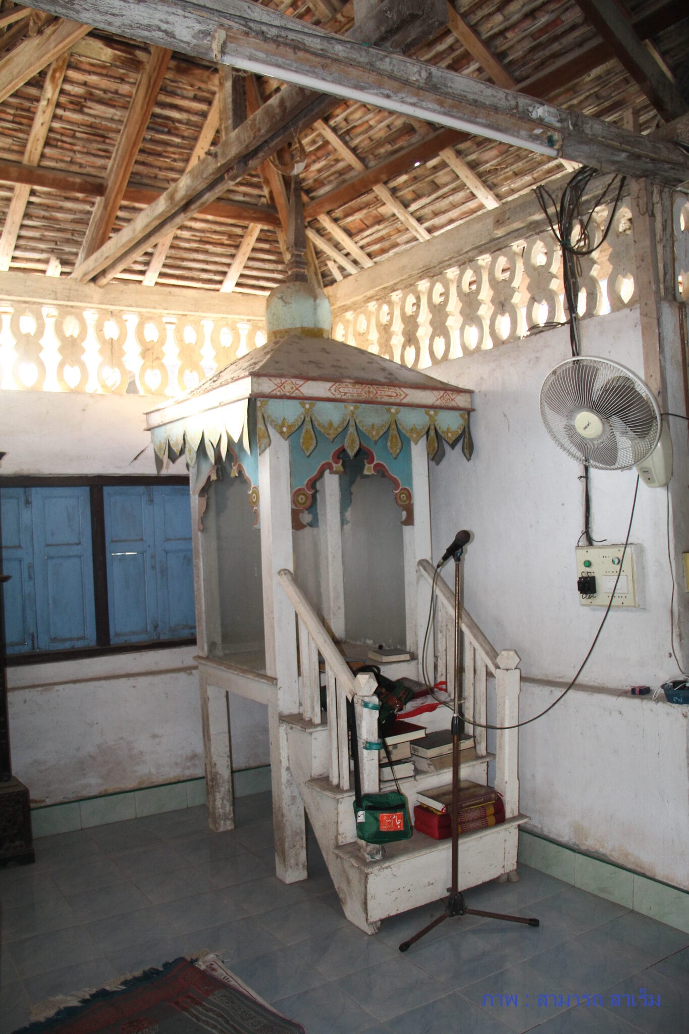 มิมบัร (ธรรมมาสน์) สำหรับใช้ขึ้นไปเทศนาในช่วงของการละหมาดวันศุกร์ หลังคาทำจากสังกะสีทรงพีรามิตบนยอดมีโดมเล็ก ๆ มีไม้ทำเป็นสัญลักษณ์ดวงจันทร์เสี้ยว แนวชายคาทั้งสี่ด้านตกแต่งเป็นรูปทรงคล้ายอุบะเขียนลาย ลวดลายที่ปรากฎเป็นลวดลายเดียวกับที่พบในบุษบก (นมพระ) บนเรือพระของคนไทยพุทธในพื้นที่สำหรับใช้ลากพระพุทธรูปในวันแรม ๑ ค่ำ เดือน ๑๑ ซุ้มทั้งสี่ด้านตกแต่งด้วยสังกะสีมีลักษณะคล้ายกับผ้าม่าน มีบันไดทางขึ้นข้ามขั้น