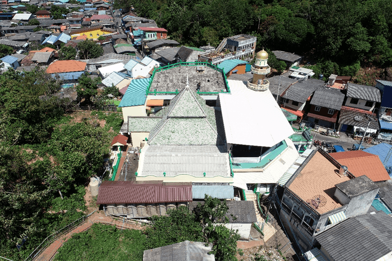 ภาพสุเหร่าบ้านทรายขาวหรือมัสยิดร่อมันอับยาด มุมซ้ายส่วนที่ยื่นออกมคือเมี๊ยะรอบ สำหรับให้โต๊ะอีหม่ามยืนนำสะมะหยัง (ละหมาด) มิมบัร ( ธรรมมาสน์) จะตั้งอยู่ในช่องเมี๊ยะรอบเช่นกัน ทางขวาคือนาซะ อาคารขวางสำหรับใช้เป็นพื้นที่เรียนความรู้ทางศาสนาและทำบุญ