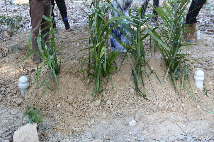 การปักกิ่งไม้บนหลุมฝังศพที่เพิ่งทำพิธีฝังใหม่ ๆ ในภาพเป็นวิธีการปักแบบคนเเขกลุ่มทะเลสาบสงขลา ที่จะปักกิ่งไม้ไว้ทั่วทั้งหลุม ไม่ได้ปักเพียงหัวกับท้าย ถ่ายภาพที่กูโบร์ใหญ่ บ้านควน ต.คูเต่า อ.หาดใหญ่ จ.สงขลา