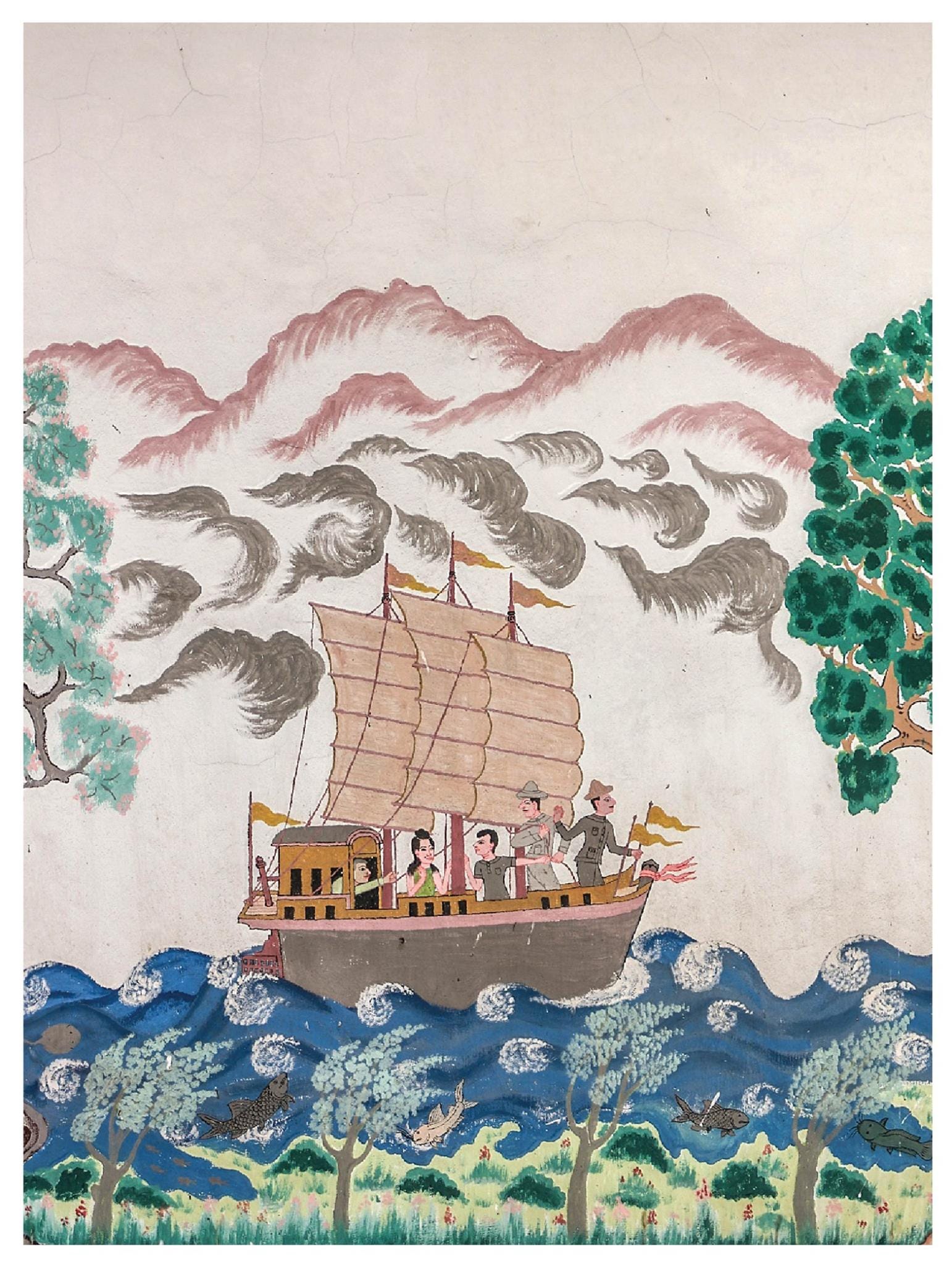 พระนางเหมชาลา และเจ้าชายทนธกุมารโดยสารเรือสำเภาพ่อค้า ใช้ใบแล่นไปยังลังกาตามคำของพระบิดา ในระหว่างเรือลอยลำอยู่ในทะเลนั้น พายุก็ตั้งเค้า ท้องฟ้าก็มืดครึ้ม